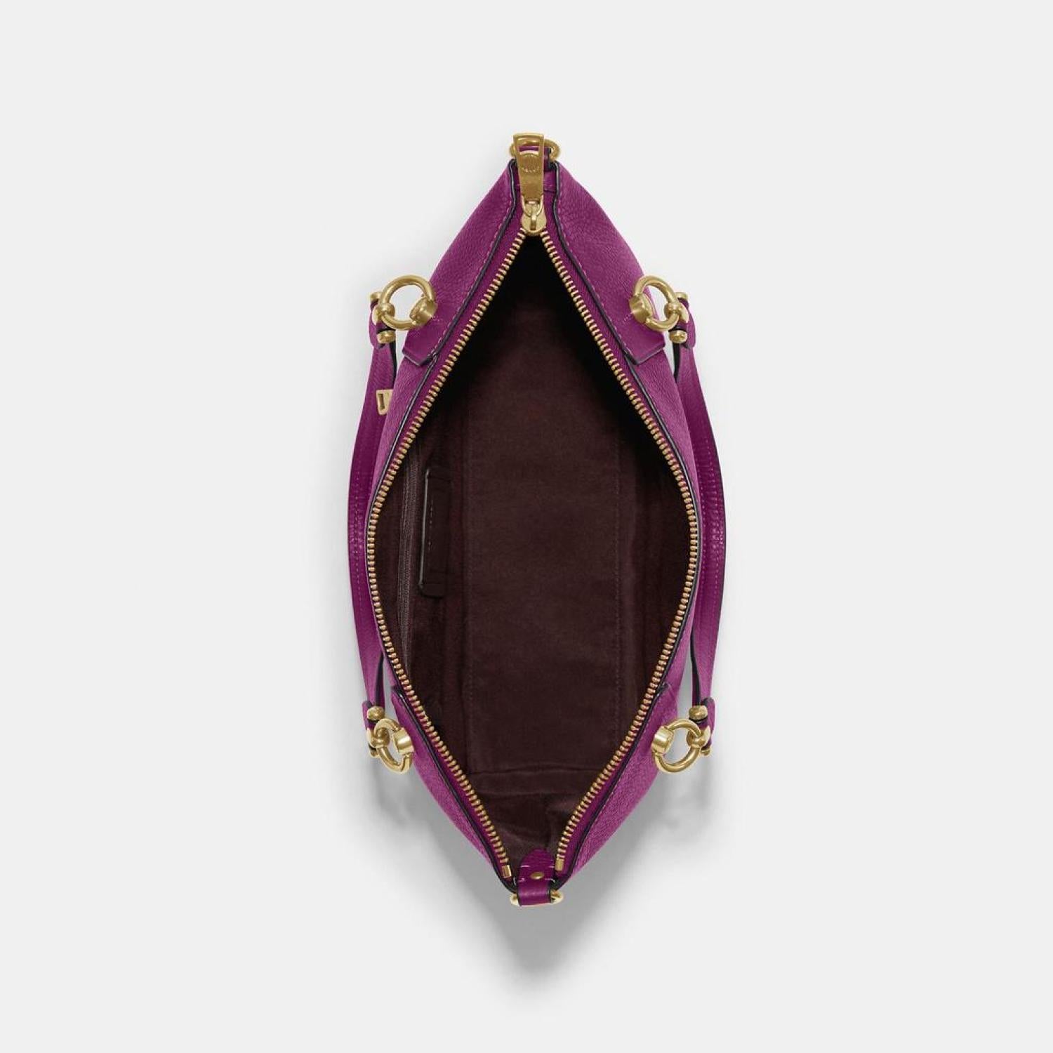 Refined pebble leather Inside zip pocket Zip-top closure fabric lining Handles with 5 drop Outside zip pocket Detachable strap with 22 drop for shoulder or crossbody wear 10 (L) x 8 1/2 (H) x 3 3/4 (W) Style No. C6229
