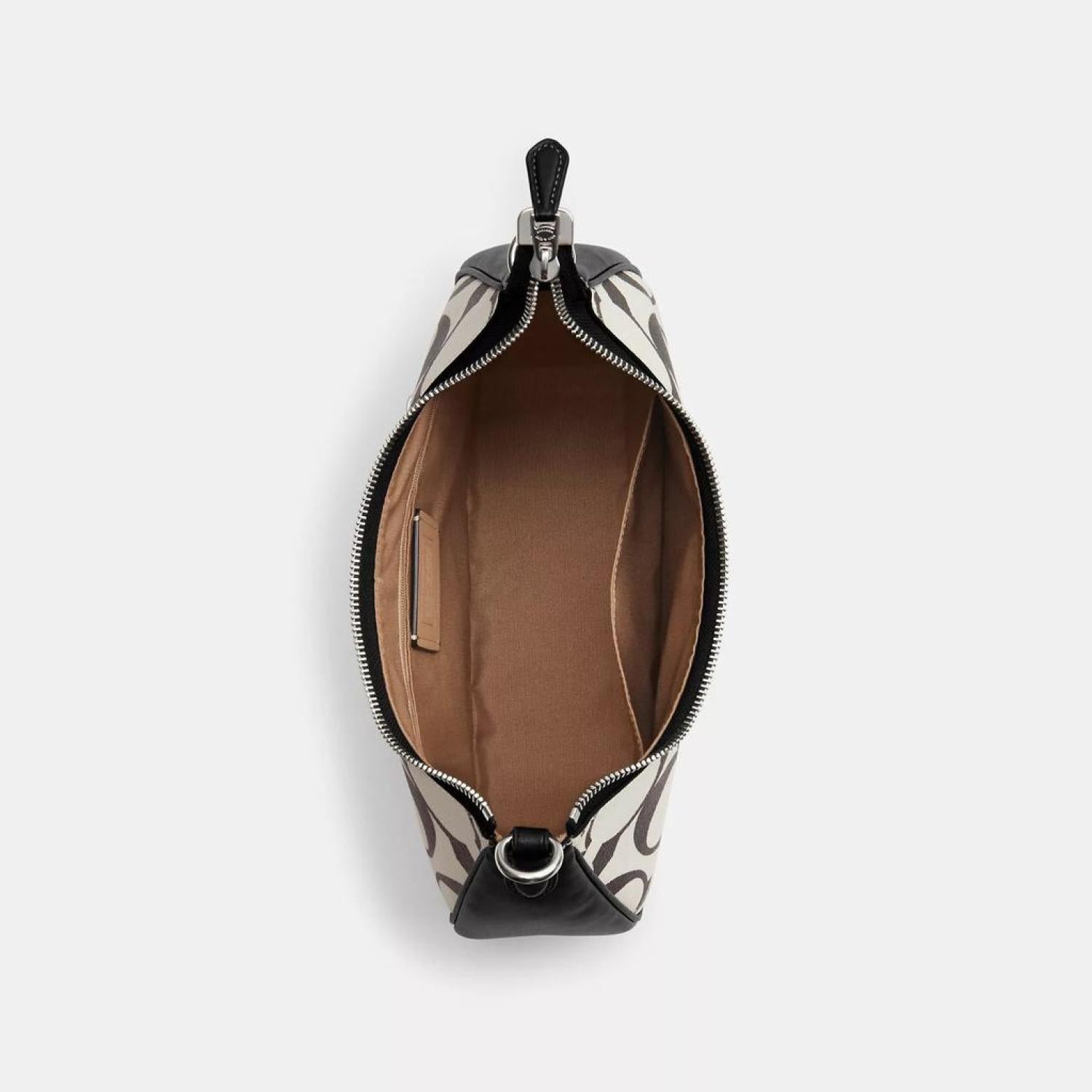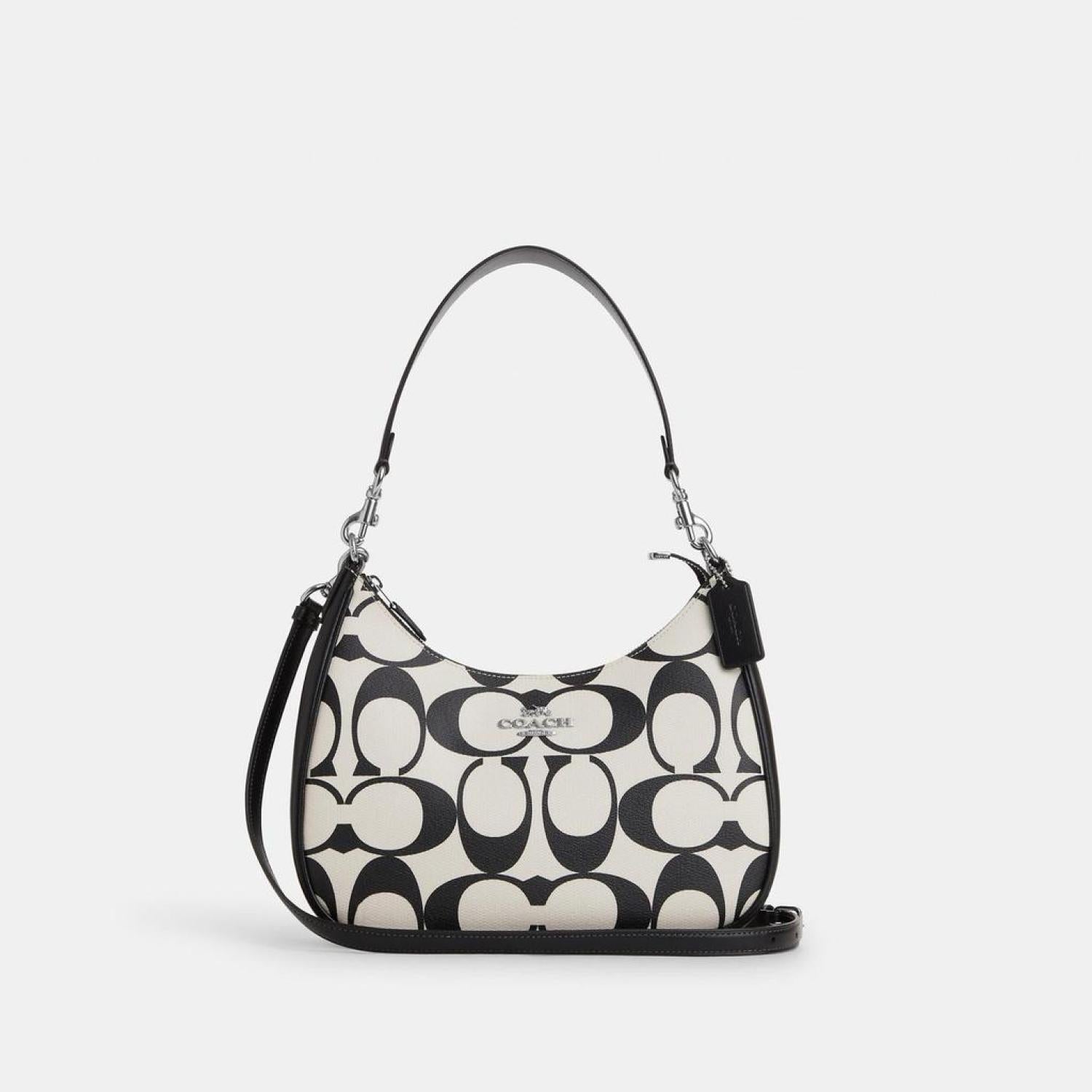 • Signature coated canvas and smooth leather Inside zip and multifunction pockets Zip-top closure fabric lining Detachable handle with 11 drop Outside zip pocket Detachable strap with 22 drop for shoulder or crossbody wear 11 1/2 (L) x 9 1/4 (H) x 3 1/2 (W) Style No. CP065 | Coach Outlet Teri Hobo In Signature Canvas - White