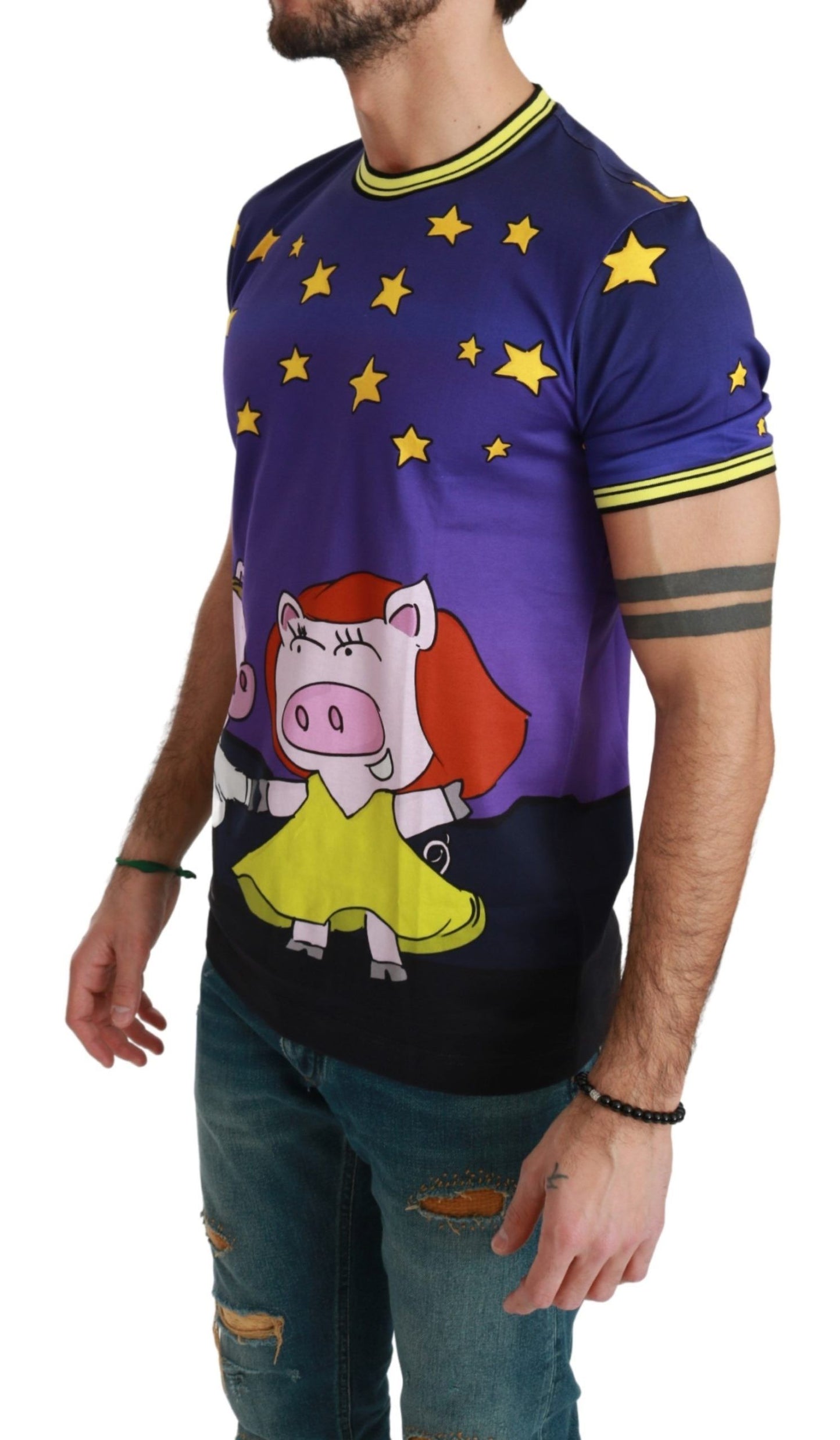 Enrich your wardrobe with the playful charm of this Purple Cotton T-Shirt from the esteemed house of Dolce & Gabbana. Exuding casual elegance, the shirt features a whimsical 2019 Year of the Pig, Mister Pig motif for a touch of uniqueness. Its round neck and short sleeve design coupled with a regular fit ensure classic comfort.