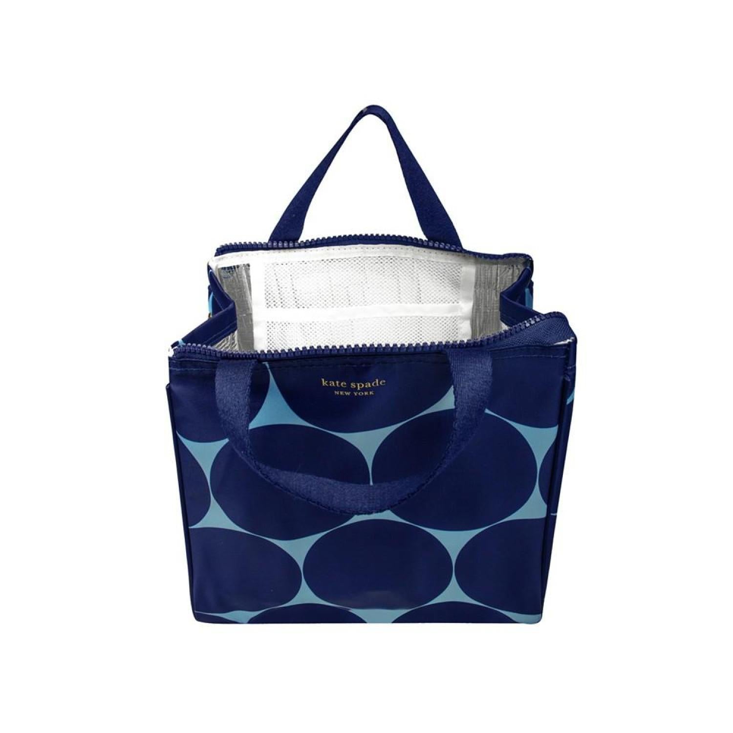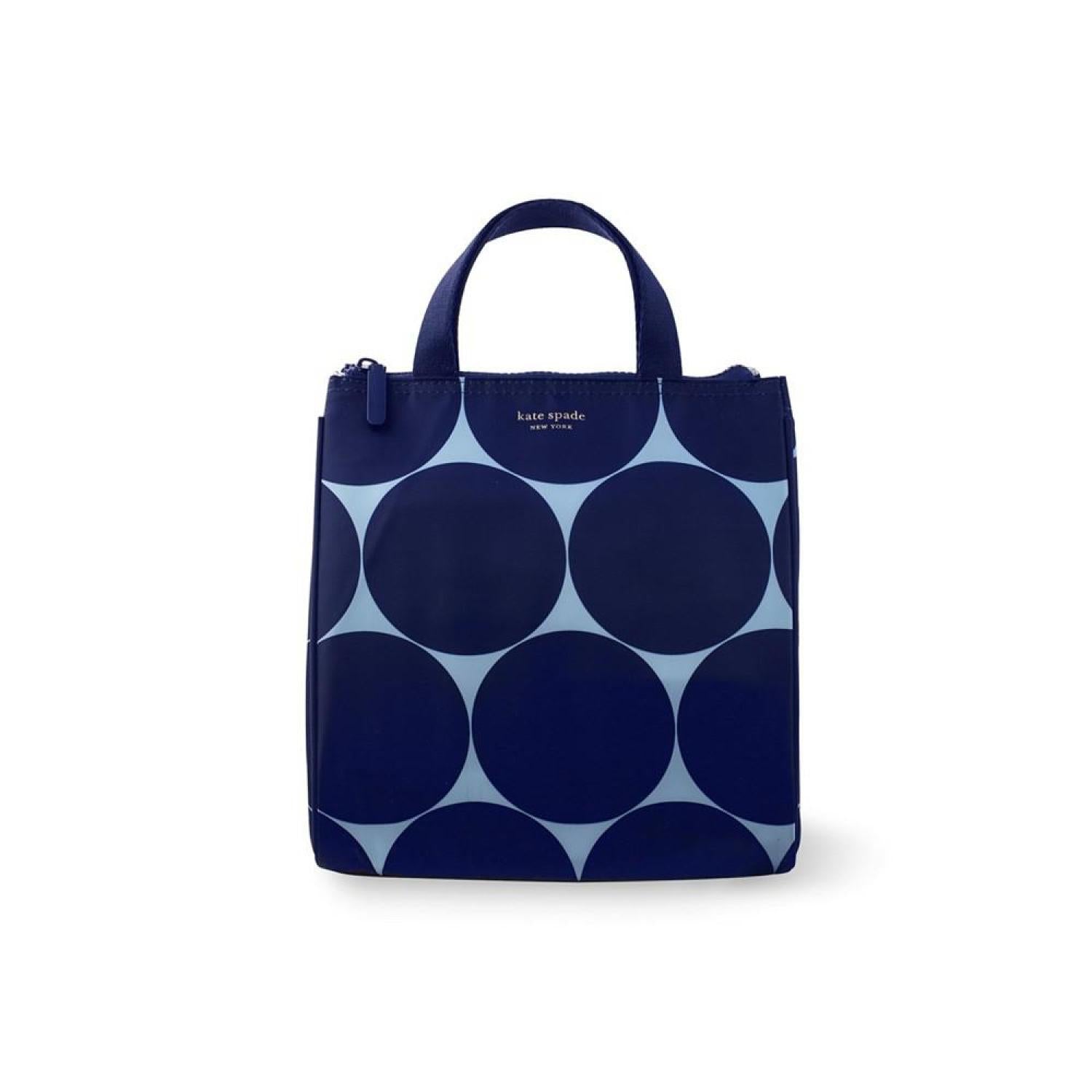 • Brown-bagging it never looked so gourmet. Designed by Kate Spade, this lunch bag's chic mod dot cover is complemented by an insulated interior, a practical top handle and a coordinating zipper pull for a smart finishing touch.