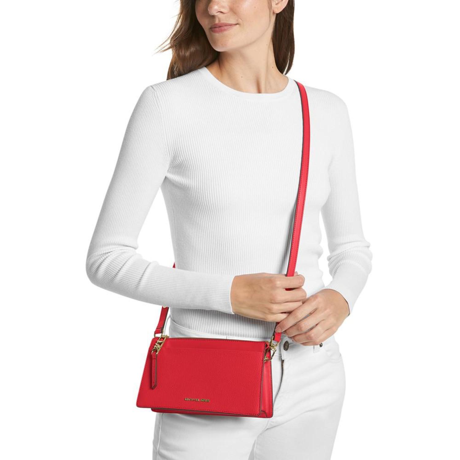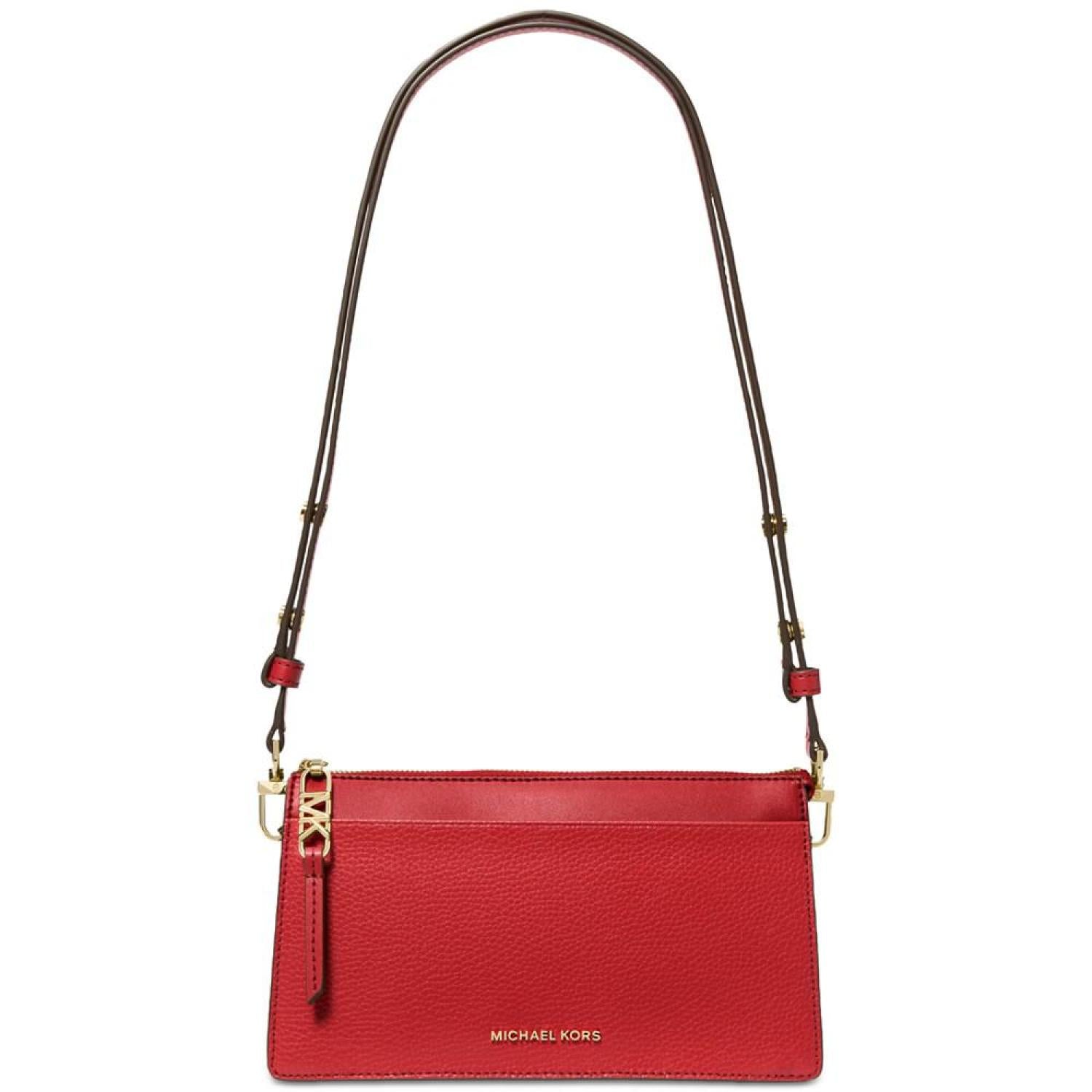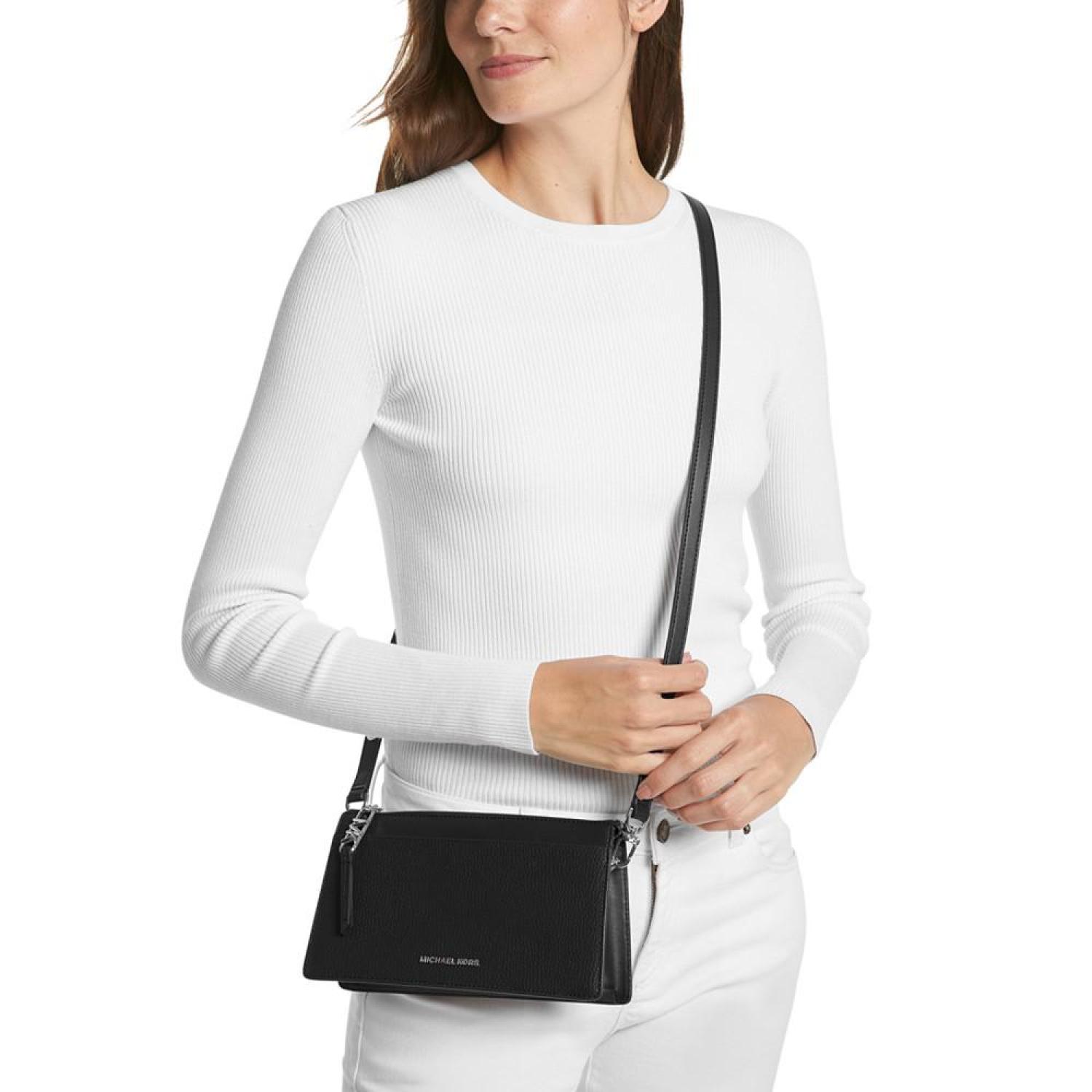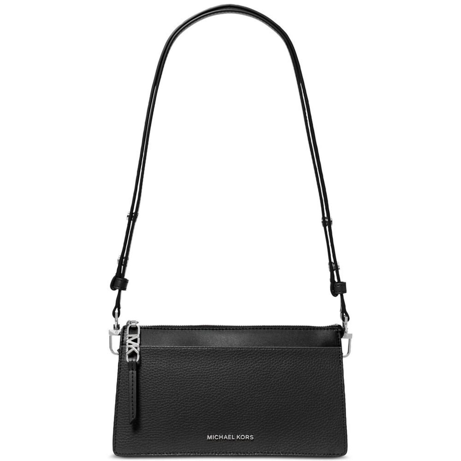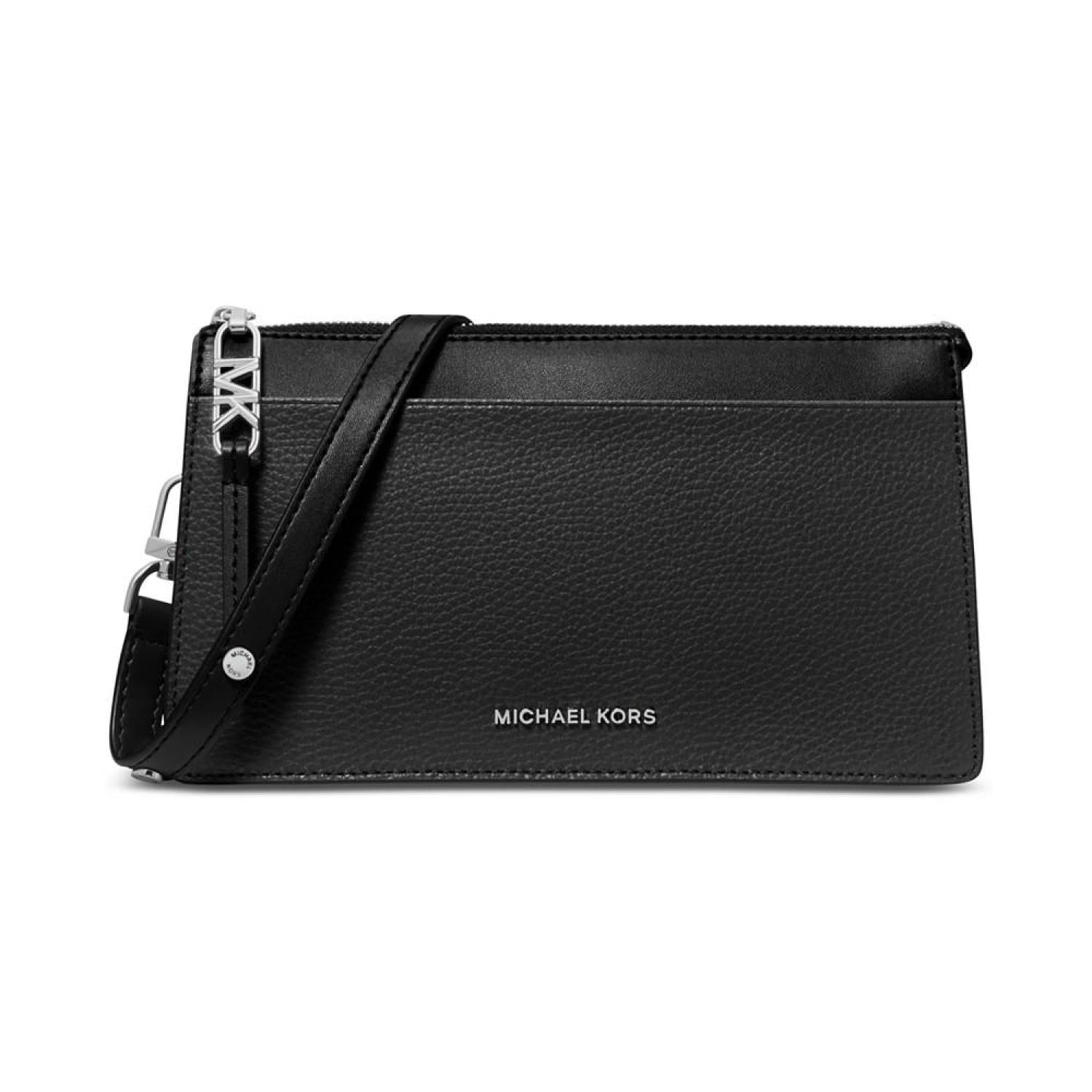 Simple and elegant, this leather crossbody by MICHAEL Michael Kors is the little black bag that goes with everything. An exterior slip pocket at the front provides storage for your phone so it's easily within reach while the convertible strap allows you to customize your look. Small sized bag; 9-1/4"W x 5"H x 2"D (width is measured across the bottom of handbag); 1.60 lbs. approx. weight Silhouette is based off 5'9" model 12-1/2"L - 22-1/2"L convertible strap Zippered closure Silver or gold tone hardware, varies by color, exterior slip pocket 3 interior card slots Leather; lining: polyester; trim: polyurethane, cotton, polyester Spot clean Imported