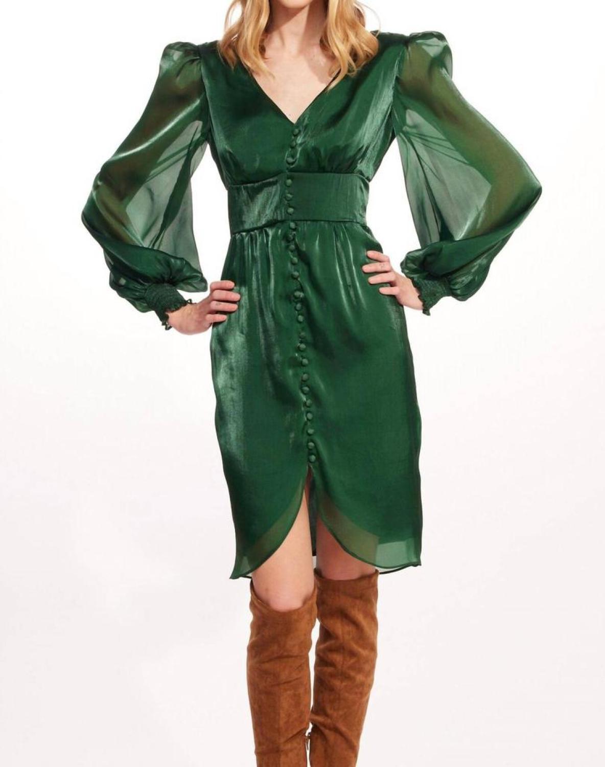 The perfect length dress does exist.You'll be turning heads wherever you go in this flattering midi dress. Crafted from a beautiful chiffon, our form fitting V neck dress is perfect for this season's upcoming occasions. Front covered button detail. Full sleeves. V-neck front and back. Midi length. Fully lined. Peekaboo slit in front. Back zip