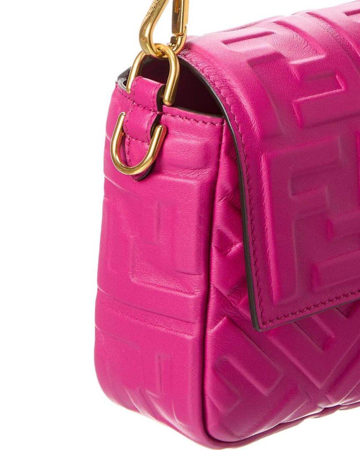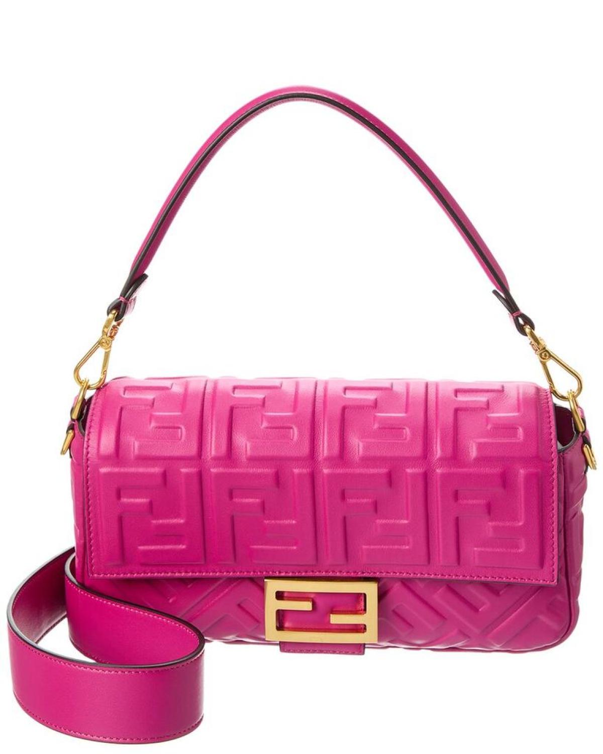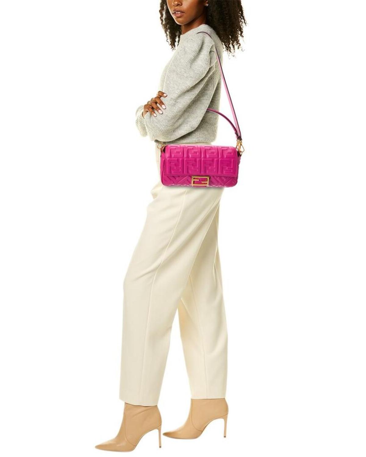 Introducing the exquisite FENDI Baguette Leather Shoulder Bag, the epitome of innovative and elegant Italian luxury. This stunning shoulder bag is crafted from the finest pink FF leather, adorned with gold-tone hardware and the iconic FENDI logo accent. Designed for the modern woman, this Baguette Leather Shoulder Bag features a spacious interior with a zippered pocket, providing ample room for all your essentials. With dimensions of 10.75 inches wide, 5.5 inches high, and 1.6 inches deep, this bag is both stylish and practical. It boasts a top handle with a 6-inch drop length, allowing for comfortable carrying, as well as a removable shoulder strap that drops 21 inches for versatile styling options. The fold-over flap with magnetic closure adds a touch of sophistication, ensuring the security of your belongings while adding a fashionable element to your ensemble. Please note that all measurements were taken by hand and are approximate; slight variations may occur, adding to the uniqueness of each bag. Rest assured, this FENDI Baguette Leather Shoulder Bag is 100% genuine. While we occasionally source our merchandise from trusted independent suppliers, we guarantee the authenticity of every product sold on our site. Elevate your style with this exquisite FENDI Baguette Leather Shoulder Bag and experience the unparalleled luxury and craftsmanship that FENDI is renowned for.