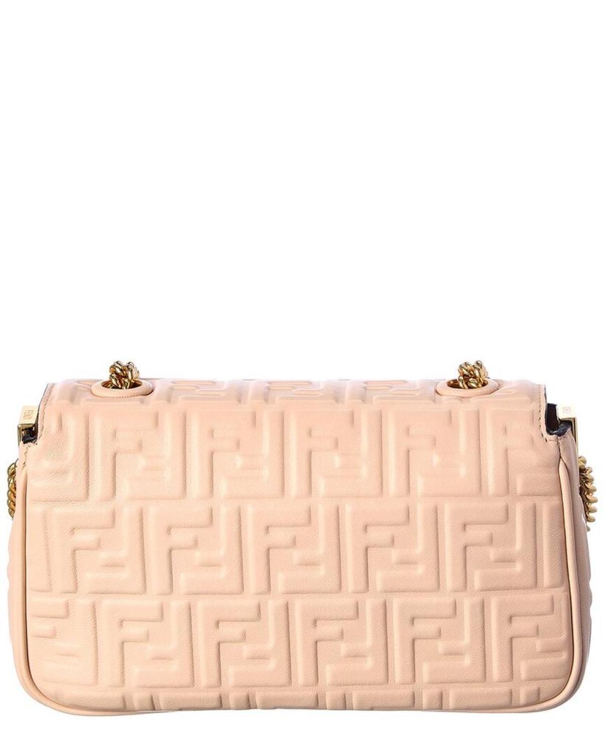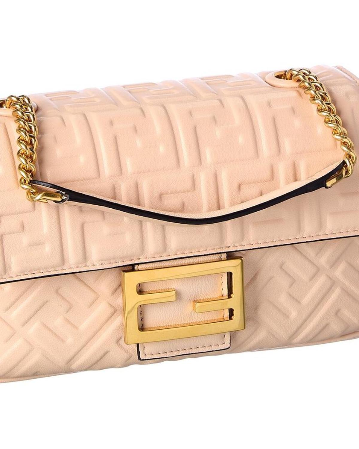 Introducing the FENDI Baguette Midi FF Leather Shoulder Bag - a timeless accessory that effortlessly combines style and functionality. Crafted in Italy with the utmost attention to detail, this pale pink FF leather shoulder bag showcases FENDI's innovative and elegant Italian luxury.With its gold-tone hardware and iconic logo accent, this bag exudes sophistication and refinement. The chain strap adds a touch of glamour, while the top handle offers versatility and convenience. The fold-over flap with a magnetic closure ensures easy access to your essentials.Inside, you'll find a luxurious leather lining and a zippered pocket for organization. Measuring 9.5 inches wide, 5.7 inches high, and 3 inches deep, this bag offers ample space for your daily essentials. The top handle has a drop of 2 inches, while the shoulder strap has a drop of 23 inches, allowing you to wear it in multiple ways.Please note that all measurements were taken by hand and are approximate, so slight variations may occur. Rest assured, our products are 100% genuine. While in some cases we purchase merchandise from trusted independent suppliers and not directly from the brand owner, we stand by the authenticity of every product sold on our site.Elevate your style with the FENDI Baguette Midi FF Leather Shoulder Bag and experience the elegance and craftsmanship that are synonymous with the FENDI brand.
