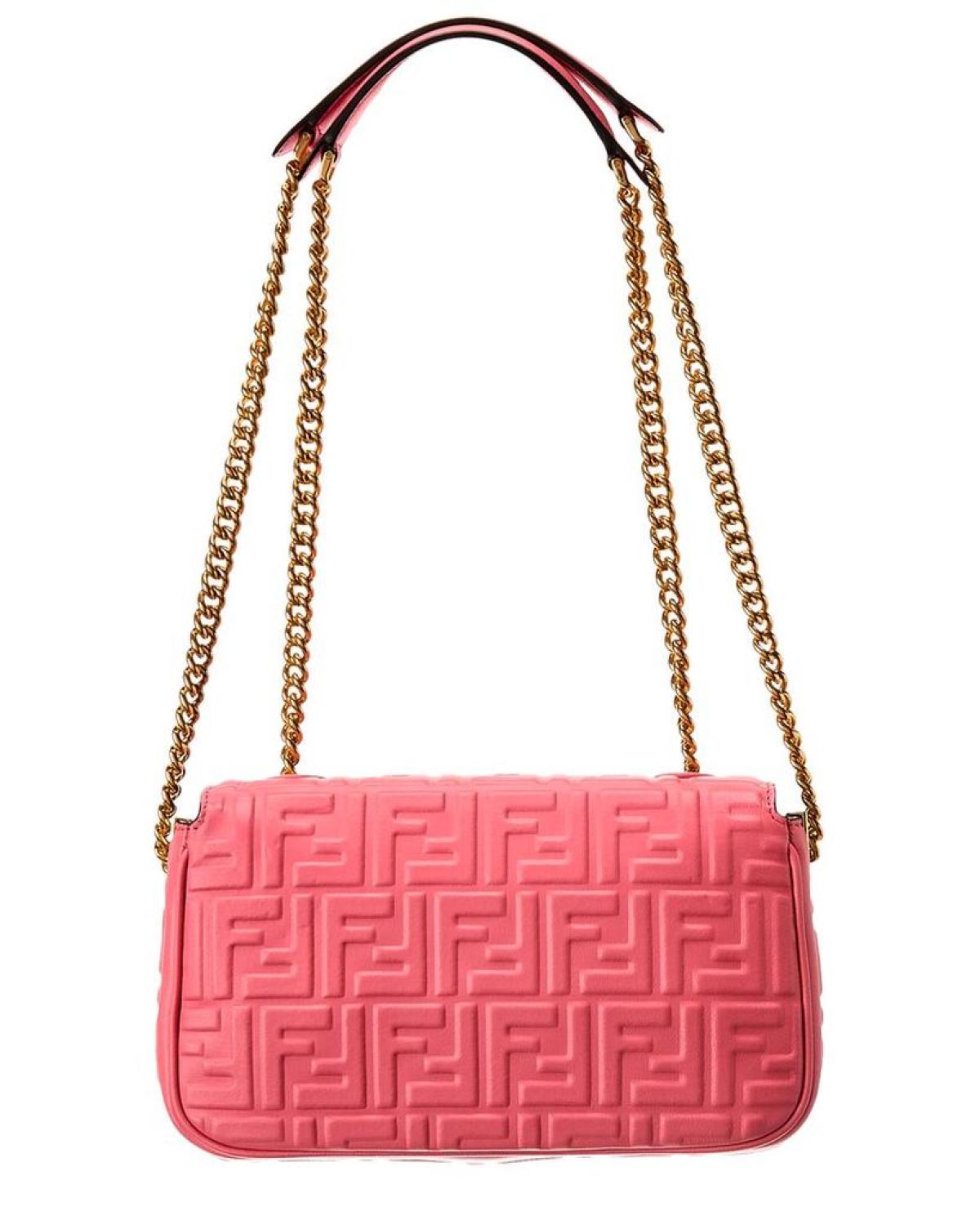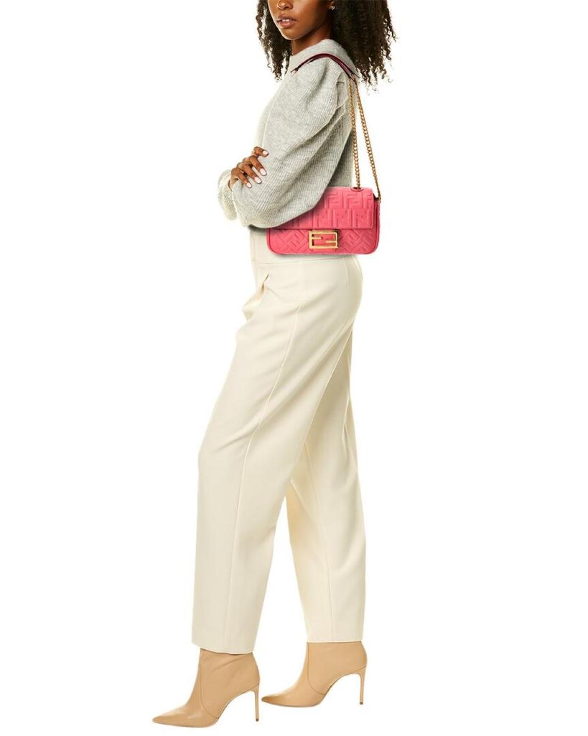 Introducing the FENDI Baguette Midi FF Leather Shoulder Bag - the epitome of innovative and elegant Italian luxury. Made in Italy with meticulous craftsmanship, this stunning shoulder bag showcases the iconic FENDI brand through its exquisite design and attention to detail.Crafted with pink FF leather and adorned with gold-tone hardware, the Baguette Midi FF Leather Shoulder Bag exudes sophistication and style. The eye-catching logo accent and chain strap add a touch of glamour to any outfit.The interior of this bag is just as impressive. It features a luxurious leather lining and a convenient zippered pocket, providing ample space to keep your essentials organized and within easy reach.Measuring 9.5 inches wide, 5.7 inches high, and 3 inches deep, this bag is the perfect size for both casual outings and special occasions. The top handle has a drop of 2 inches, while the shoulder strap has a drop of 23 inches, allowing for versatile wearing options.Designed with a fold-over flap and a magnetic closure, this bag ensures the security of your belongings while adding a stylish touch. Please note that all measurements were taken by hand and are approximate; slight variations may occur.Rest assured, all our products are 100% genuine. While in some cases we source merchandise from trusted independent suppliers, our commitment to authenticity remains unwavering. We stand by the quality and authenticity of every product sold on our site.Elevate your style with the FENDI Baguette Midi FF Leather Shoulder Bag - a true embodiment of Italian luxury and impeccable design. Shop now and experience the timeless elegance of FENDI for yourself.
