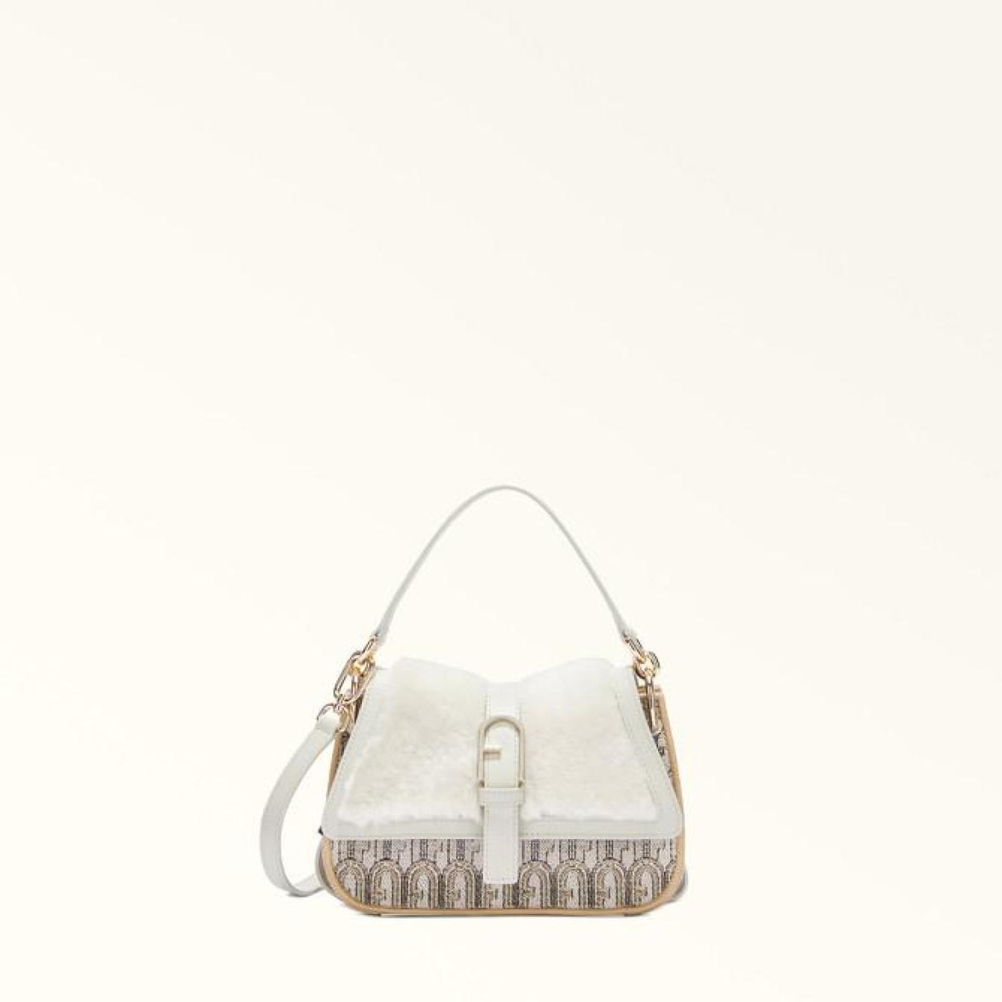 This elegant Furla Flow mini top handle is distinctive with its jacquard fabric featuring an ethnic Arch logo motif and lurex details, and the flap in soft sheepskin. A versatile piece for the winter, you can carry all your essentials in it, whether by hand or using the shoulder strap. The iconic Arch logo buckle on the front adds a touch of sparkle. - Open inner pocket - Short leather top handle - Adjustable and removable long leather shoulder strap - Flap with magnetic button closure Dimensions 8.46 x 5.91 x 3.15 (w x h x d) material Shearling,Fabric With Lurex Jacquard-Embossed Ethnic Motif Arch Logo composition 4% Nylon 20% Sheep fur 1% Other fibers 34% Acrylic 10% Leather 31% Polyester Plating Gold Height 5.91 in product code WB01165_BX2565_1007_2686S