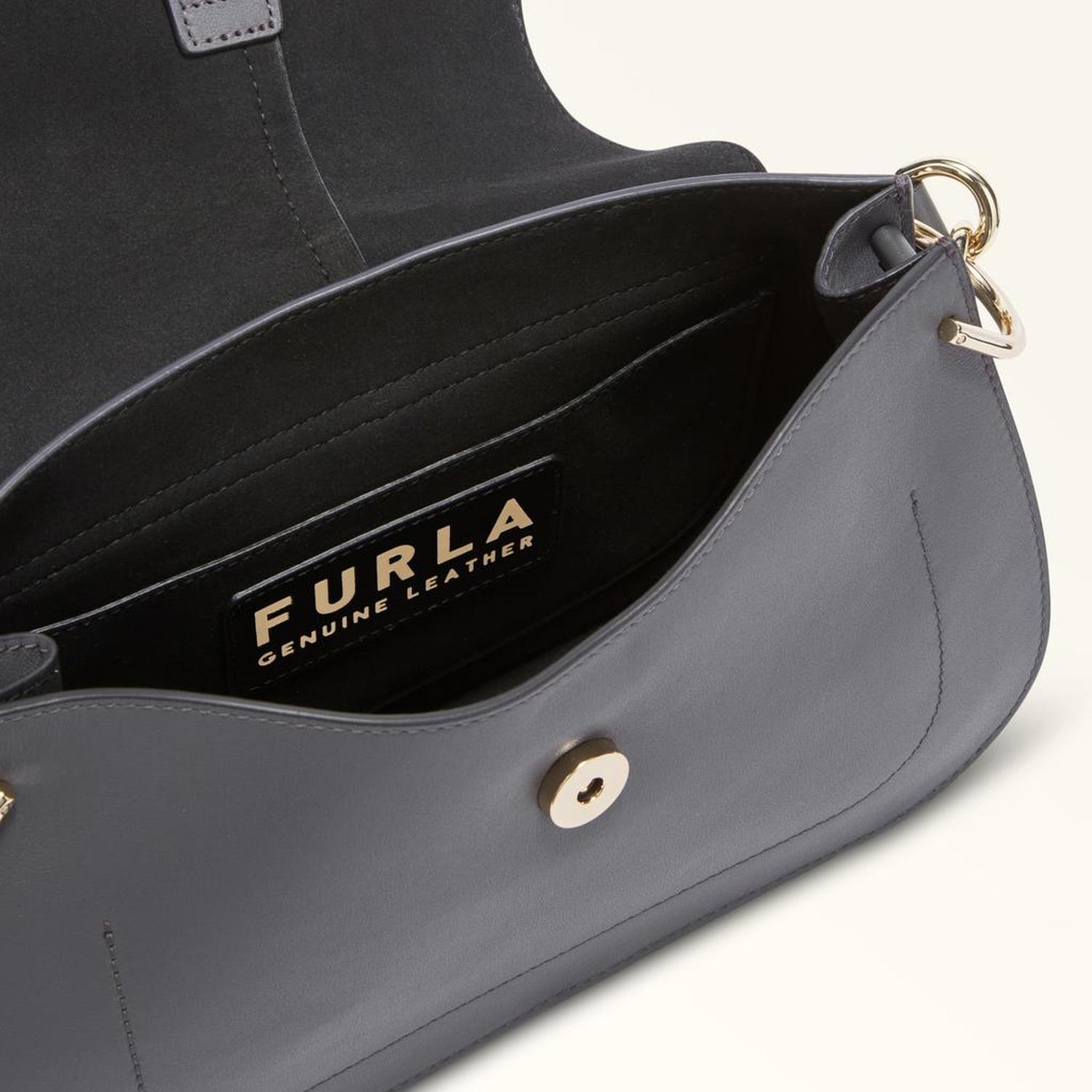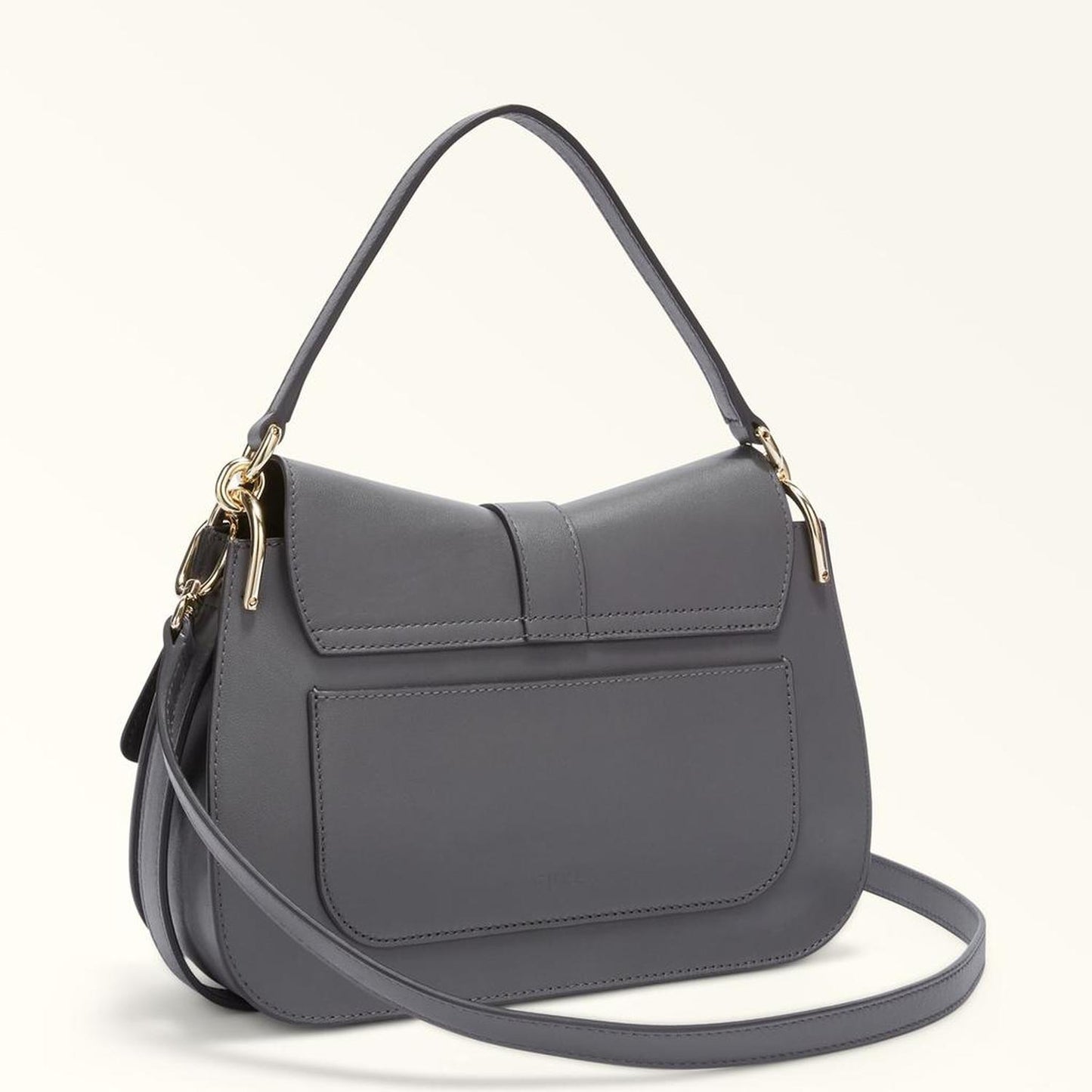 • A sleek yet functional piece, this elegant Furla Flow bag is distinctive with its compact trapezoid shape and curved lines. An ideal companion for any occasion because of the versatility it affords, it can be carried by hand, worn on the shoulder or crossbody. It is crafted from soft and smooth nappa leather, and features a decorative buckle in the shape of the iconic Arch logo.