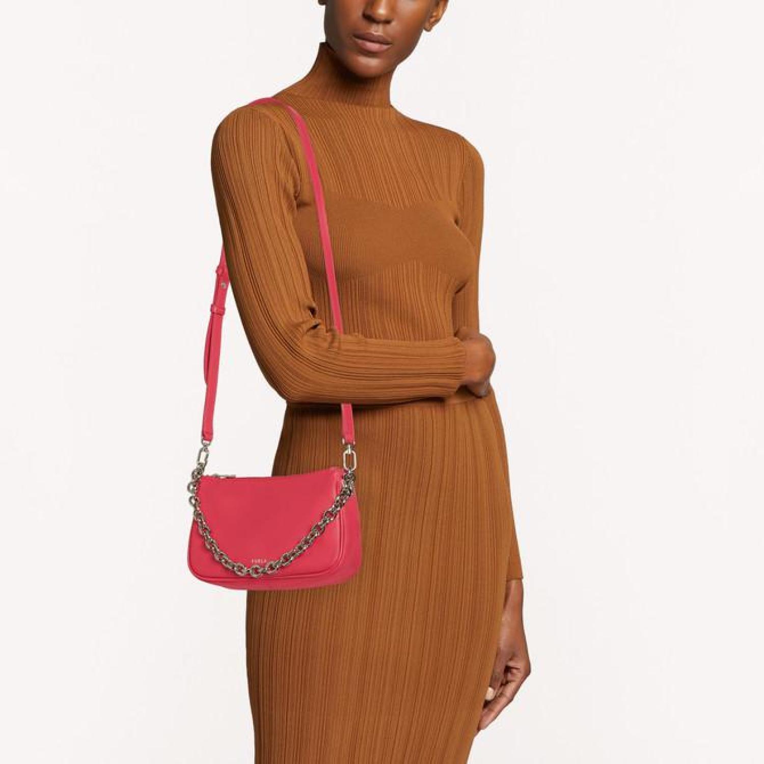 Furla Moon is a small shoulder bag made of soft calf leather. The accessory is made unique by its shape which fits perfectly under the arm, allowing you to comfortably wear it throughout the day. The bag features two straps: an adjustable and removable leather strap with snap hooks, and a metal chain strap which allows you to also wear it as a crossbody bag. - Zip closure - Palladium finishes - Inner zipped pocket - Furla logo punched on the front Dimensions 8.86 x 5.51 x 2.36 (w x h x d) material Soft Calf Leather composition 100% Leather Plating Palladium Height 5.51 in product code WB00356_AX0733_1003_0656S