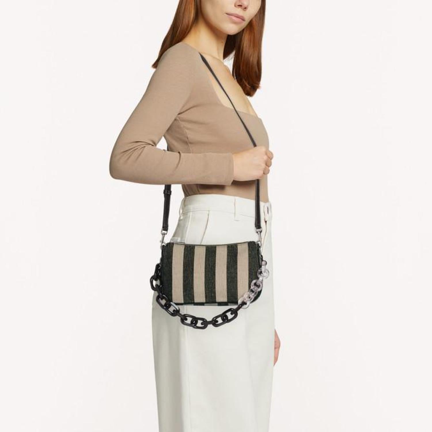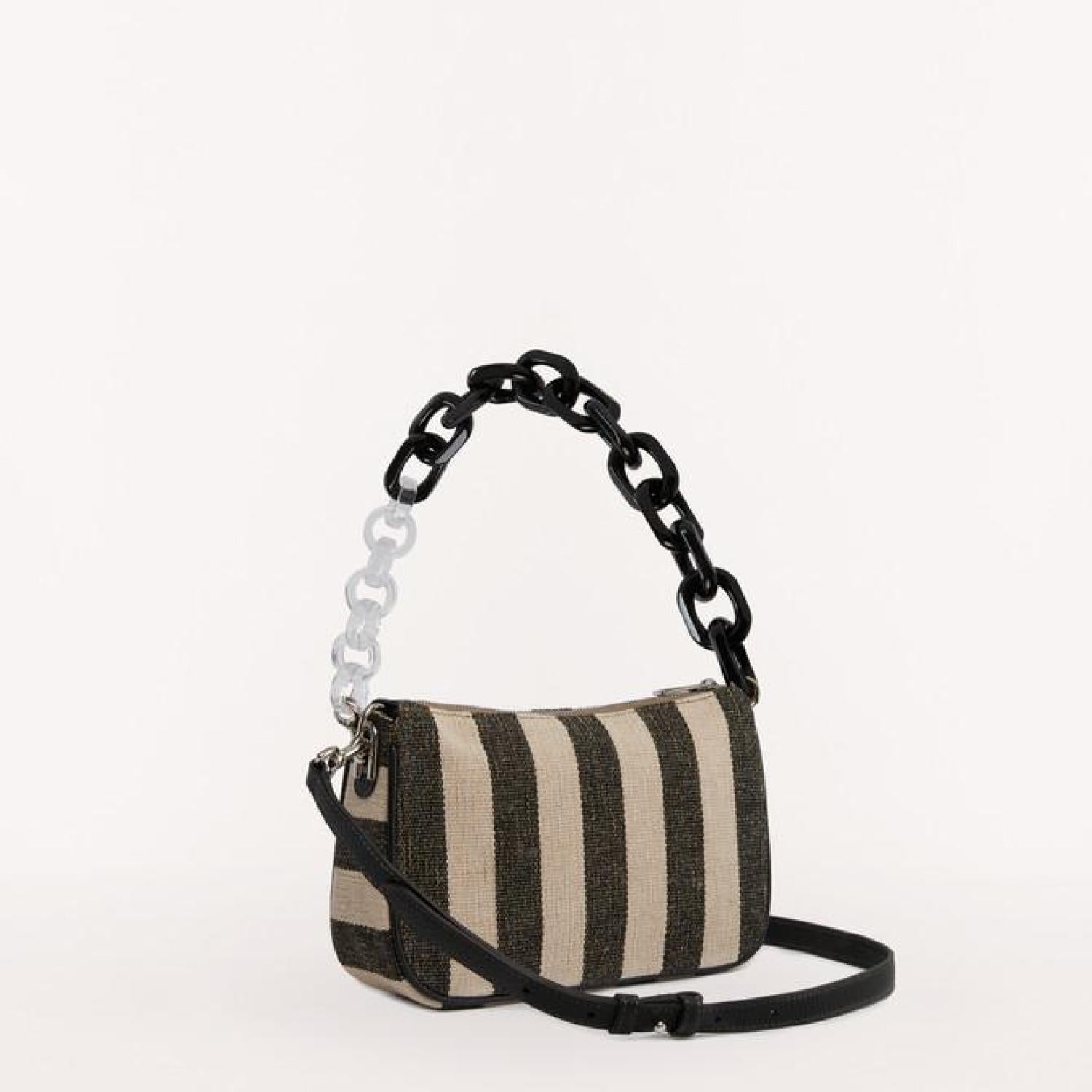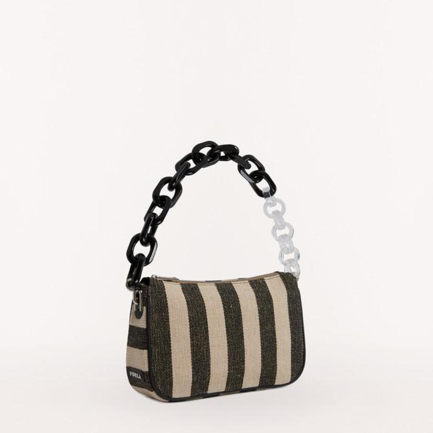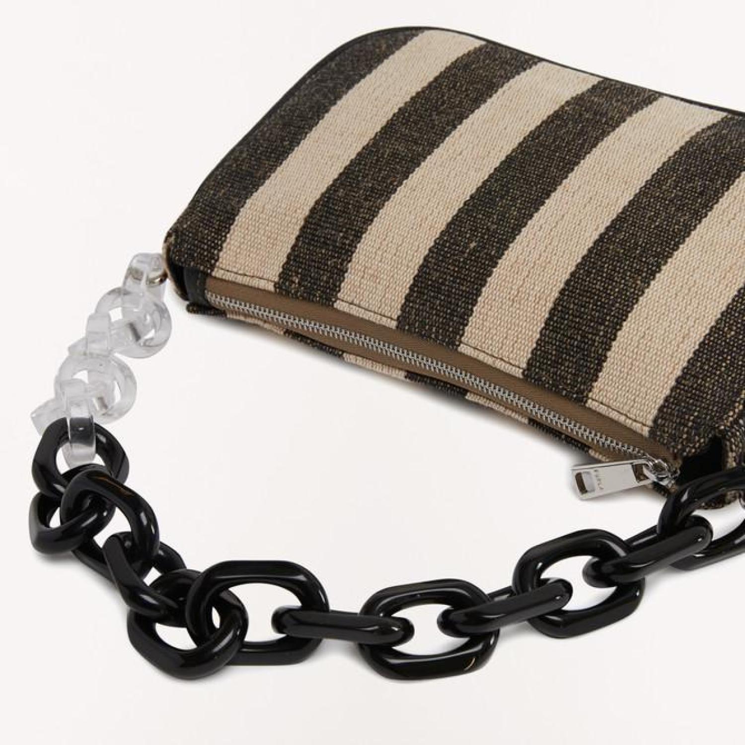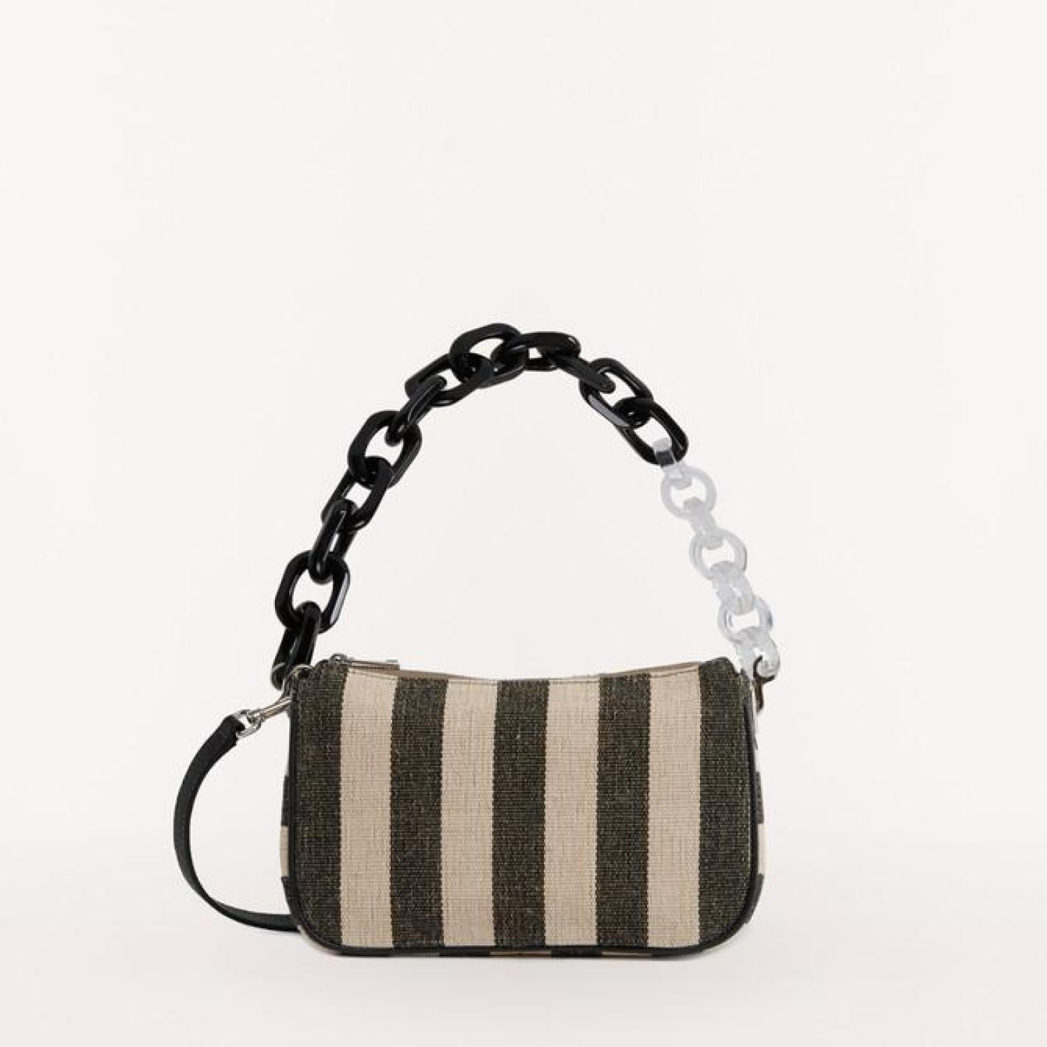 • Furla Moon is a small shoulder bag made of canvas fabric with a striped print and embellished with grained Eracle leather details. The accessory has an adjustable leather strap with metal cufflinks that can be removed by the side snap hooks so it can also be worn across the body. The inner zipped pocket allows you to safely store small objects and personal belongings.