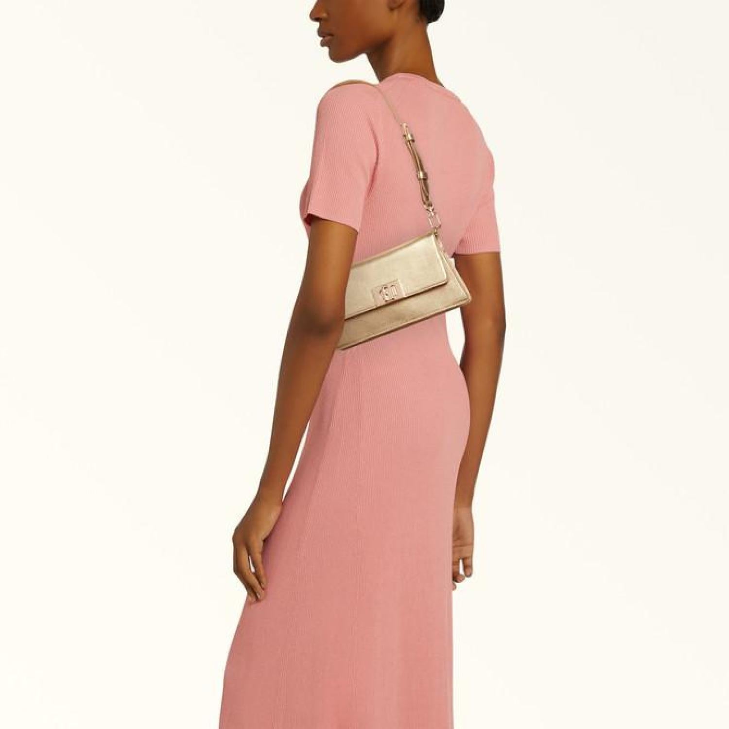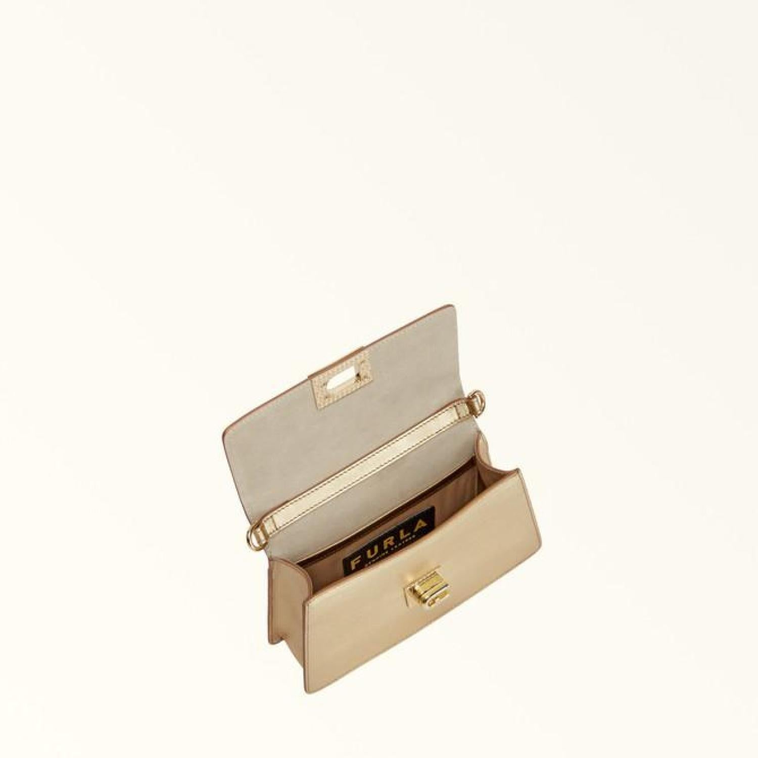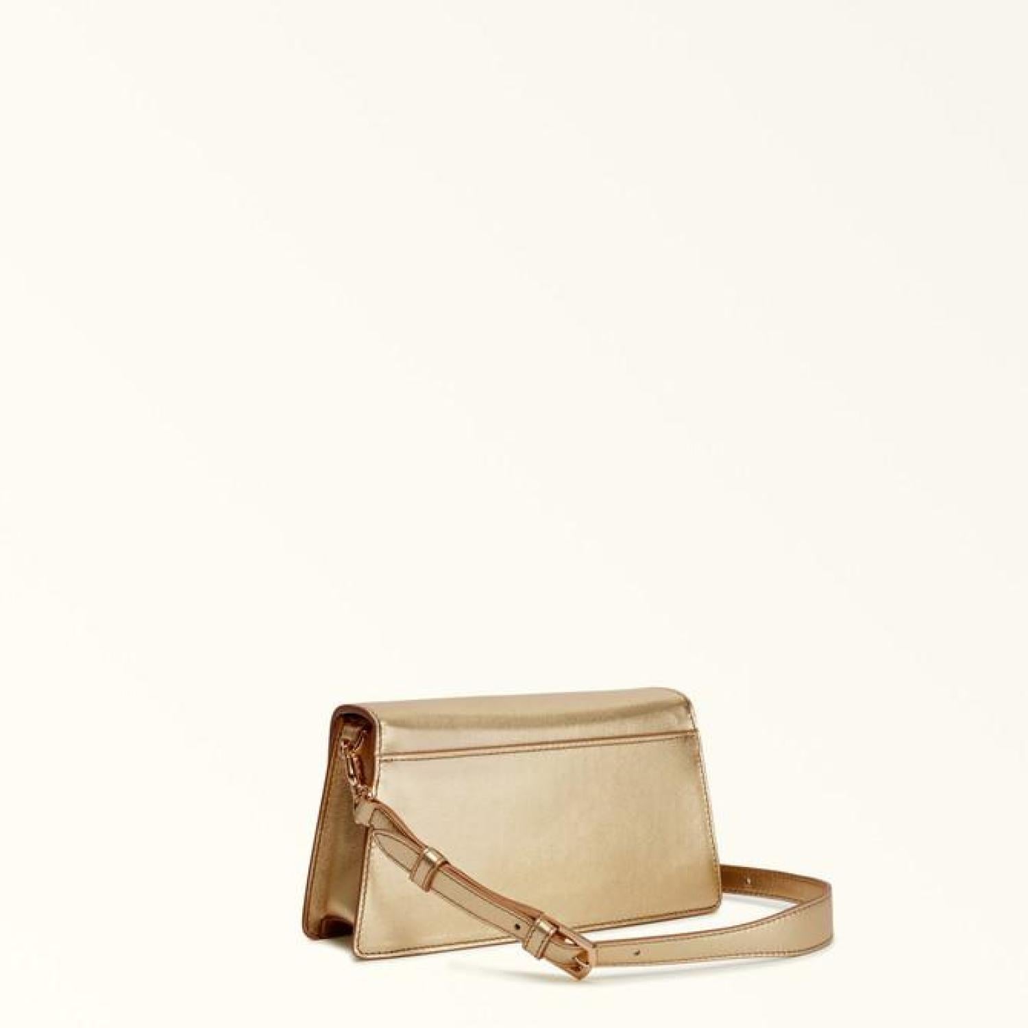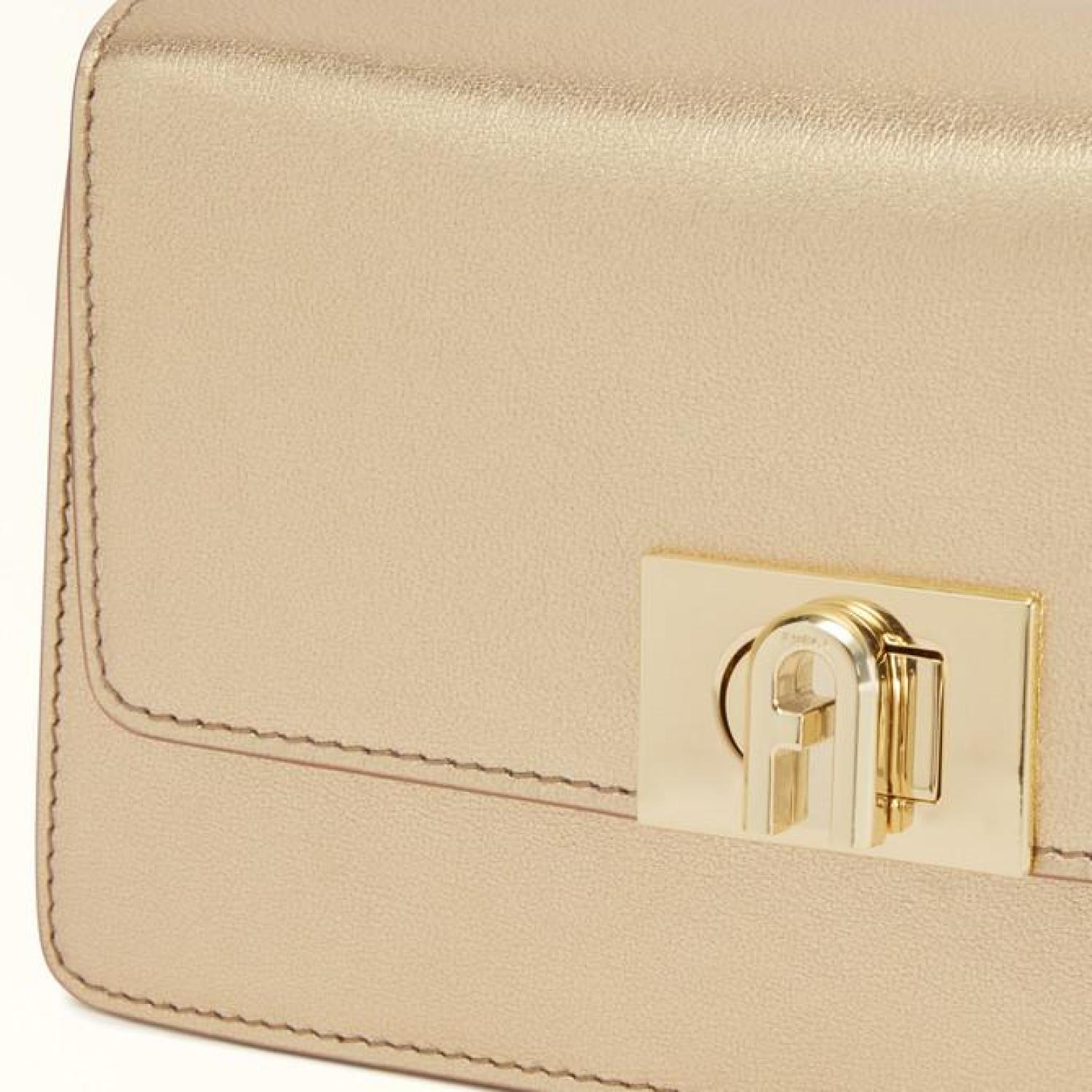 This versatile piece is bound to make you the star of the show, with its shiny finish smooth metal calf leather. The Furla Zoe mini shoulder bag adds a striking detail to any night out, and its clean geometric lines reveal just enough space inside for the essentials. A duo of adjustable and removable straps mean it can be worn on the shoulder or crossbody. - Open inside pocket - Adjustable and removable short strap - Adjustable and removable long strap - Twist closure with Arch logo Dimensions 8.27 x 4.53 x 2.36 (w x h x d) material Gardena Metal Calf Leather composition 100% Leather Plating Gold Height 4.53 in product code WB00856_BX2196_1007_CGD00