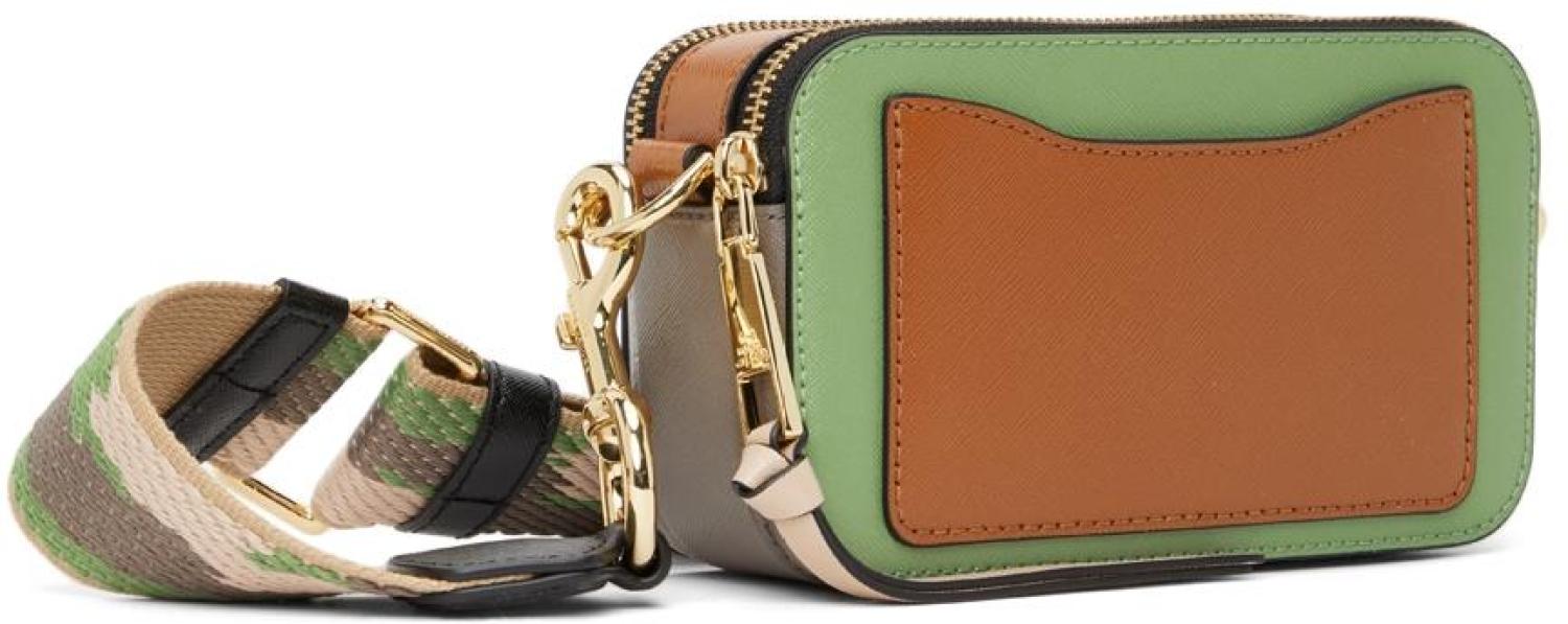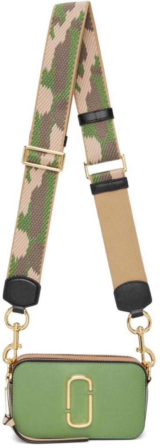 Marc Jacobs Green & Brown 'The Snapshot' Shoulder Bag Saffiano leather shoulder bag in green, brown, and taupe. Adjustable and detachable webbing shoulder strap featuring camoflauge pattern and cinch fastening. · Logo hardware at face · Patch pocket at back face · Twin zip closure · Patch pocket at two-compartment interior · Textile lining in taupe · Gold-tone hardware · H4 x W7 x D2 in Supplier color: Aspen green/Multi Leather. Made in Viet Nam. 221190F048006