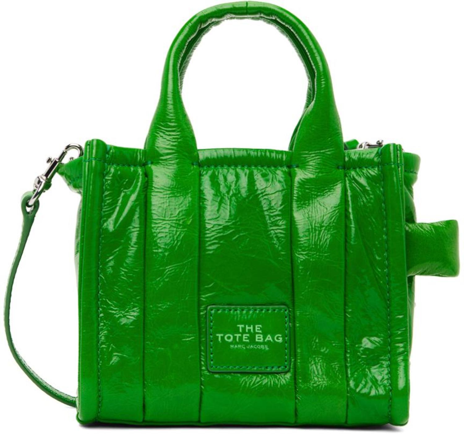 Patent crinkled lambskin tote in green. Leather logo patch at face.