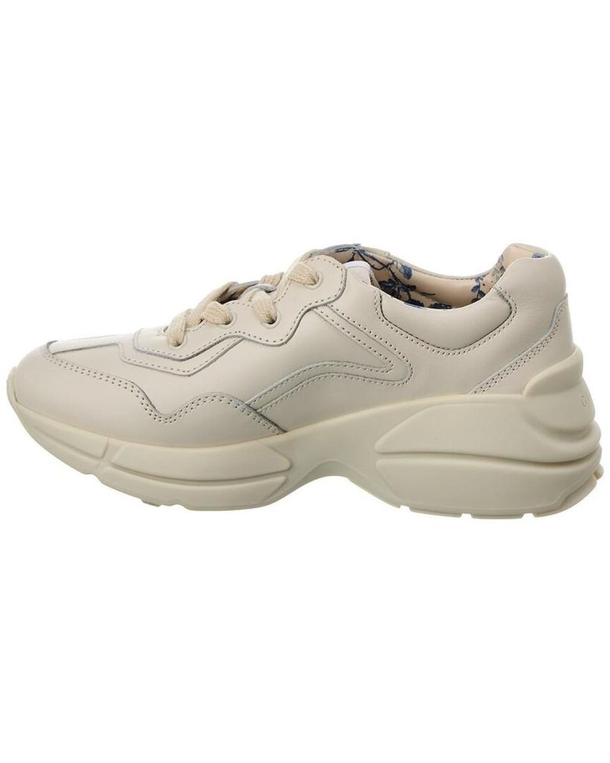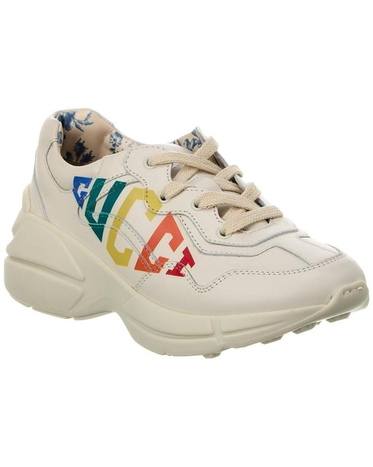 Introducing the Gucci Rhyton Leather Sneaker, a must-have addition to any stylish girl's shoe collection. Made in Italy, these sneakers feature a unique rainbow logo print on white leather, showcasing the eclectic and coveted style of the Gucci brand. The lace-up closure and lightly padded leather insole provide comfort and support, while the rubber sole offers traction for all-day wear. Please note that size selections are in European sizes, so be sure to reference the size chart for US conversions. Rest assured, all of our products are 100% genuine, ensuring the authenticity of every item sold on our site. Elevate your little one's casual look with these fashionable Gucci sneakers today!