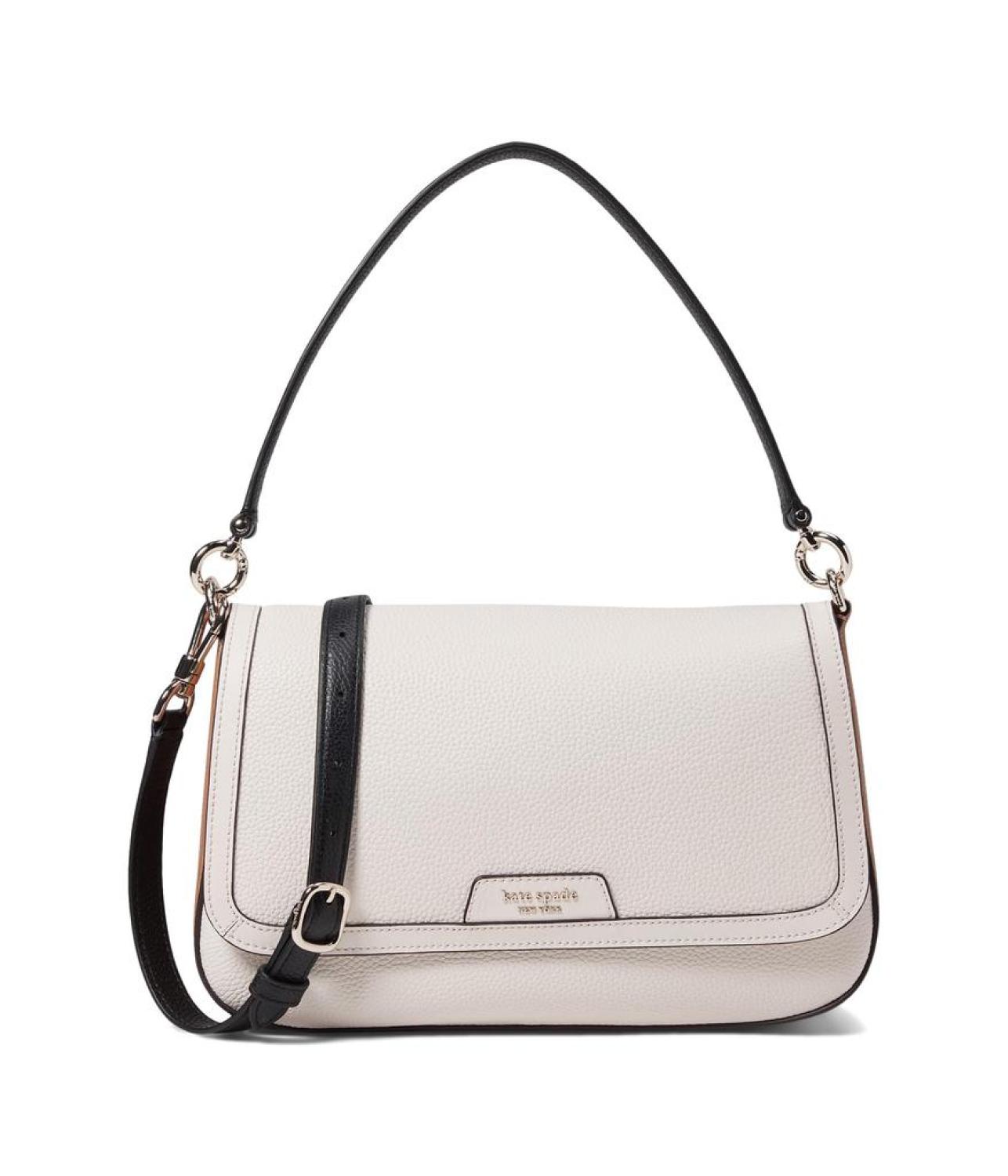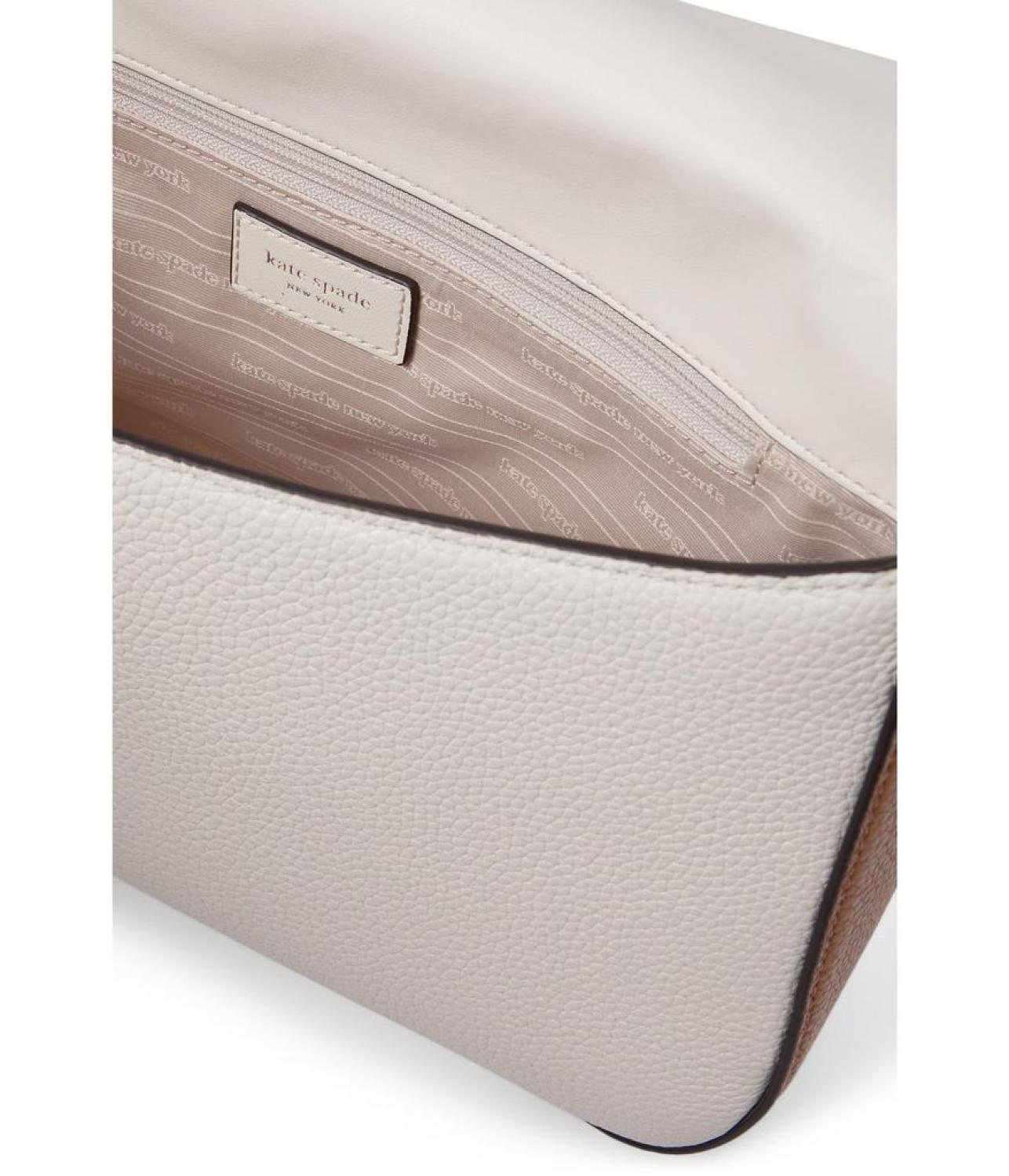 • Kate Spade New York® Hudson Color-blocked Pebbled Leather Flap Shoulder Bag boasts a versatile design and makes a truly great investment that will never go out of style. Crafted in pebbled leather for a textured finish, the bag features a flap with a magnetic snap closure opening into one interior slip pocket and one zippered pocket. The exterior displays one top handle, one removable and adjustable crossbody strap, and one back slip pocket.