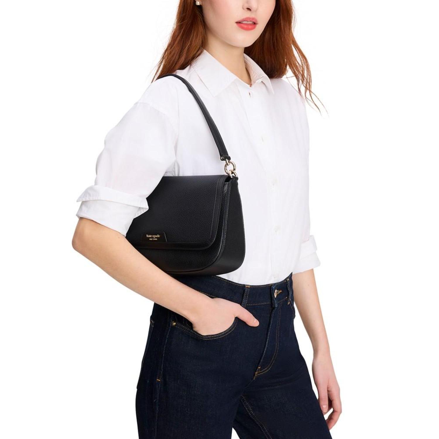 • Chic and classic, this leather shoulder bag by Kate Spade New York goes with everything. Grab it by the handle or attach the removable strap to go handsfree.