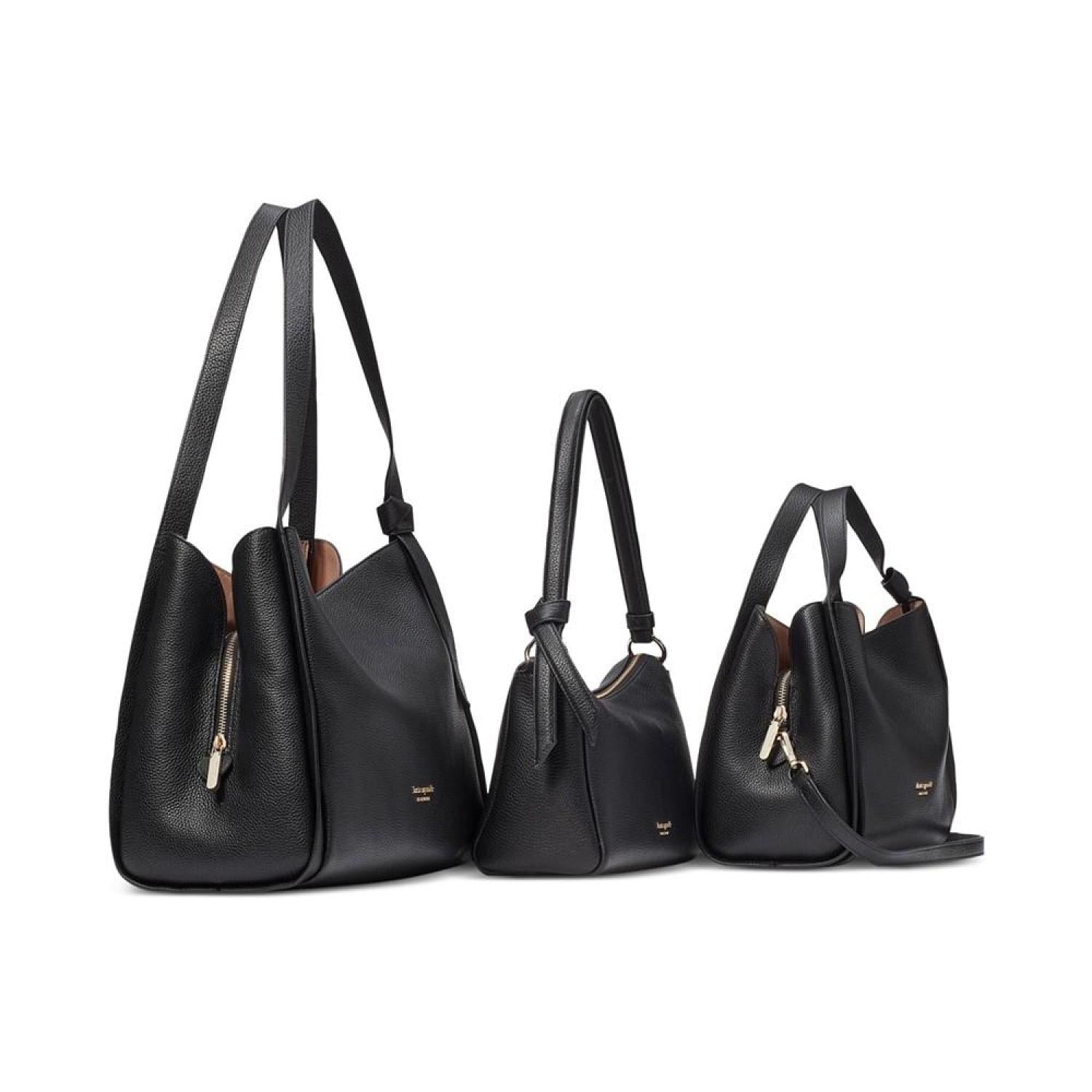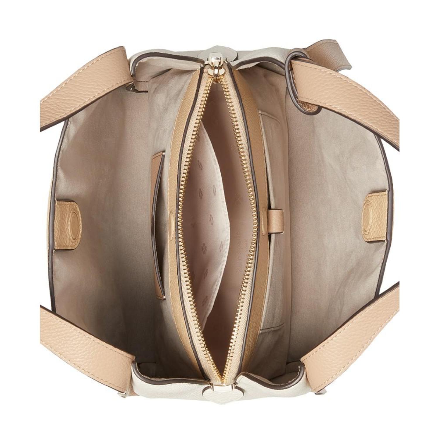Timeless with a twist of contemporary fashion, the Knott Colorblocked Pebbled Leather Crossbody by Kate Spade is a perfect bag for any occasion. Small sized bag; 10"W x 8-9/10"H x 5-2/5"D (width is measured across the bottom of the bag) Silhouette is based off 5'9" model 5-1/2"L handles, 22"L removeable, adjustable strap Magnetic snap closure Pale gold-tone hardware Interior center zip compartment, snap pocket & zip pocket Leather Wipe clean Imported