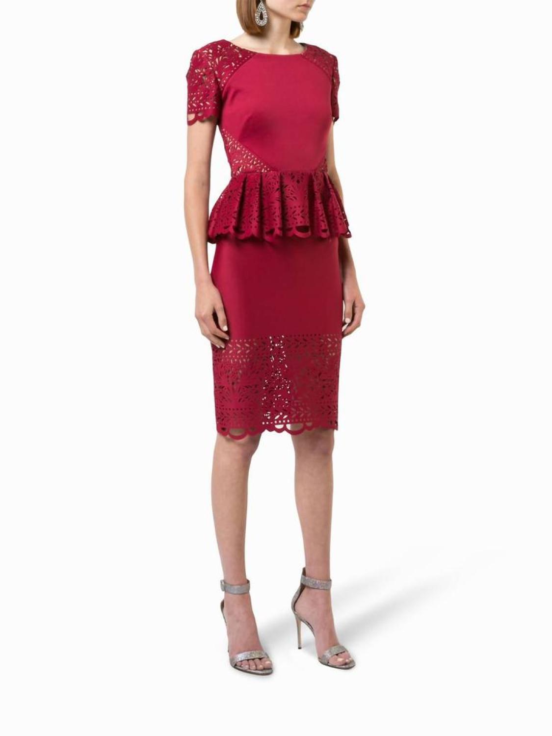 • Just add slides or mules and you are good to go.Defined by its deep red hue and intricate laser-cut detailing, the streamlined silhouette features a round neck, short sleeves, a fitted waist with a peplum detail, a pencil shape knee-length skirt and a concealed rear zip fastening for an impeccable fit and finish. Model is 1,75 m wearing size 2. Dry clean only.