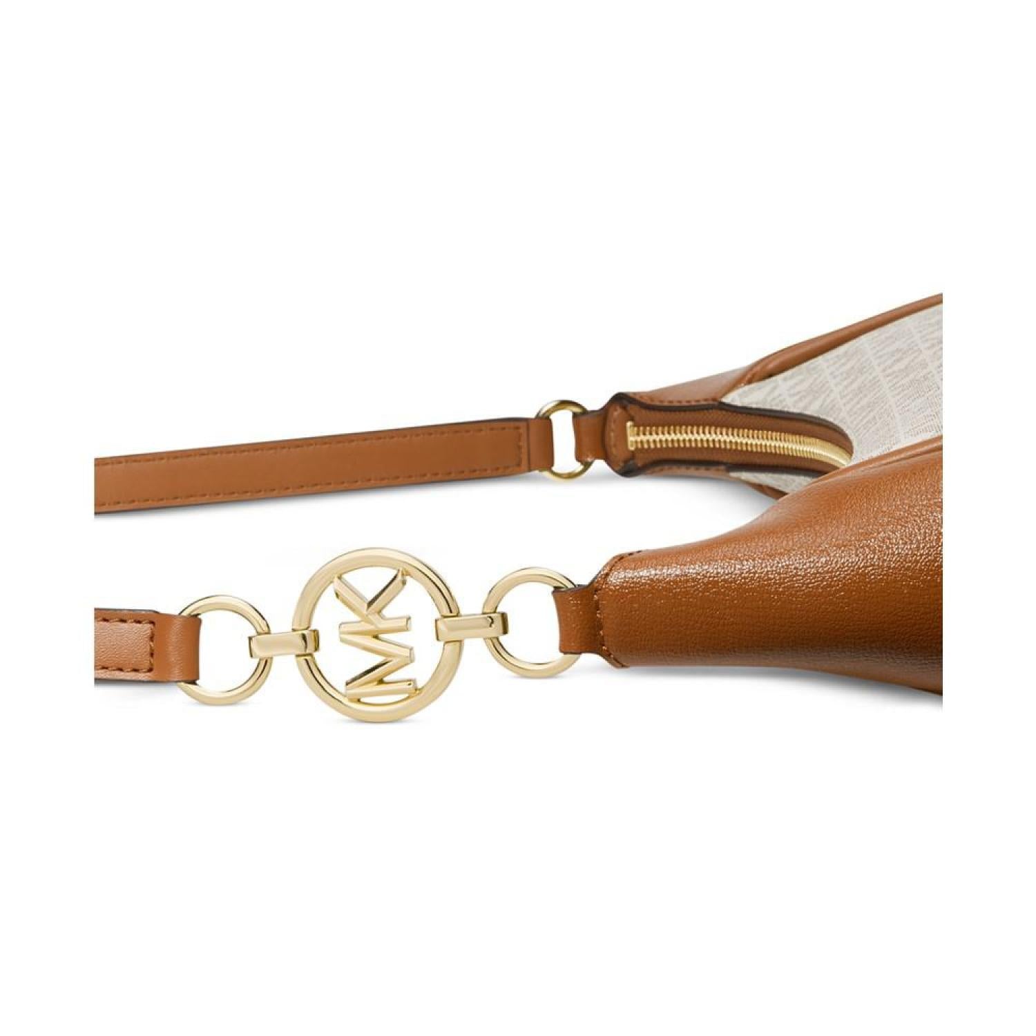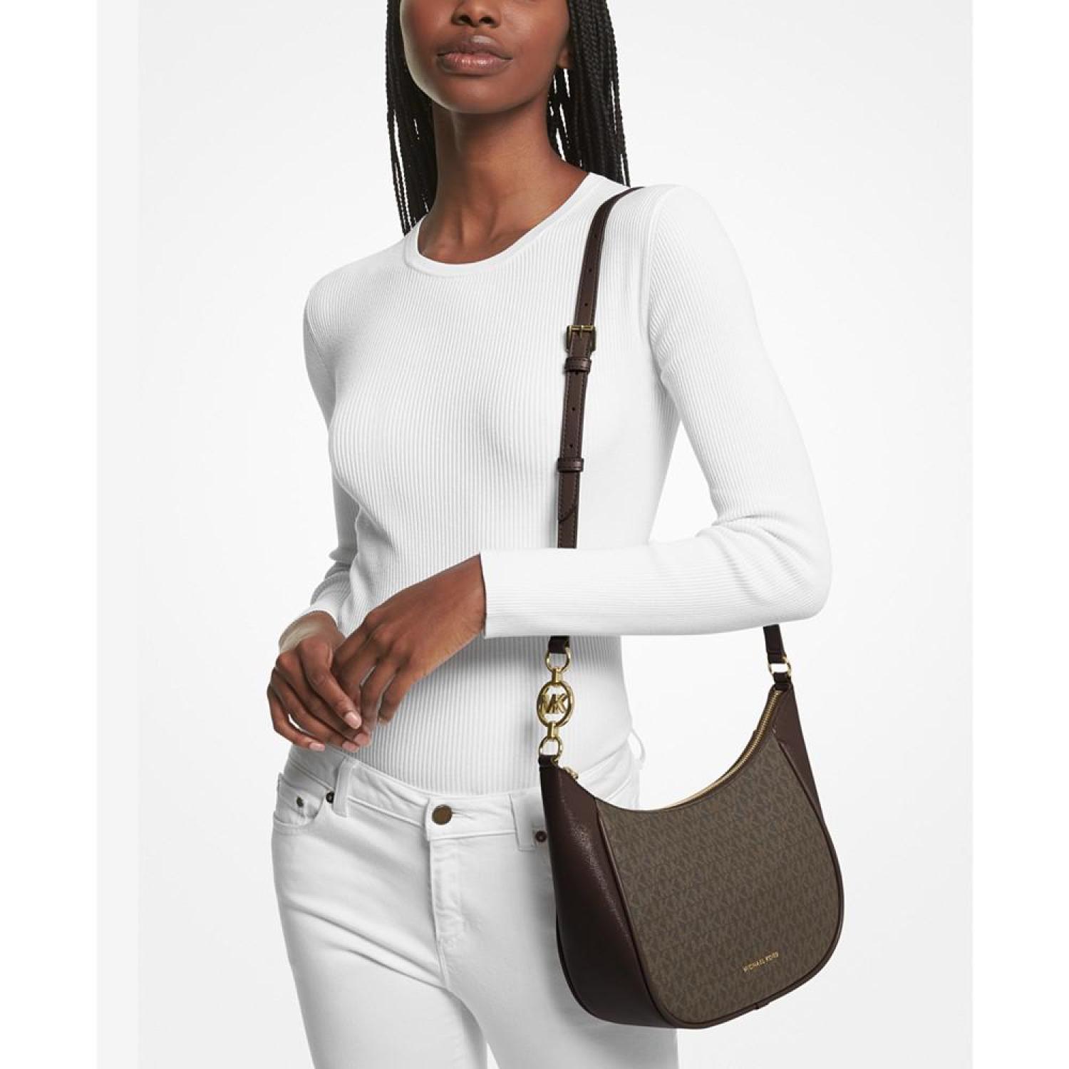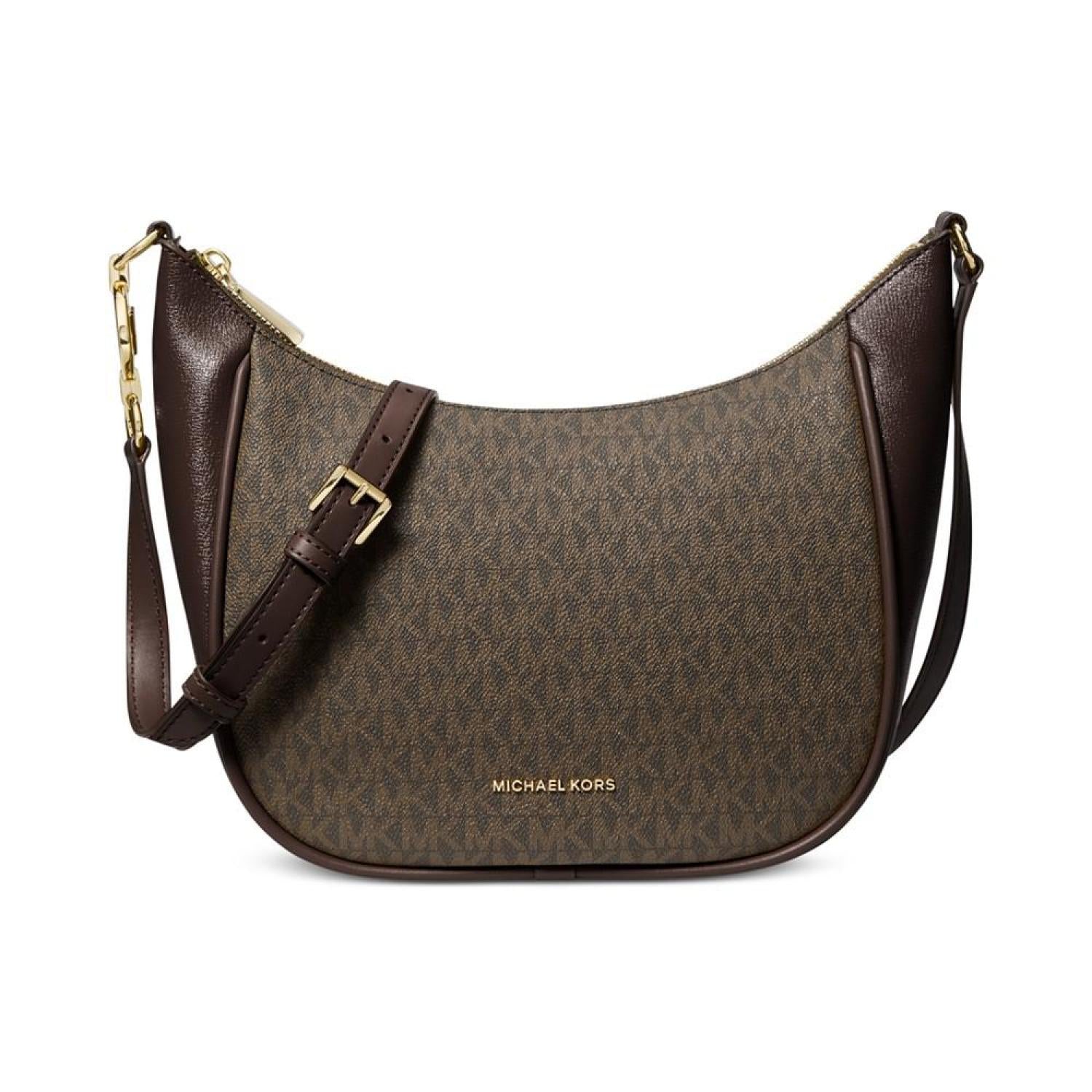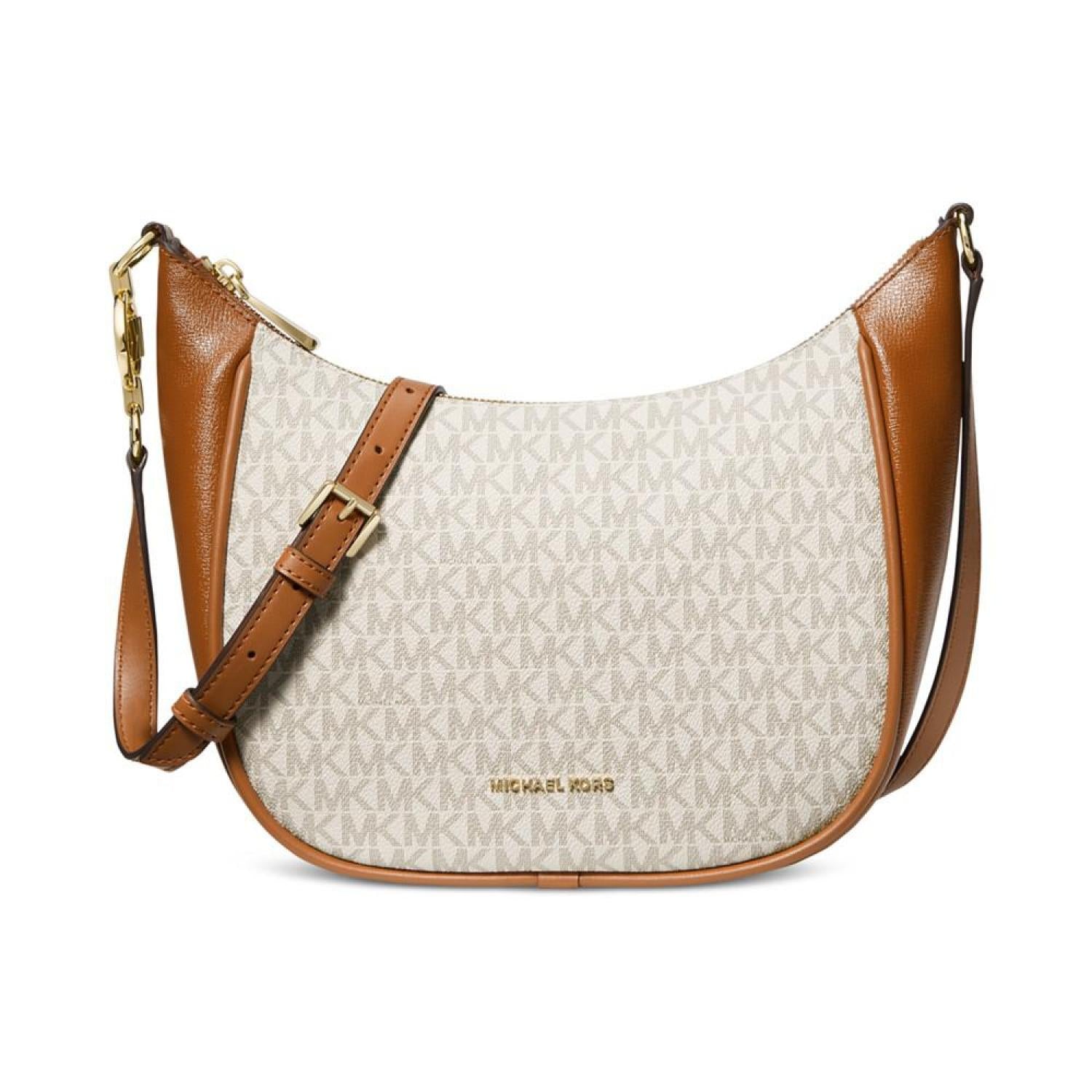 This MICHAEL Michael Kors Cheryl Crossbody bag is designed with a sleek, streamlined silhouette with allover logos. Medium sized bag; 10-1/2"W x 9-1/2"H x 3-1/2"D (width is measured across the bottom of handbag); 0.57 lbs. approx. weight Silhouette is based off 5'9" model 21" adjustable shoulder strap Zip closure Gold-tone exterior hardware Interior back slip pocket PVC, polyester, polyurethane; lining: polyester; trim 1: leather; trim 2: polyurethane, cotton, polyester Wipe clean Imported