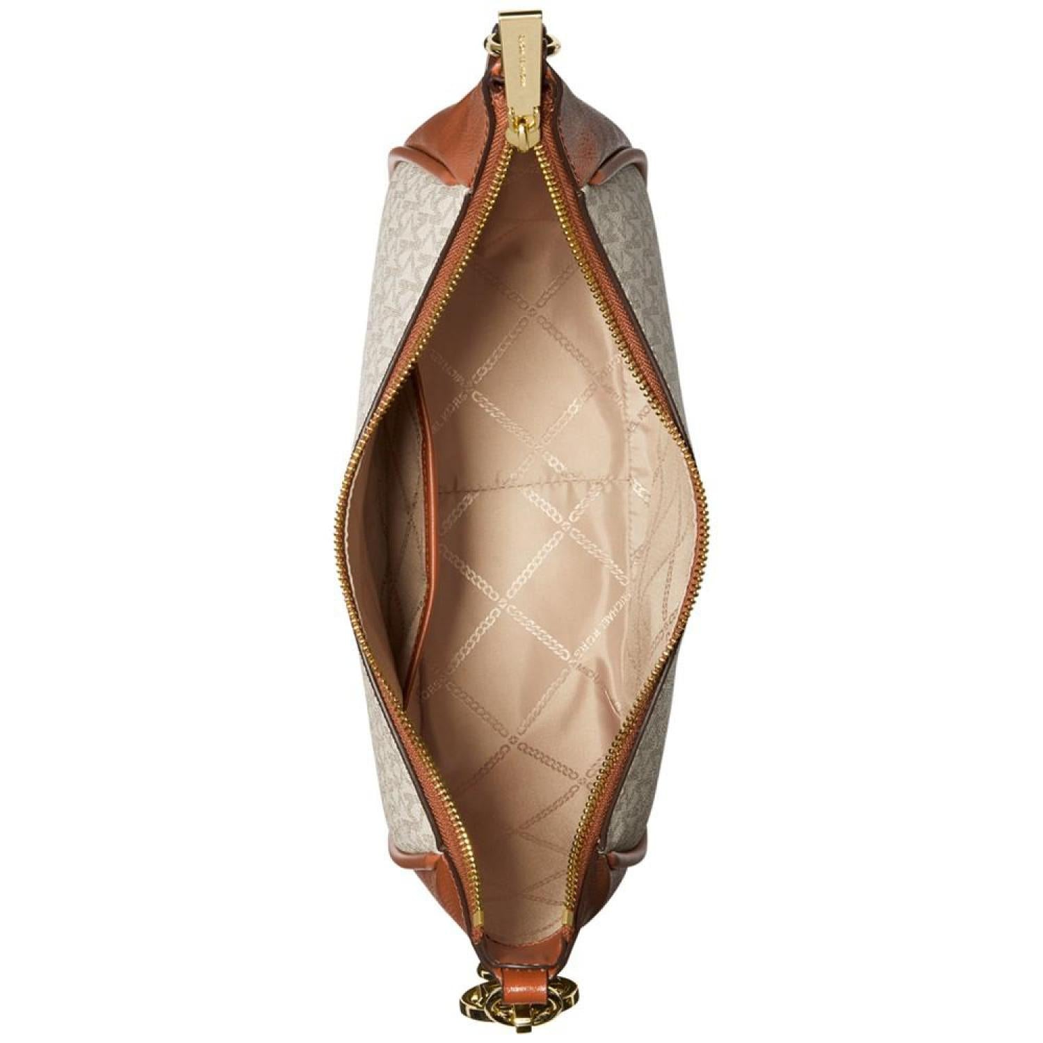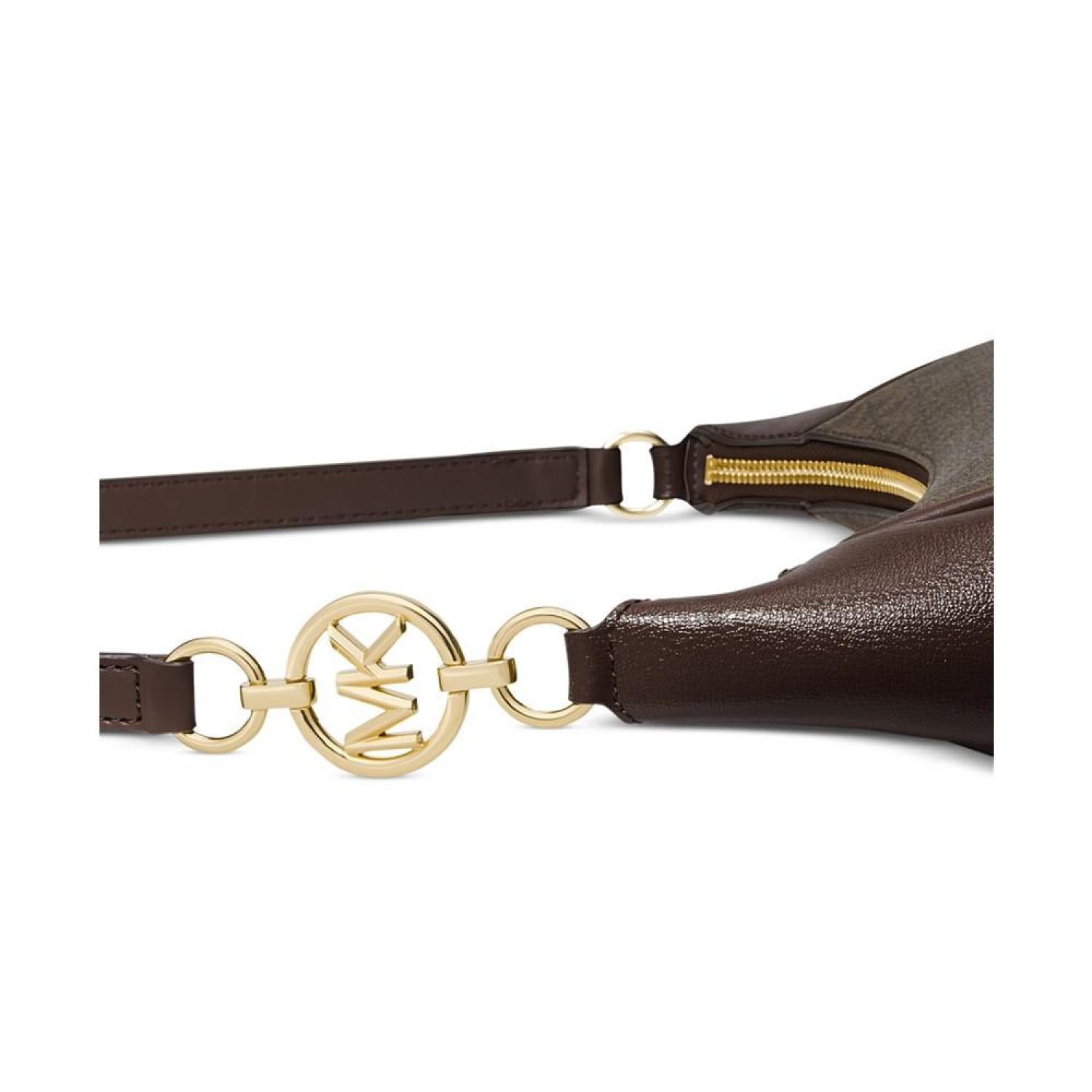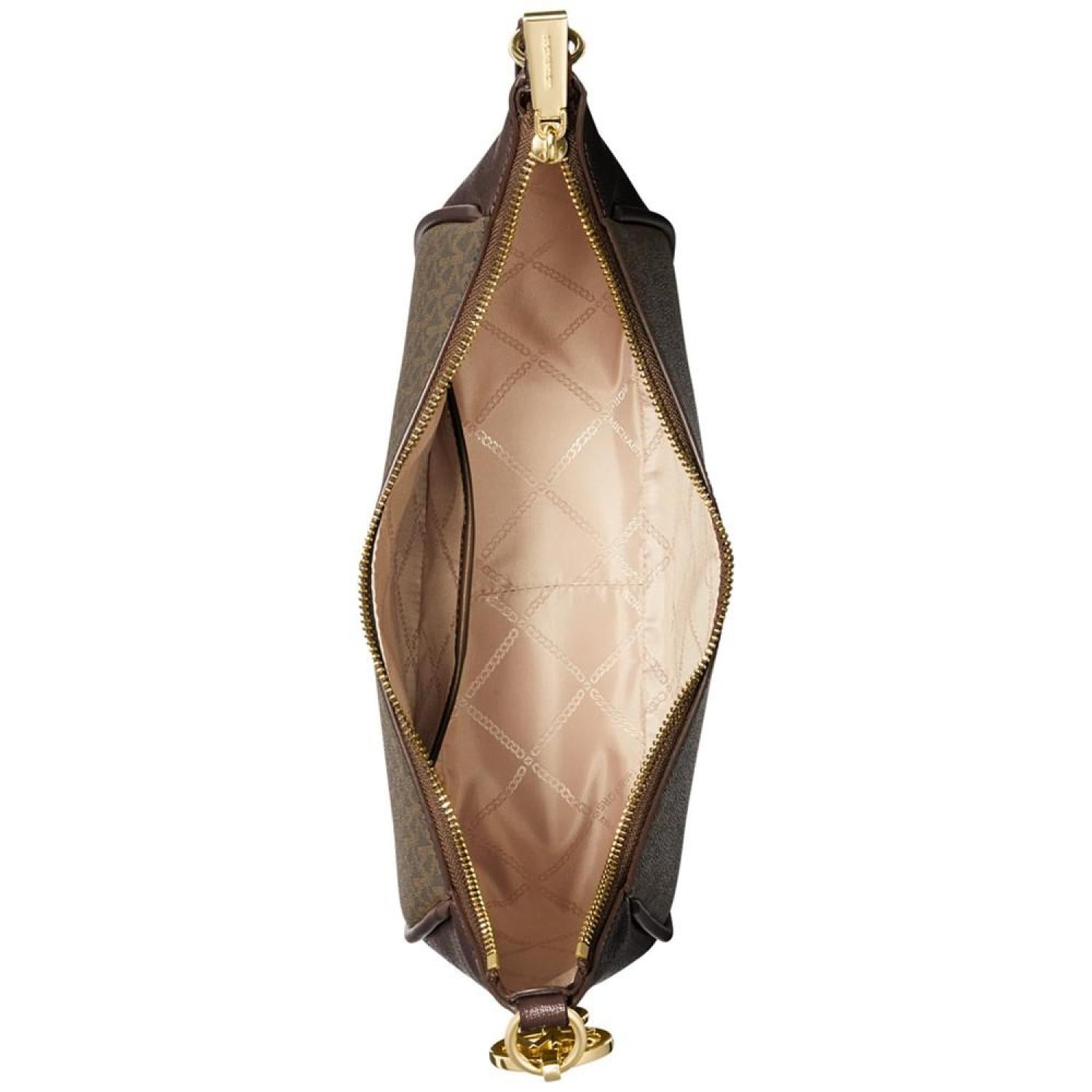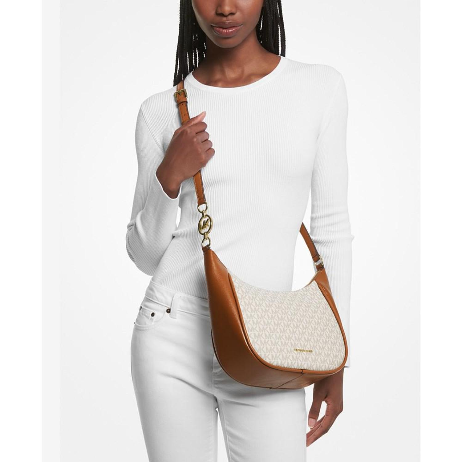 This MICHAEL Michael Kors Cheryl Crossbody bag is designed with a sleek, streamlined silhouette with allover logos. Medium sized bag; 10-1/2"W x 9-1/2"H x 3-1/2"D (width is measured across the bottom of handbag); 0.57 lbs. approx. weight Silhouette is based off 5'9" model 21" adjustable shoulder strap Zip closure Gold-tone exterior hardware Interior back slip pocket PVC, polyester, polyurethane; lining: polyester; trim 1: leather; trim 2: polyurethane, cotton, polyester Wipe clean Imported