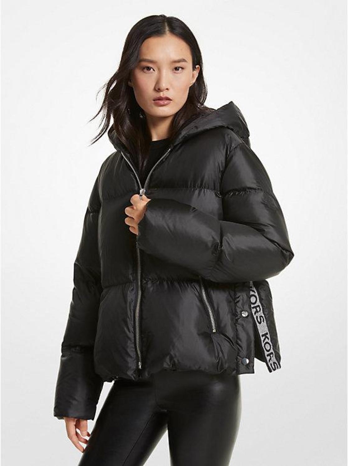 A stylish and practical choice for the slopes or après-ski, this jacket is made from metallic ciré shell with a logo tape-trimmed hood, zip pockets and side vents with a snap closure. Insulating down keeps you feeling super cozy on active days or breaks. Keep it in focus with minimal separates. • Puffer jacket • Ciré • Shell: 100% polyester • Fill: 80% down/20% feathers • Lining: 100% recycled polyester • Zip/snap fastening • Dry clean • Imported • Model is 5'11"/180 cm wearing size S • Puffer jacket• Ciré• Shell: 100% polyester• Fill: 80% down/20% feathers• Lining: 100% recycled polyester• Zip/snap fastening• Dry clean• Imported• Model is 5'11"/180 cm wearing size S