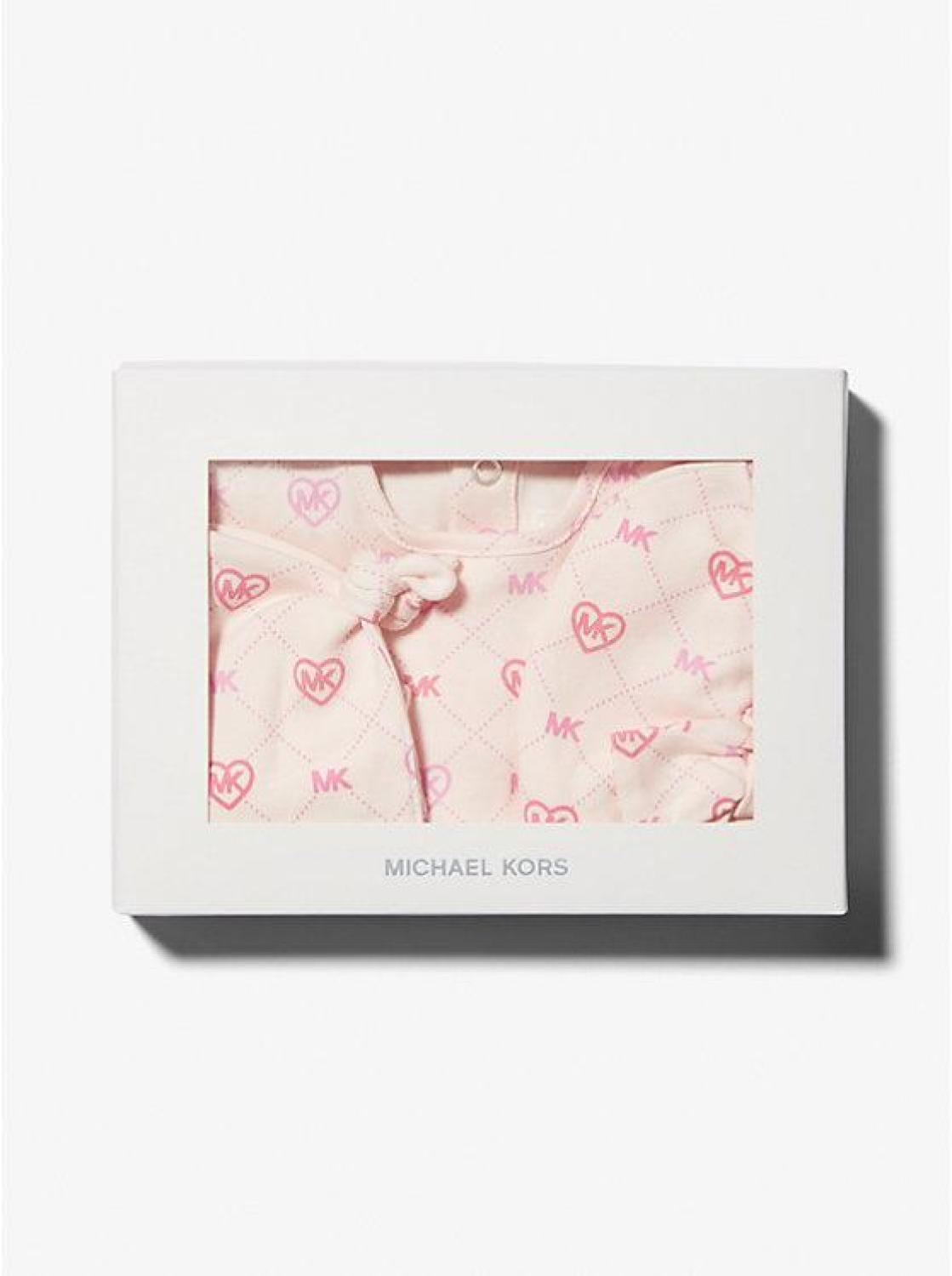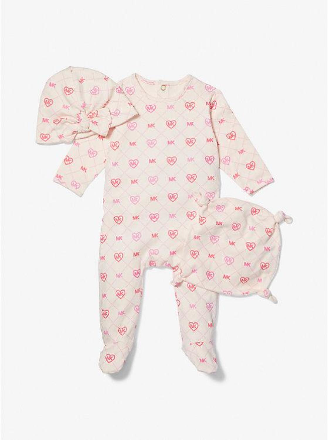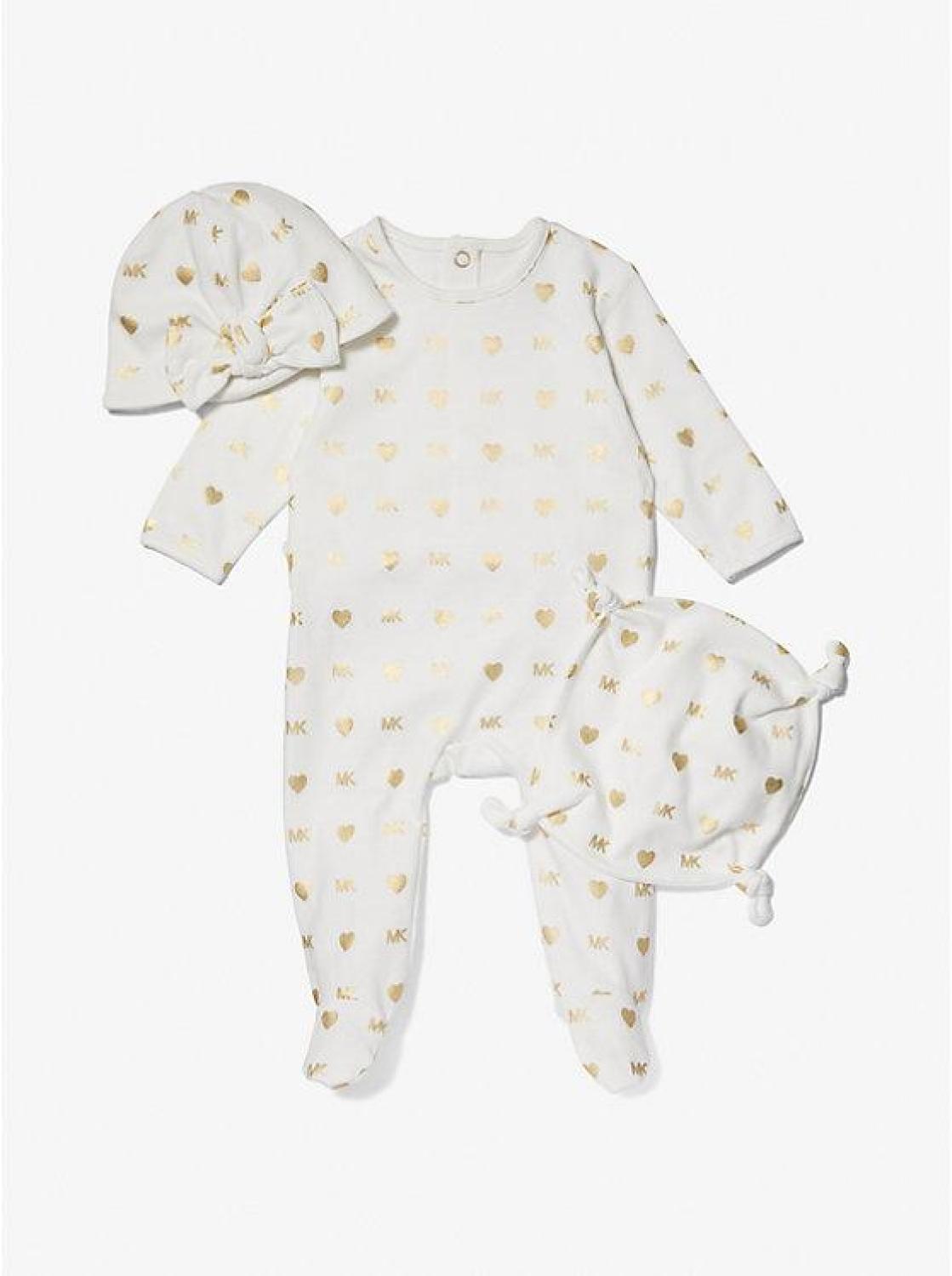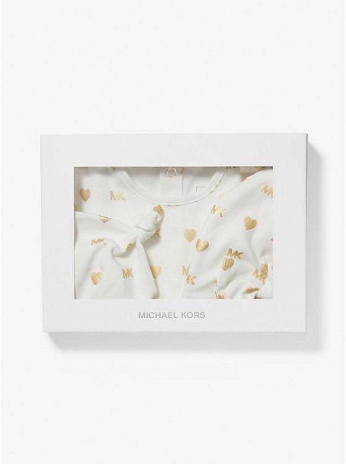 Cute and cozy, this baby gift set is crafted from 100% pure cotton for an ultra-soft feel. Designed with tiny metallic hearts and our MK initials, the onesie features a snap-fastened back for a secure fit. Complete with a matching hat and comforter, it’s a sweet trio to give or receive.