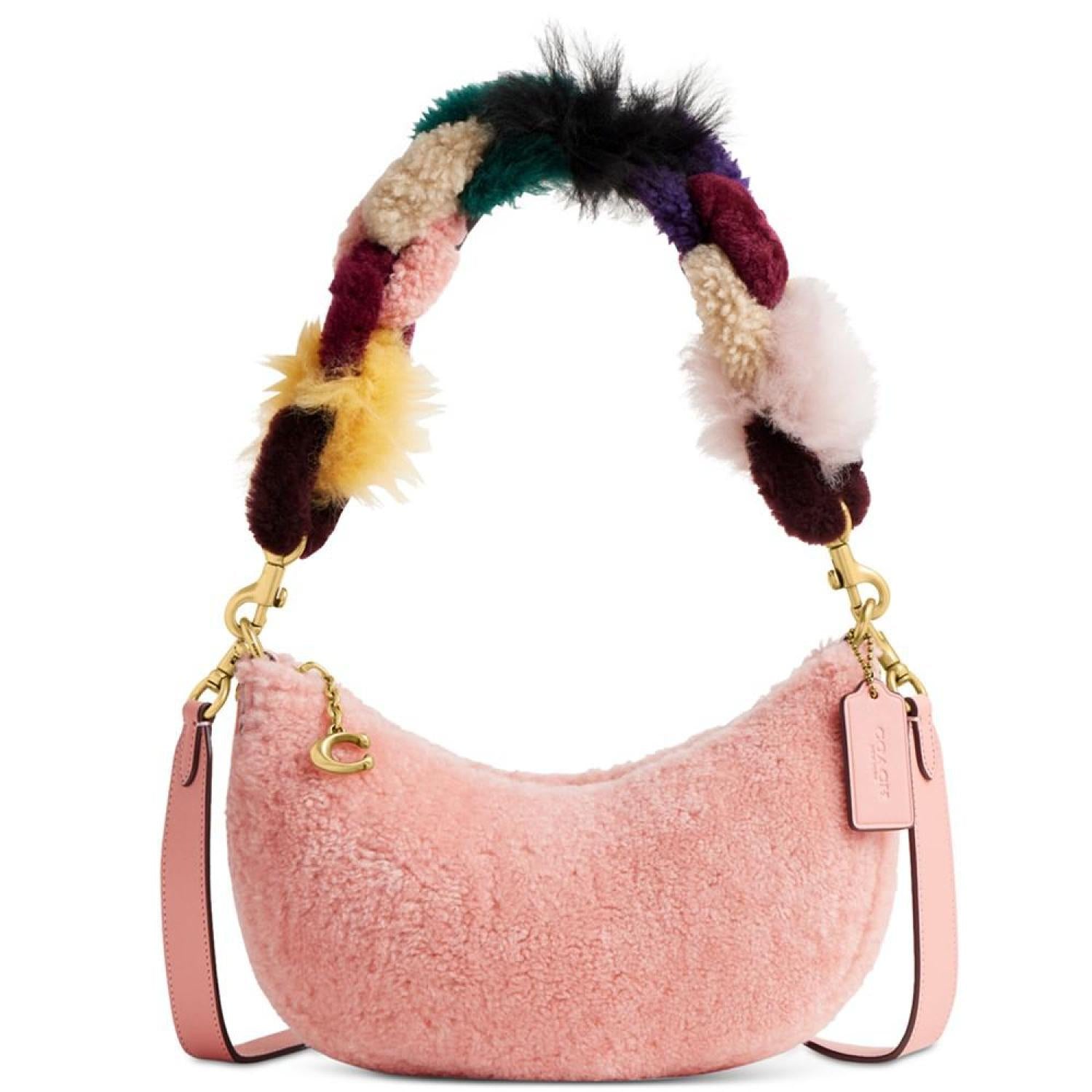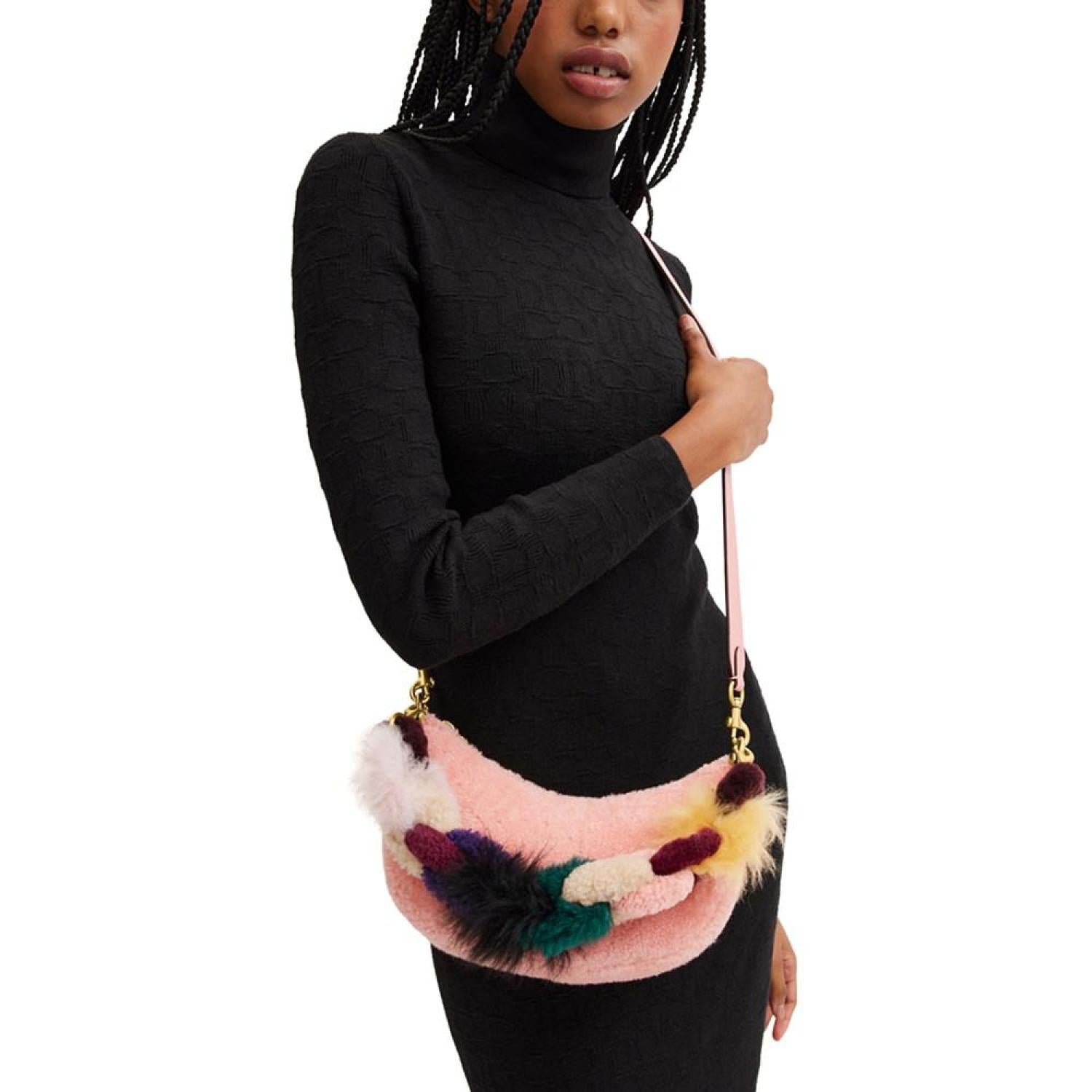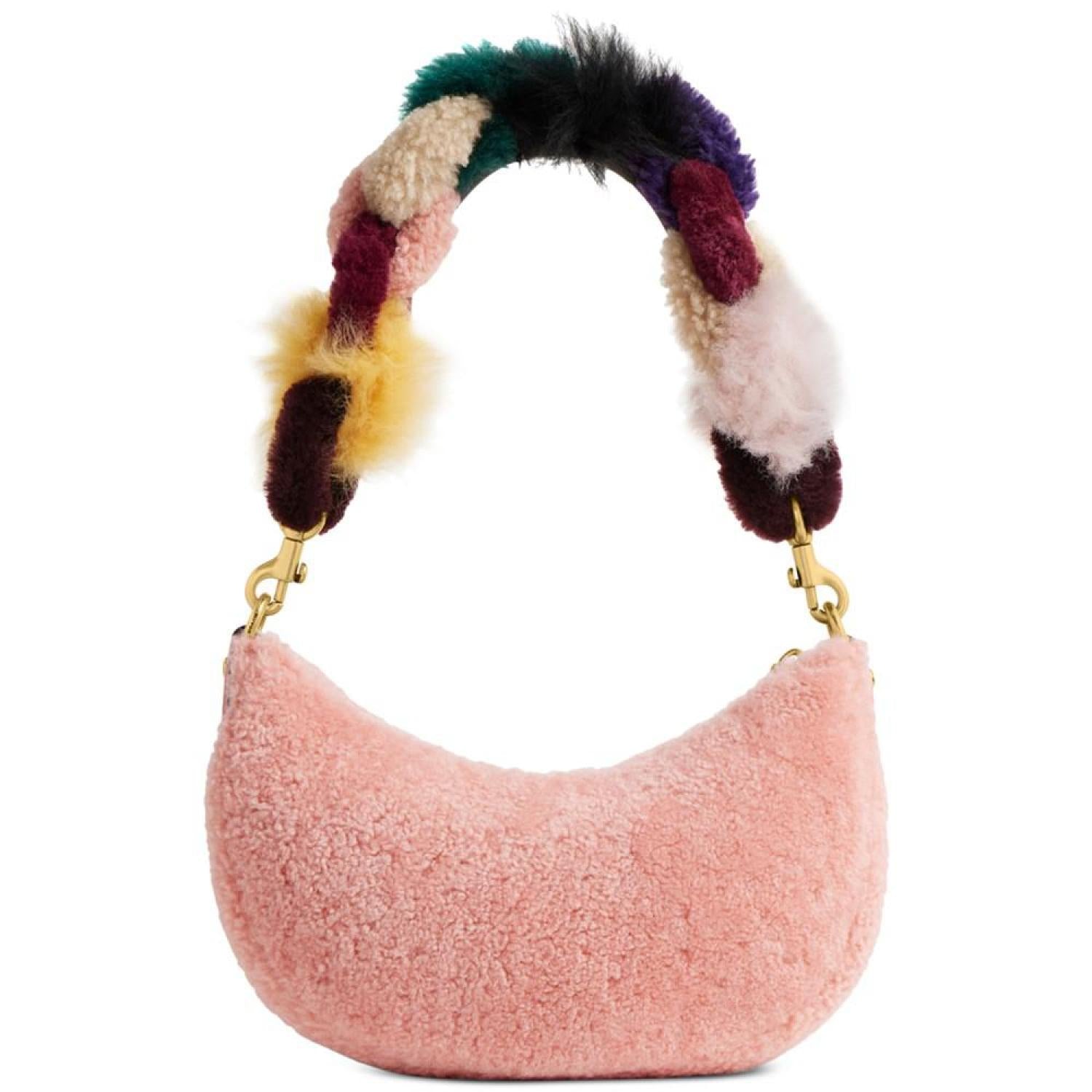 Crafted of plush, colorful shearling and detailed with buttery soft glovetanned leather, this Mira crescent bag is an instant fashion icon. Small sized bag; 9-3/4"W x 6-3/4"H x 2-3/4"D (width is measured across the bottom of handbag); 1.21 lbs. approx. weight Silhouette is based off 5'9" model 10-1/4" removable shearling chain strap; 21-1/2" removable shoulder strap Zip closure Gold-tone hardware Interior snap pocket Genuine, dyed whole shearling; country of origin: Turkey Shearling/leather Spot clean Imported