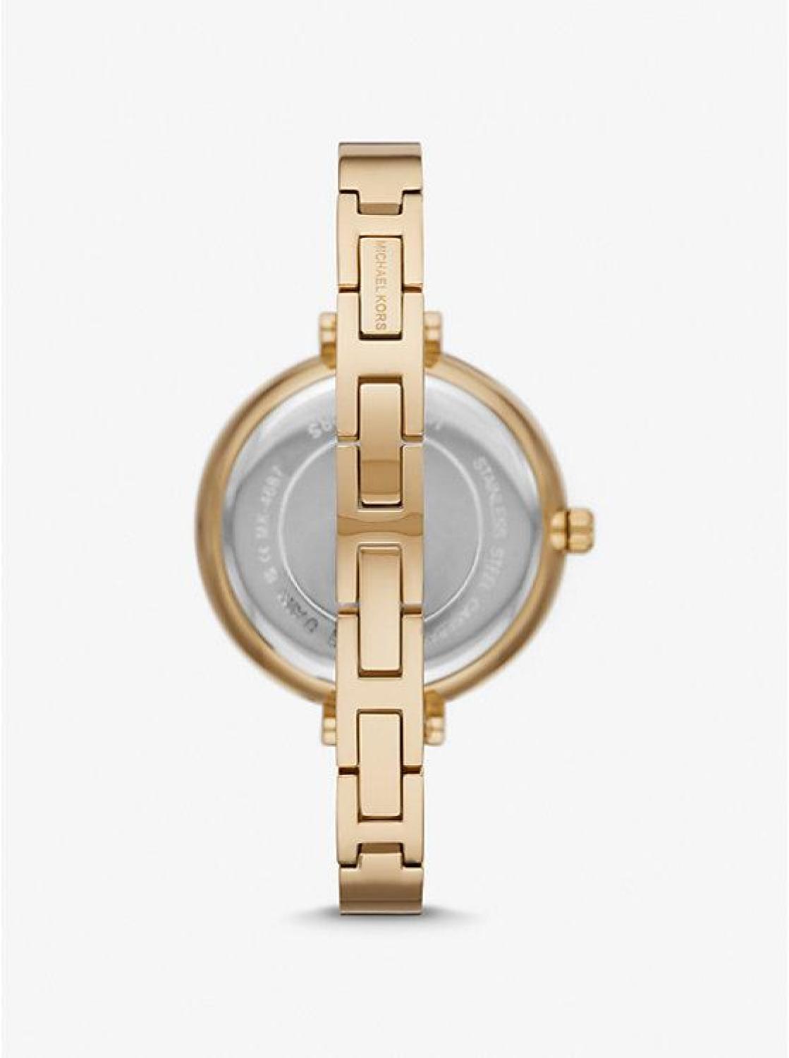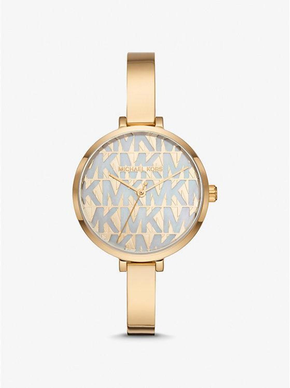 • Meet the Naia: a minimalist gold-tone watch with maximum style. Our allover Signature Logo print adds a novelty twist to the understated dial, while the dainty bangle-inspired strap sits elegantly on your wrist. Understated and modern, it’ll add a polished touch to everyday ensembles.