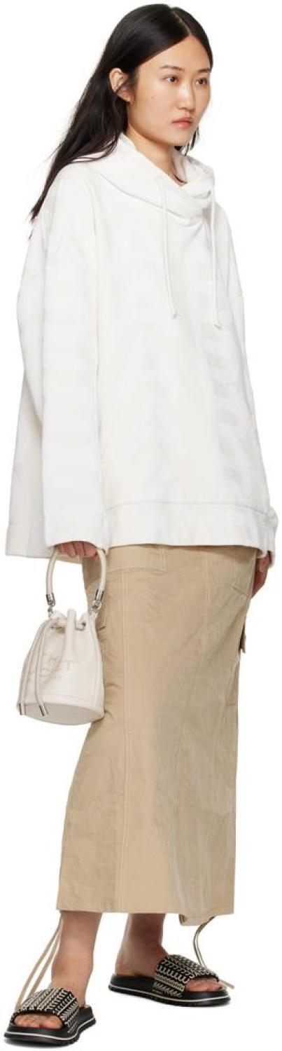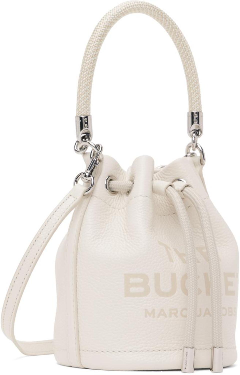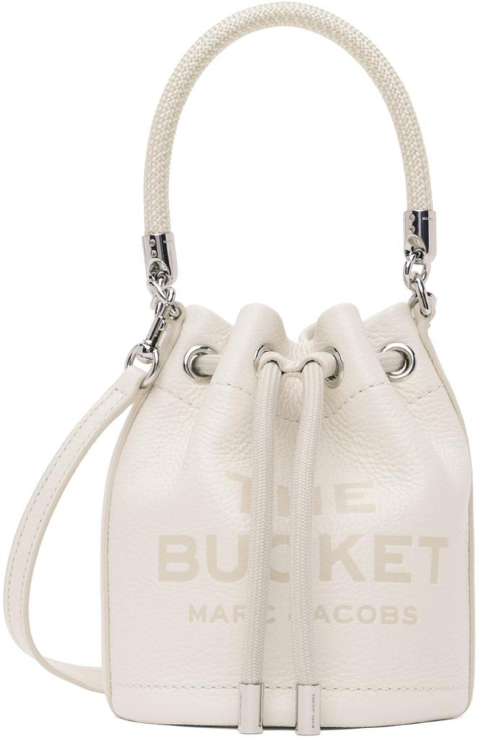 Marc Jacobs Off-White 'The Leather Mini Bucket' Bag Grained leather shoulder bag in off-white. Logo and text printed and embossed at face. · Braided rope carry handle · Detachable and adjustable shoulder strap · Logo patch at back face · Cord-lock drawstring closure · Card slot at interior · Logo-engraved silver-tone hardware · H7 x W5 x D5 in Supplier color: Cotton/Silver Leather. Made in Viet Nam. 232190F048045