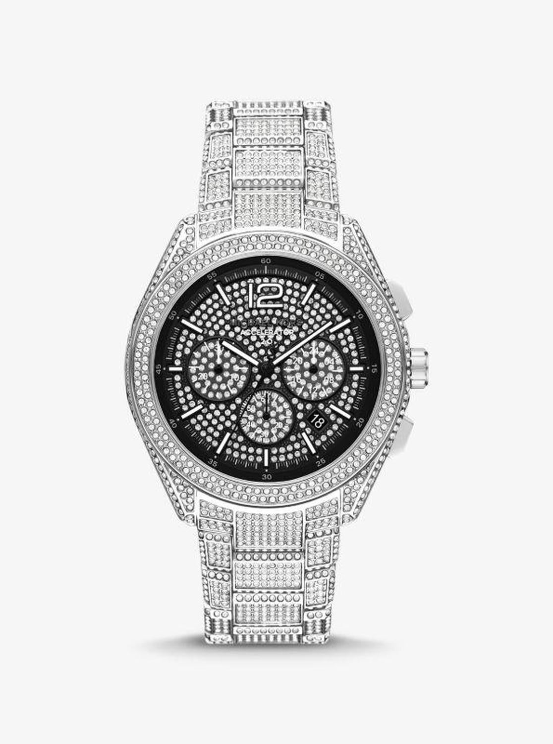 • Meet the Accelerator 2.0. Made from silver-tone stainless steel, this oversized style encourages you to go for the bold. Sparkling pavé comes together with a sporty face that features sleek hour markers, a date dial and a chronograph movement.