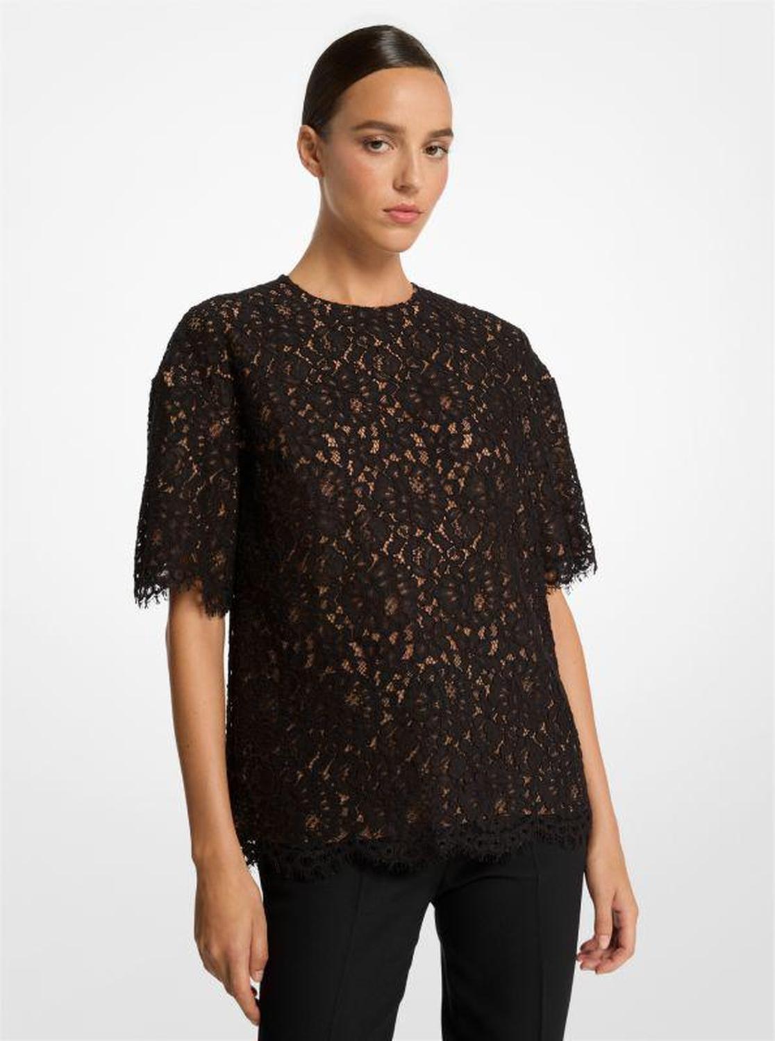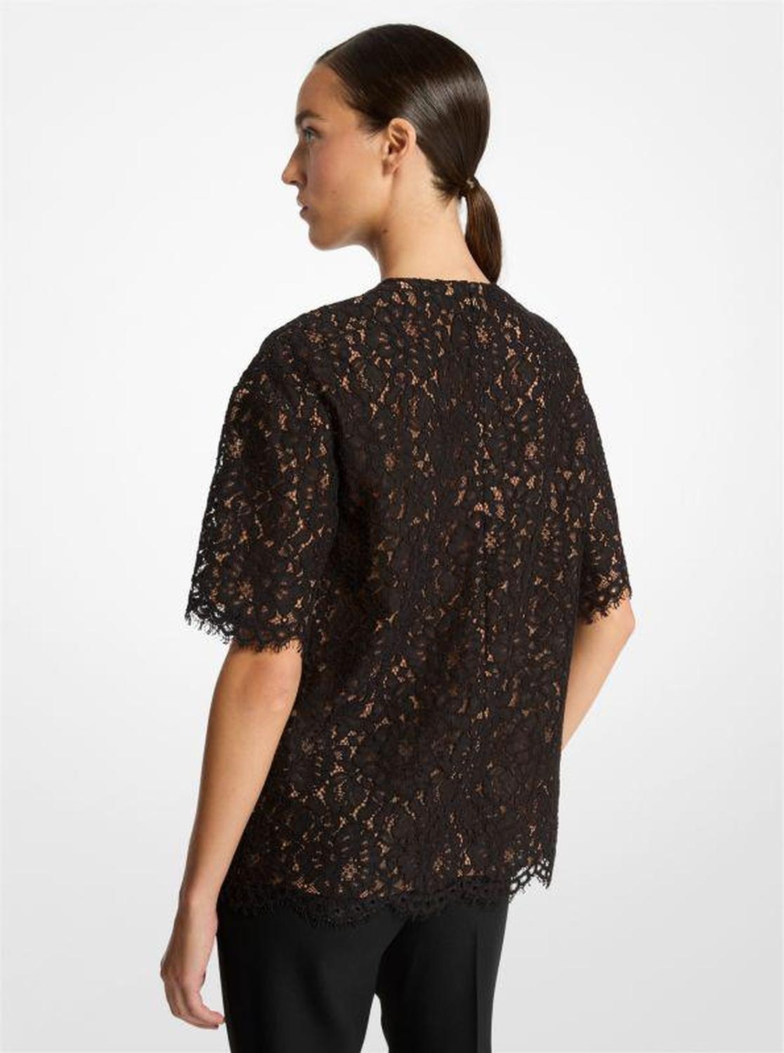 Elevated ease: crafted in Italy, this crewneck T-shirt balances an oversized shape and corded floral lace for a decidedly wearable piece that works any day of the week. • T-shirt • Corded lace • 76% cotton/24% polyamide • Dry clean • Made in Italy • Model is 5’10”/178 cm wearing size XS • T-shirt • Corded lace • 76% cotton/24% polyamide • Dry clean • Made in Italy • Model is 5’10”/178 cm wearing size XS