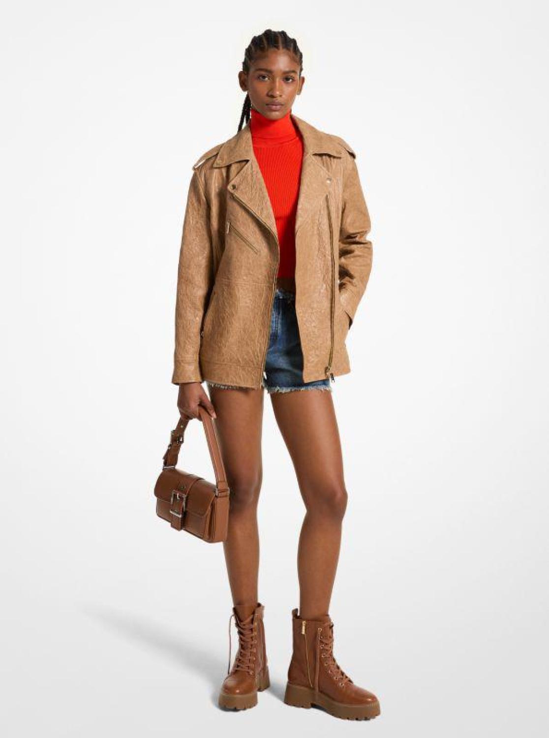 Crafted from buttery crinkled leather with gold-tone hardware, this oversized moto jacket is a rebellious update on the classic. Easy to style with just about anything, it’s an ideal topper over mini dresses, slim jeans and more. • Moto jacket • Leather • 100% leather • Lining: 100% polyester • Zip fastening • Dry clean by leather professional • Imported • Model is 5’10”/178 cm wearing size XS • Moto jacket • Leather • 100% leather • Lining: 100% polyester • Zip fastening • Dry clean by leather professional • Imported • Model is 5’10”/178 cm wearing size XS