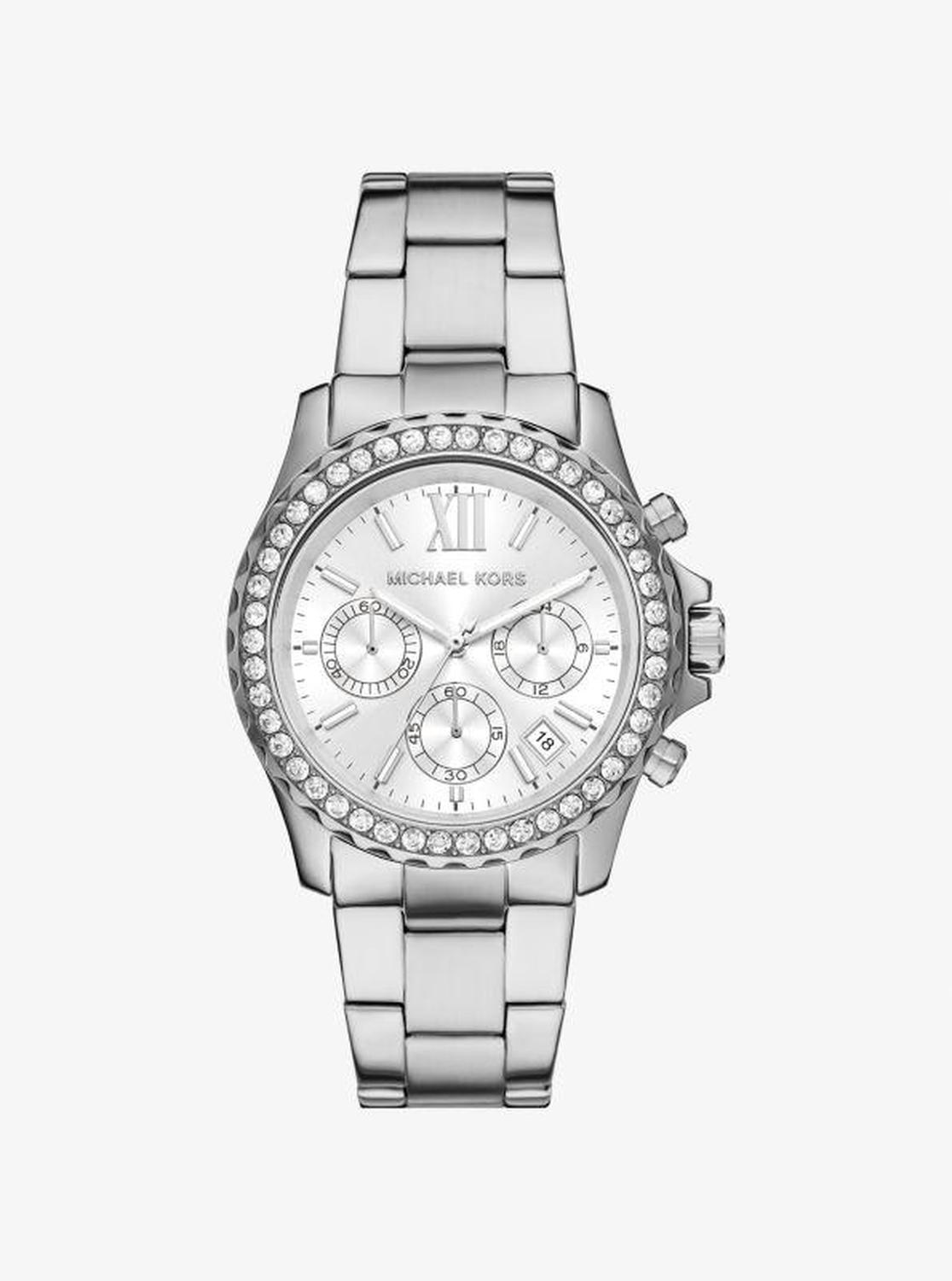 • The iconic Everest watch returns, updated in an oversized silhouette with a glittering pavé-encrusted topring. A silver-tone stainless steel case promises to stand up to endless wear, while the understated dial features chronograph details and a date window for added functionality.