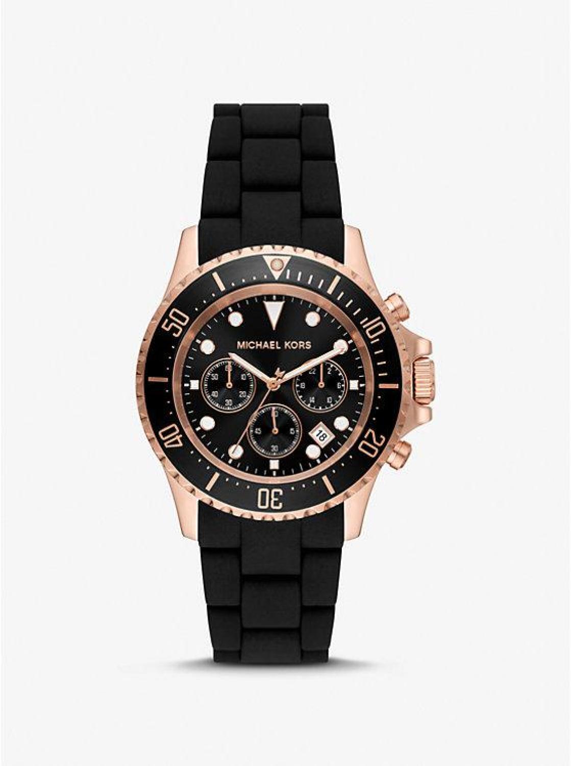 • The iconic Everest watch returns, updated with a silicone bracelet strap. A rose gold-tone stainless steel case promises to stand up to endless wear and turns to reveal Michael’s signature, while the noir dial features chronograph details and a date window for added functionality.