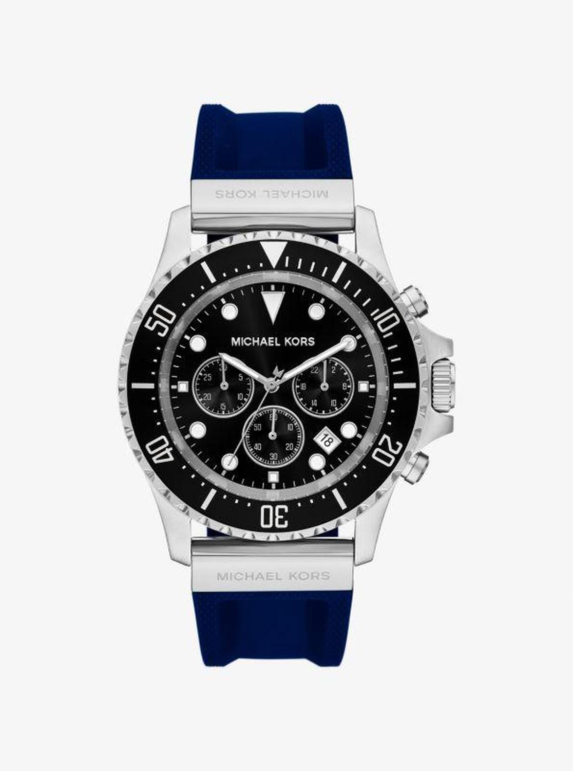 • The iconic Everest watch returns, updated with sporty details like a silicone strap designed for day-long comfort. A stainless-steel case promises to stand up to endless wear, while the noir dial features chronograph details and a date window for added functionality.