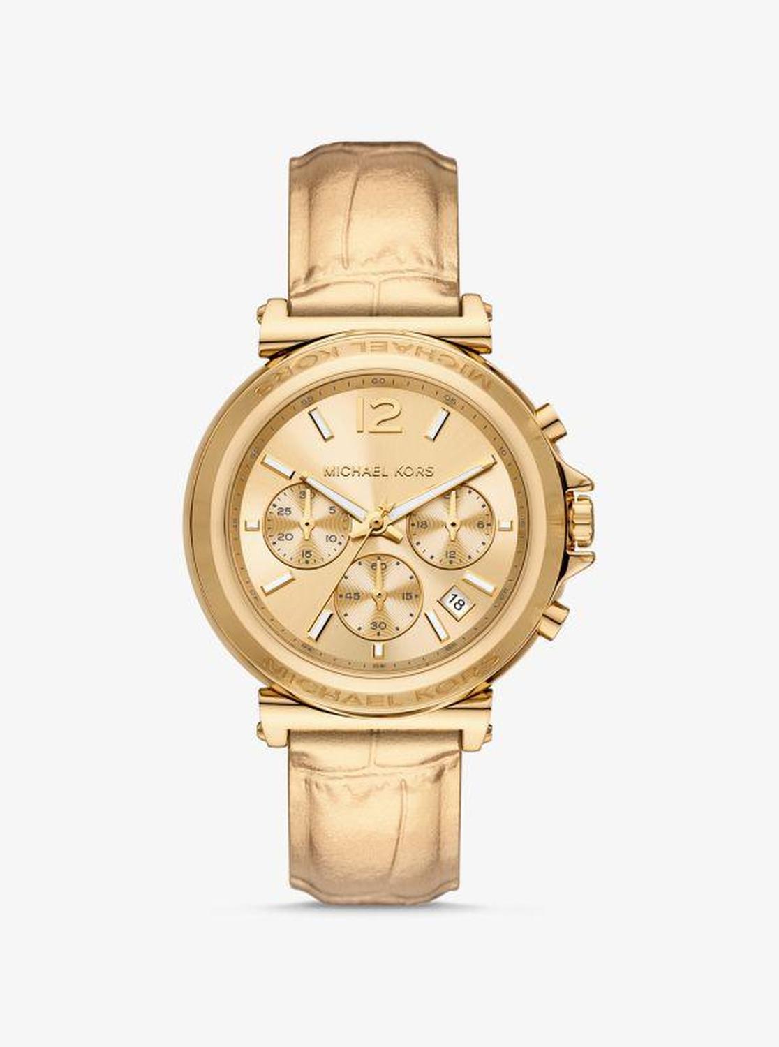 • The Maren watch is designed with an eye-catching elegance that you’ll treasure for years to come. Made from gold-tone stainless steel and complete with a metallic crocodile-embossed leather strap, it’s designed with a chronographic dial to ensure precise timekeeping for your busy schedule.