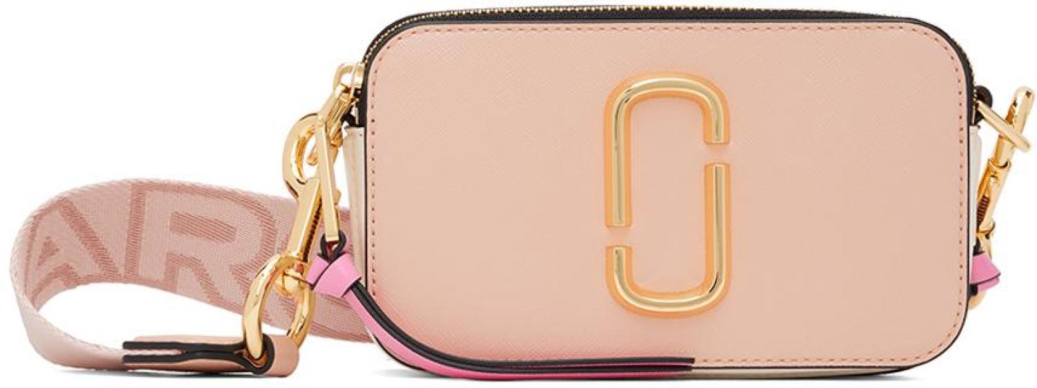 Marc Jacobs Pink 'The Snapshot' Bag Saffiano leather shoulder bag colorblocked in pink, off-white, and yellow. Logo hardware at face. · Detachable and adjustable logo-woven webbing shoulder strap · Logo embossed at top · Patch pocket at back face · Twin zip closures · Patch pocket at two-compartment interior · Cotton faille lining · Gold-tone hardware · H4 x W7 x D2 in Supplier color: Rose multi Leather. Made in Viet Nam. 231190F048044