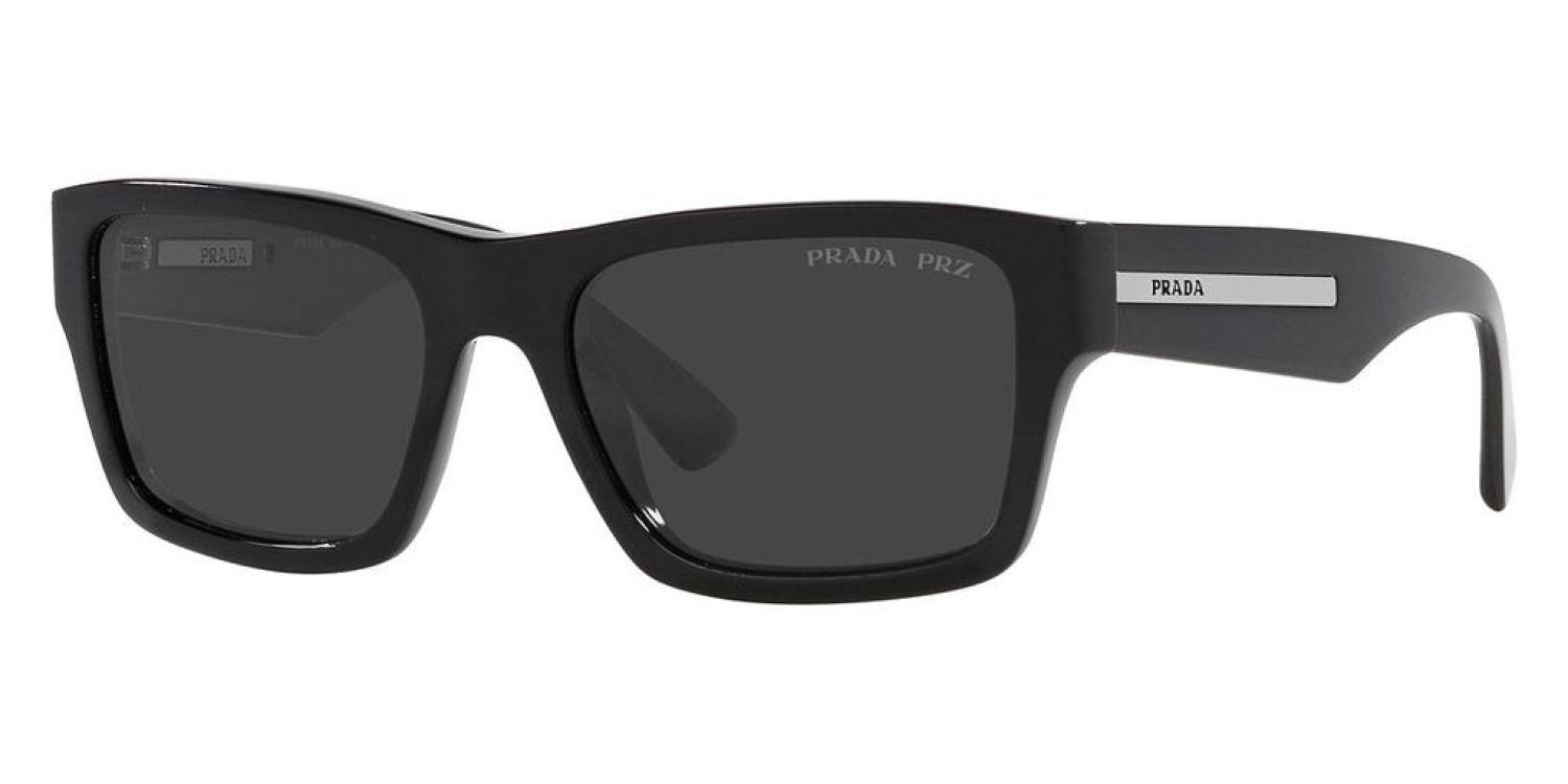 The Prada men's sunglasses measure at 56mm lens width, bridge width, and 140mm arm length. The frame is rectangular-shaped black. The lenses are polarized polar black. Made in Italy. (PR-25ZSF-1AB08G-56)