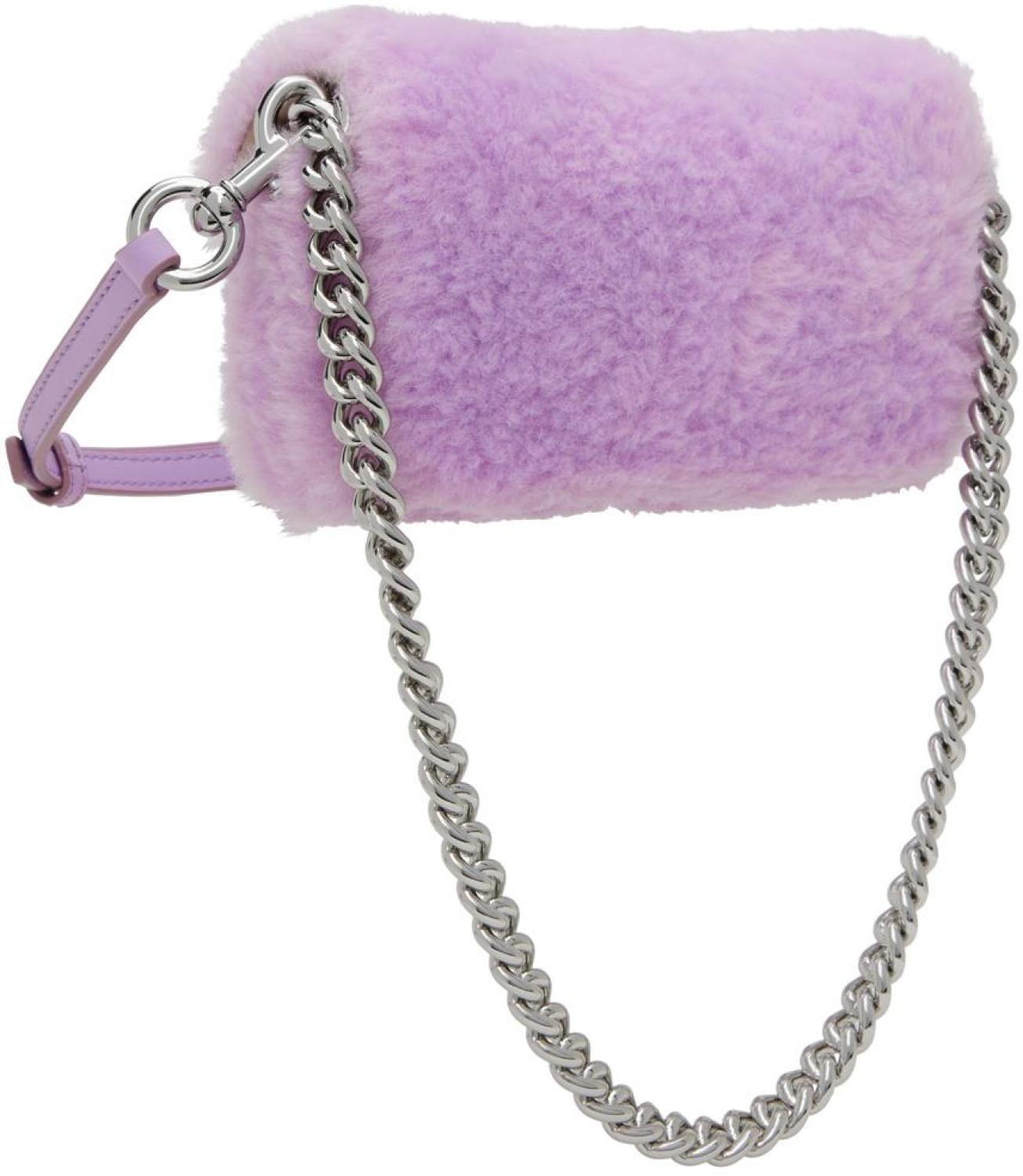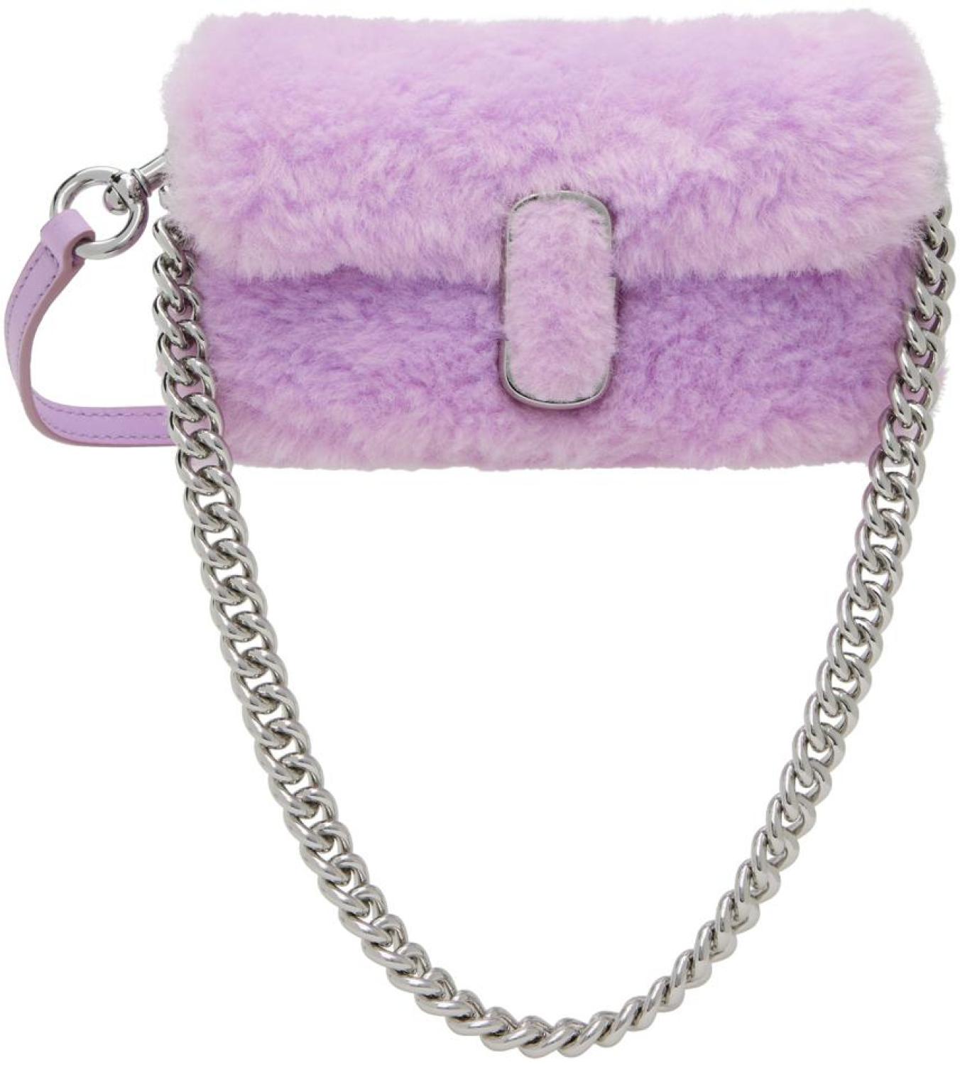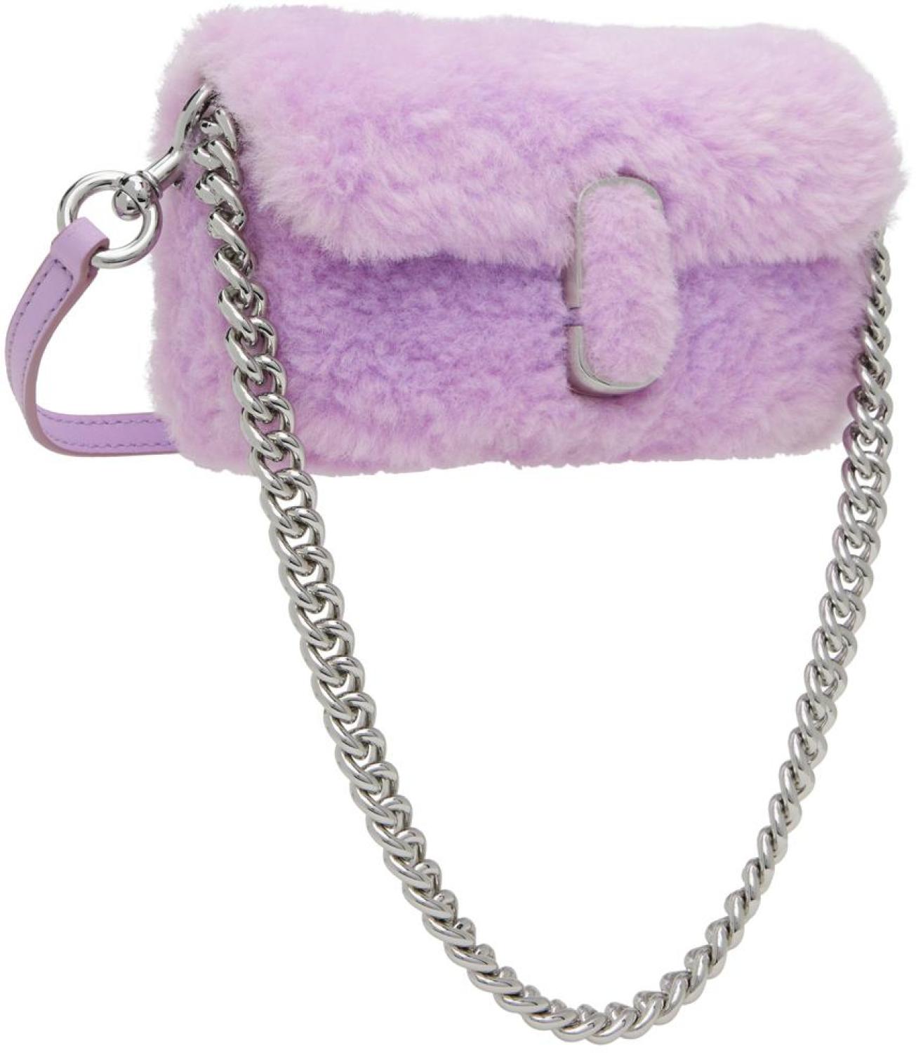 Marc Jacobs Purple 'The Mini Faux-Fur' Bag Faux-fur shoulder bag in purple. Logo hardware at face. · Detachable curb chain shoulder strap · Detachable and adjustable leather shoulder strap · Foldover flap · Zip pocket at interior · Card slots at interior · Buffed leather interior · H5 x W7.5 x D2.5 in Supplier color: Lilac Textile., leather. Made in Philippines. 232190F048179