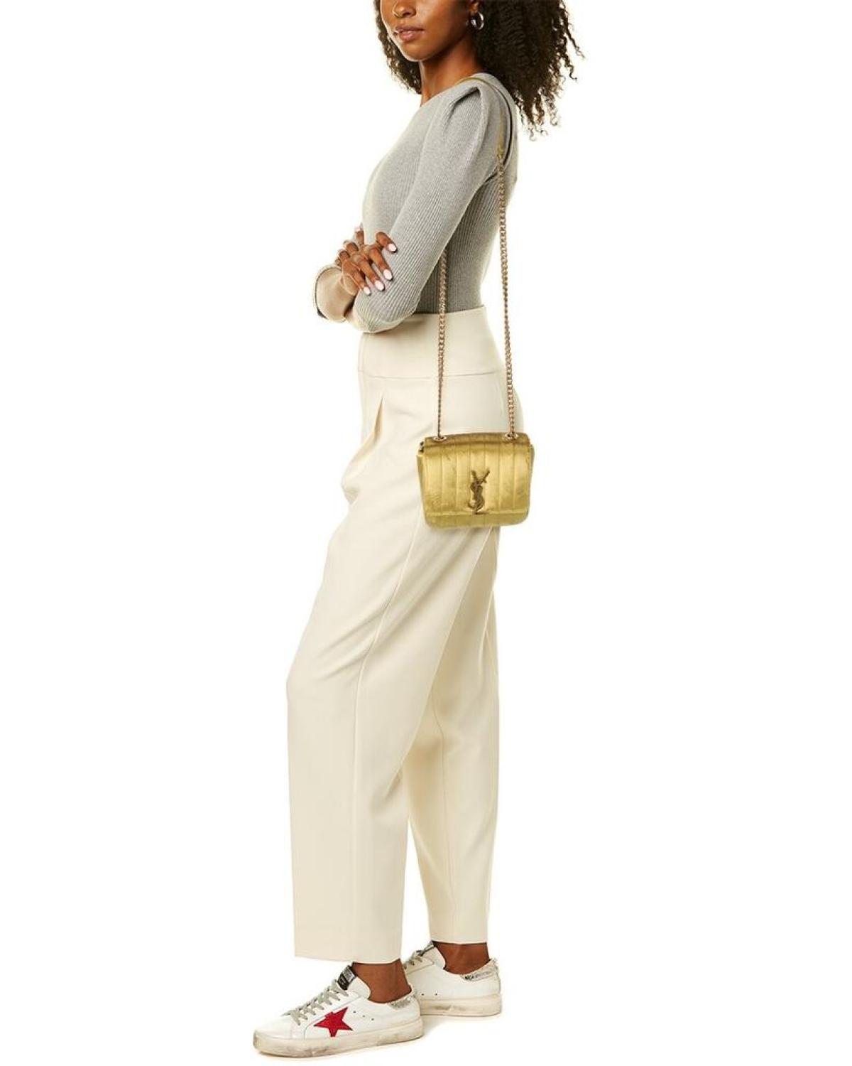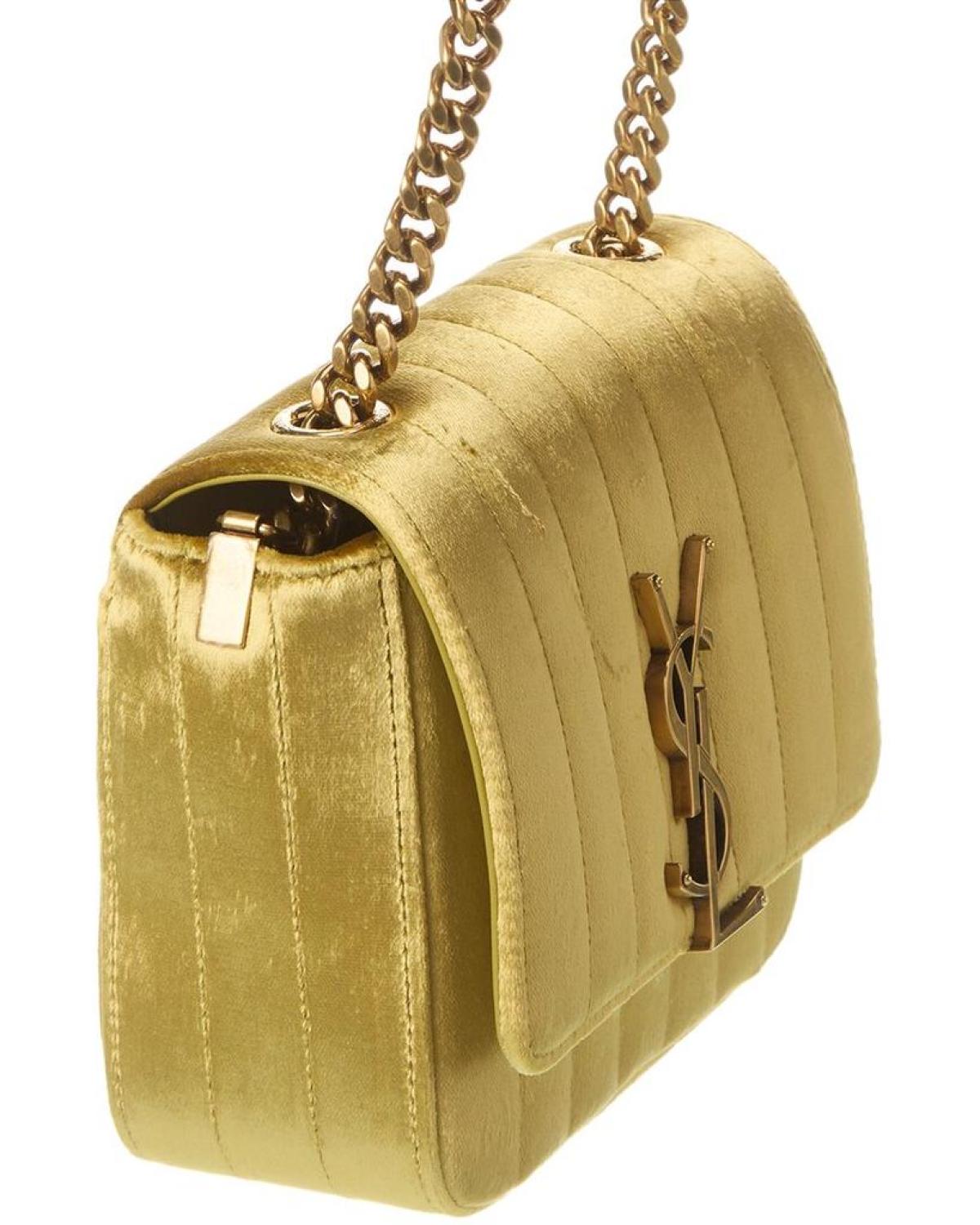 • Introducing the Saint Laurent Vicky Small Matelasse Velour Crossbody, a stunning addition to your collection of handbags. Crafted with meticulous attention to detail, this crossbody bag embodies the iconic, modern glam of the esteemed brand, Saint Laurent.Designed and made in Italy, this crossbody bag showcases the brand's commitment to craftsmanship and luxurious quality. Its exquisite gold velour material adds a touch of opulence to any outfit, making it the perfect accessory for both casual and formal occasions.With its gold-tone hardware and exterior pocket, this crossbody bag combines functionality and style effortlessly. The fold-over flap with a magnetic closure ensures the security of your essentials, while the interior leather lining and interior pocket keep your belongings organized.Measuring at 6.8 inches wide, 5.7 inches high, and 2.5 inches deep, this compact yet spacious crossbody bag provides enough space for your daily essentials. The shoulder strap, with a drop of 22 inches, allows for convenient and comfortable wearability.Please note, all measurements were taken by hand and are approximate; slight variations may occur. Rest assured, our products are 100% genuine. While we may occasionally source merchandise from trusted independent suppliers, we guarantee the authenticity of every product sold on our site.Upgrade your style with the Saint Laurent Vicky Small Matelasse Velour Crossbody. Shop now and experience the epitome of elegance and sophistication.