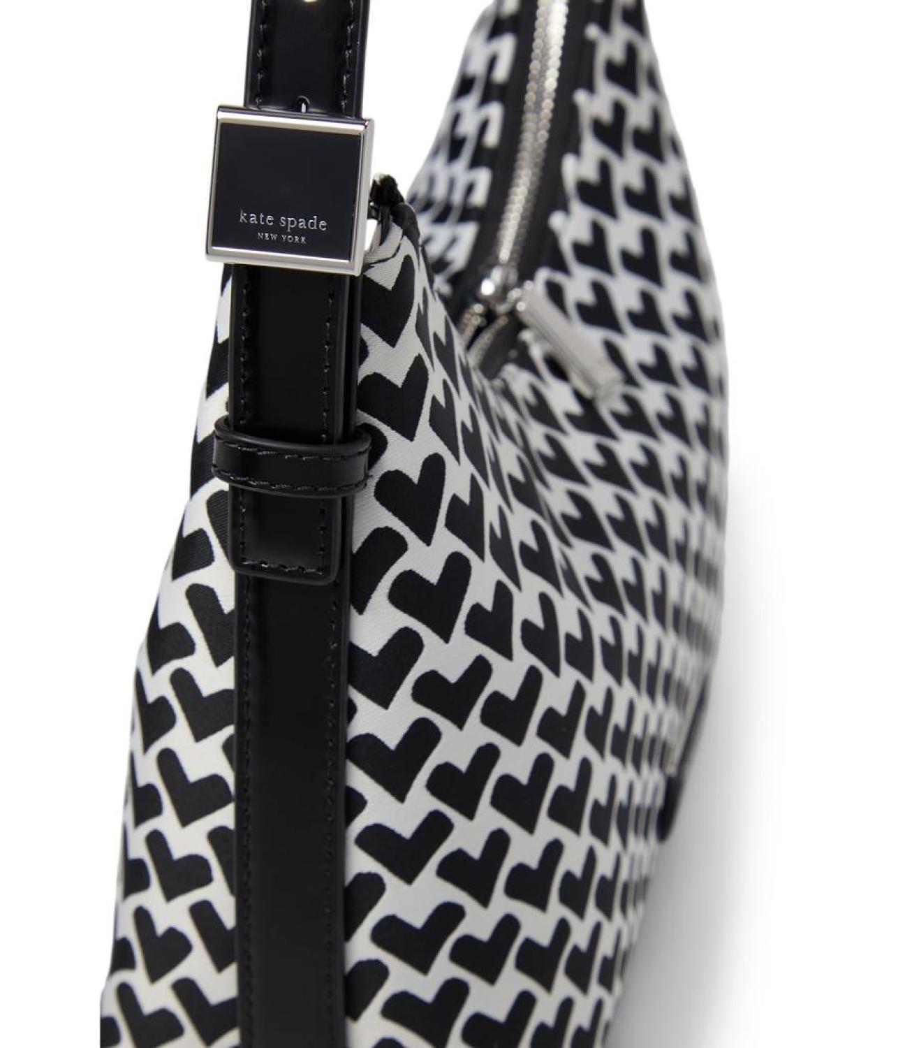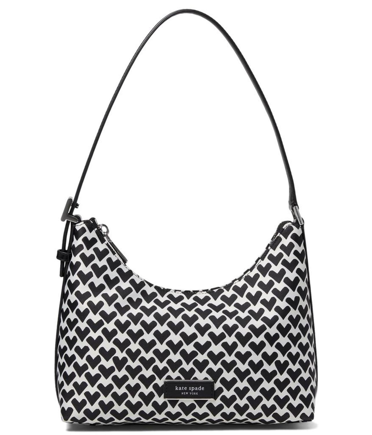 Elevate your accessory game with the Kate Spade New York® Sam Icon Modernist Hearts Jacquard Fabric Small Shoulder Bag. This charming shoulder bag effortlessly combines timeless style with a playful twist, making it a must-have for fashion enthusiasts. It features a jacquard fabric adorned with modernist heart patterns. Its compact size makes it perfect for everyday use, while the adjustable shoulder strap allows for a customizable fit. Textile construction. Zipper-top closure. One zipper and one slip-in compartment in the interior. Dust bag included. Textile lining. Imported. Please note, the hardware color and interior lining may differ from the color shown in the photo. Measurements: Bottom Width: 10 in Depth: 3 1/2 in Height: 5 1/2 in Handle Length: 20 in Handle Drop: 10 in Weight: 11 oz