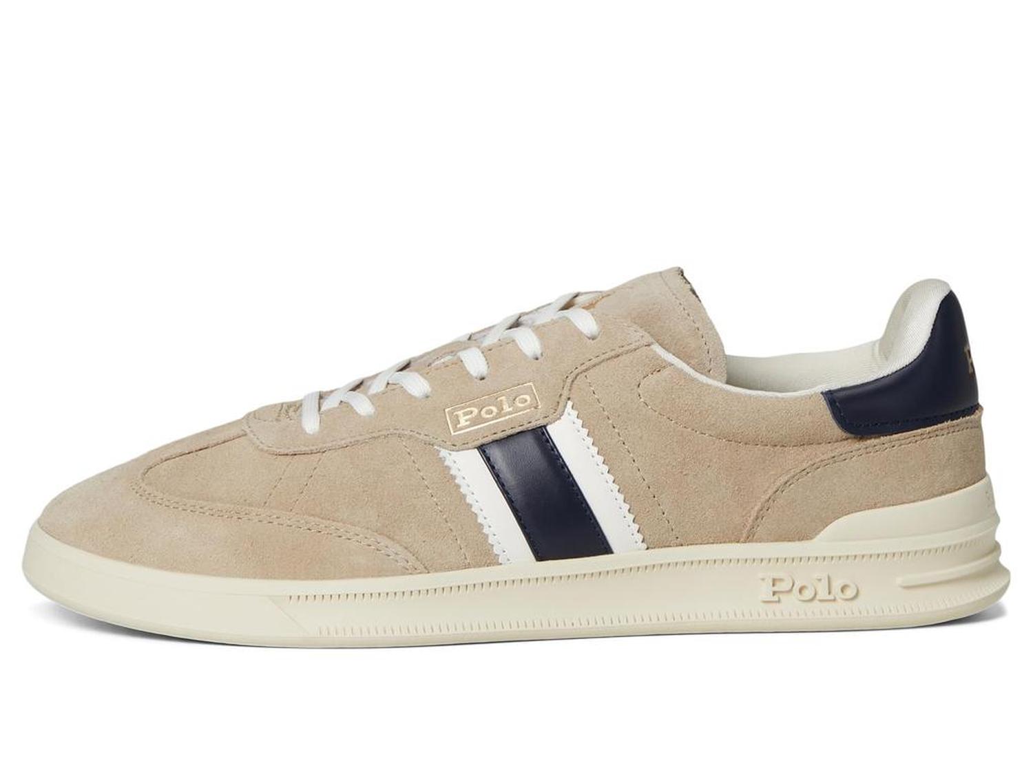 • The Polo Ralph Lauren® Heritage Aera Suede Sneakers update Polo's classic sneaker with a vintage-inspired silhouette realized in suede upper. Featuring a rubber cupsole construction with integrated heel support and a dual-compound EVA midsole, it is detailed with leather stripes at the side and embossed logo accents. The low-top shoes have polyester lining, padded mesh insole, reinforced heel with leather heel tab, and textured rubber outsole.