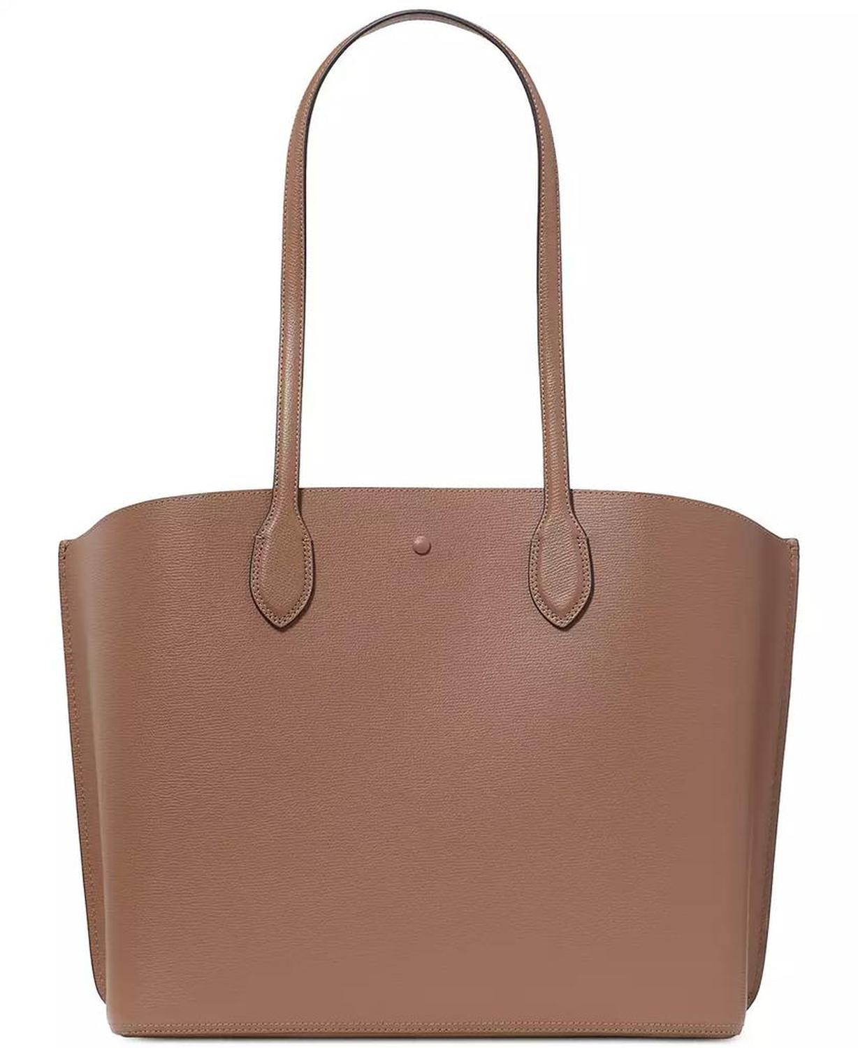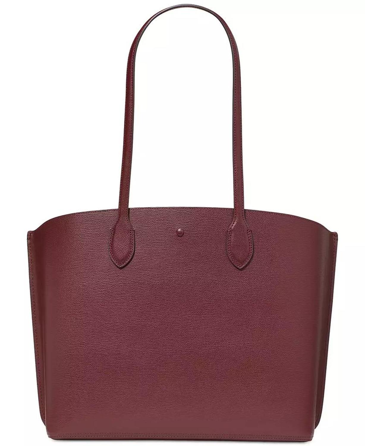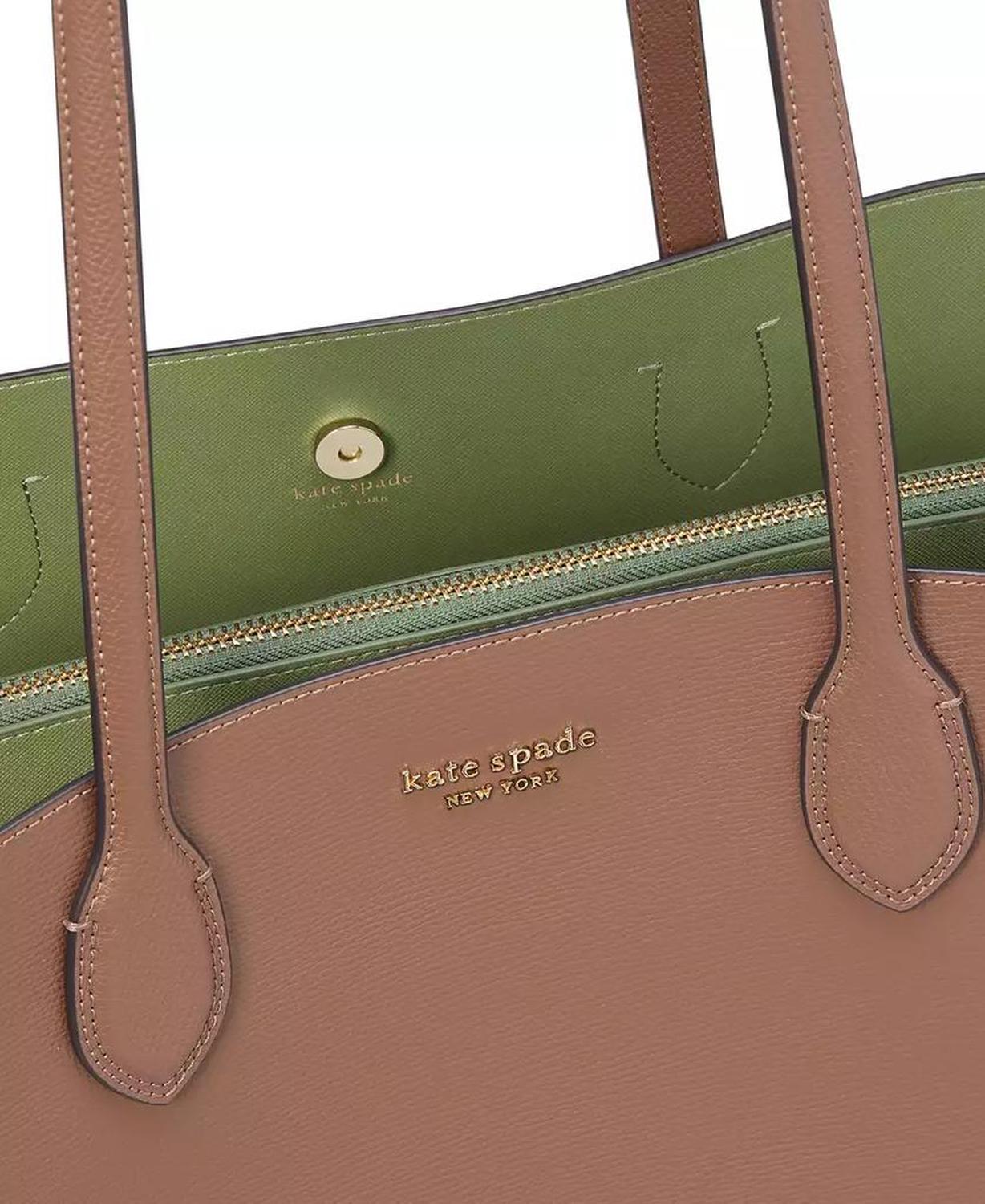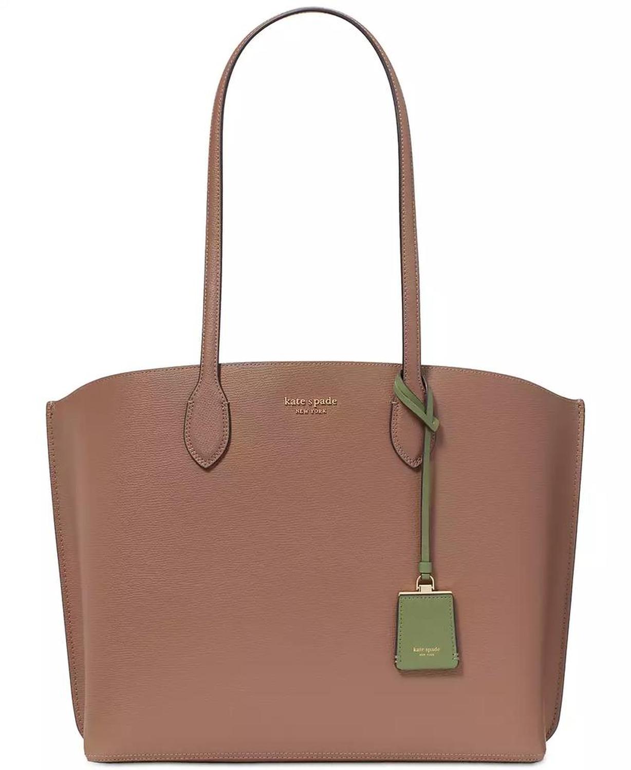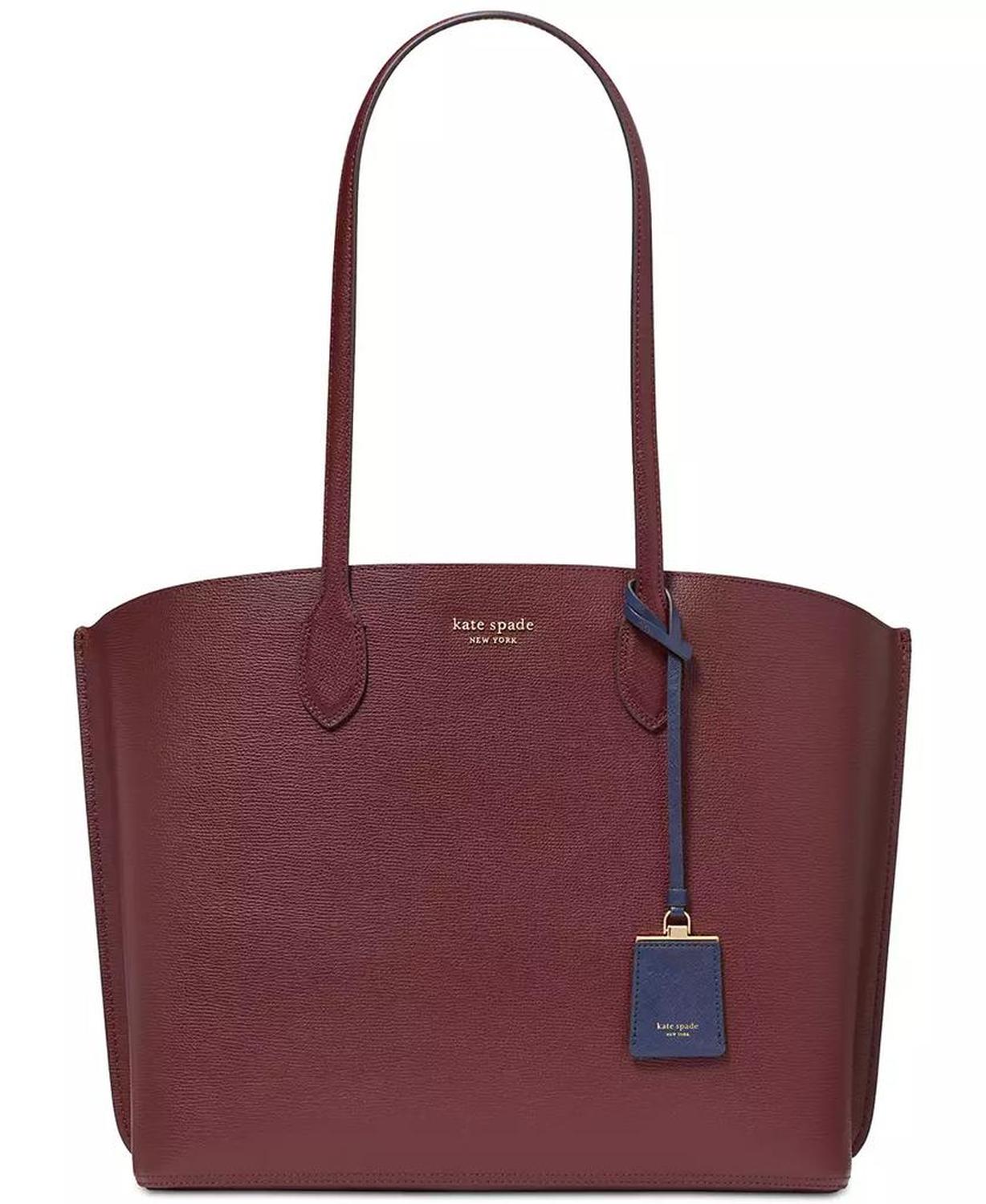 Bring your A-game to work with the new Suite tote by kate spade new york . It's made from durable crossgrain leather and holds everything you need for the day. It's the chic and practical essential you've been looking for! Large sized bag; 12"W x 14-1/5"H x 5-2/5"D (width is measured across the bottom of handbag); 1 lbs. approx. weight Silhouette is based off 5'9" model 11-1/2"L top handles Magnetic snap closure Pale gold-tone hardware, luggage tag & logo Interior center zip compartment Leather Spot clean Imported