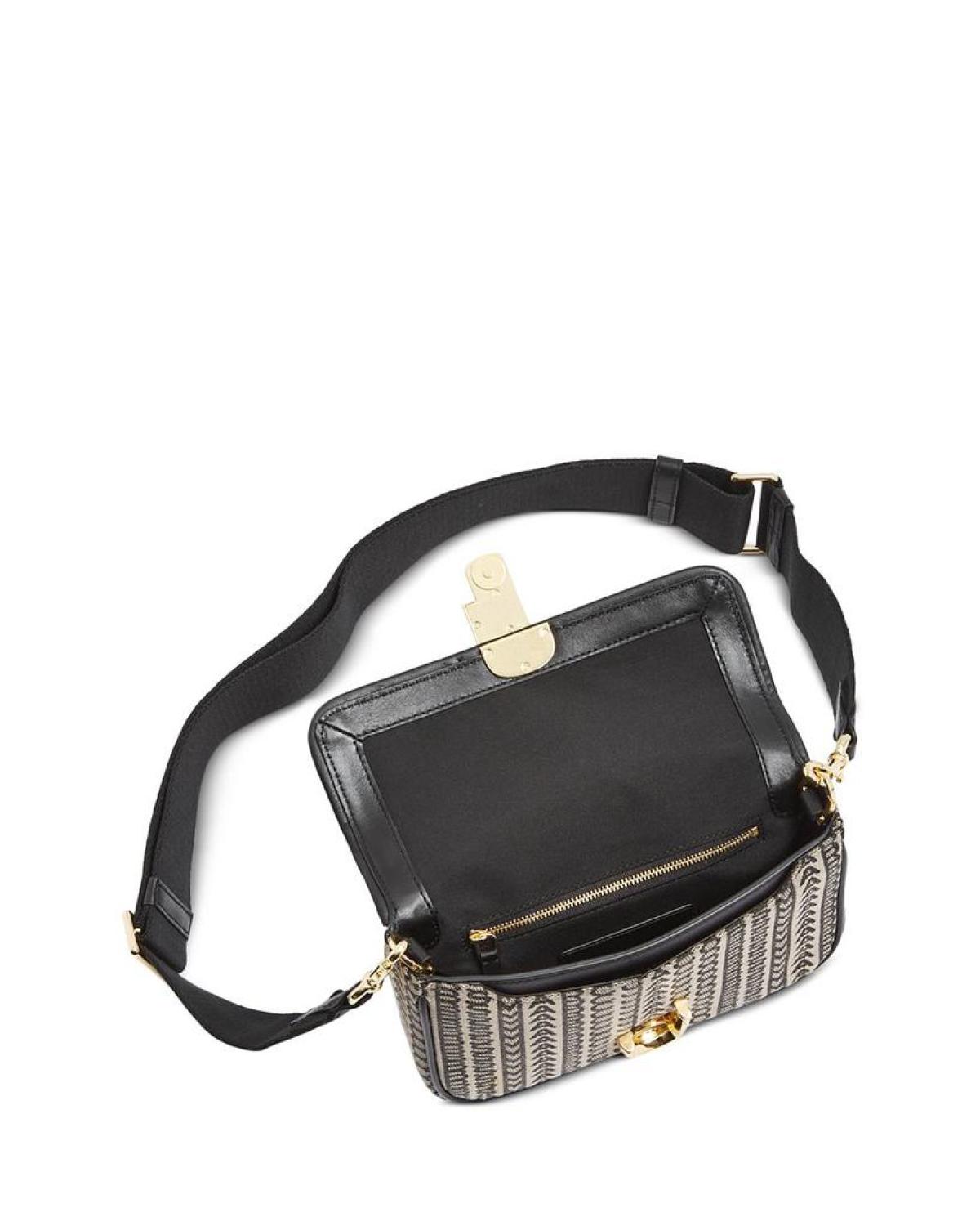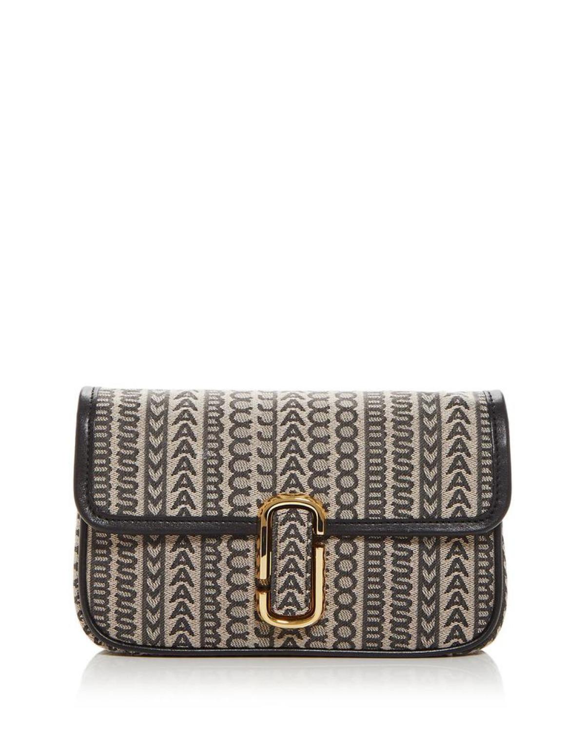 Removable shoulder strap, 8.5" drop Adjustable, removable crossbody strap, 18" drop Dimensions: 9"W x 1.5"D x 5.5"H Snap flap closure Exterior slip pocket, interior zip pocket, interior slip pocket Woven monogram design Gold-tone hardware Logo hardware at clasp, logo patch at back Leather trim details Mannequin model measurements: 5'10" height, wearing a size 4 or small Lined Cotton/polyester Imported Web ID: 4564154