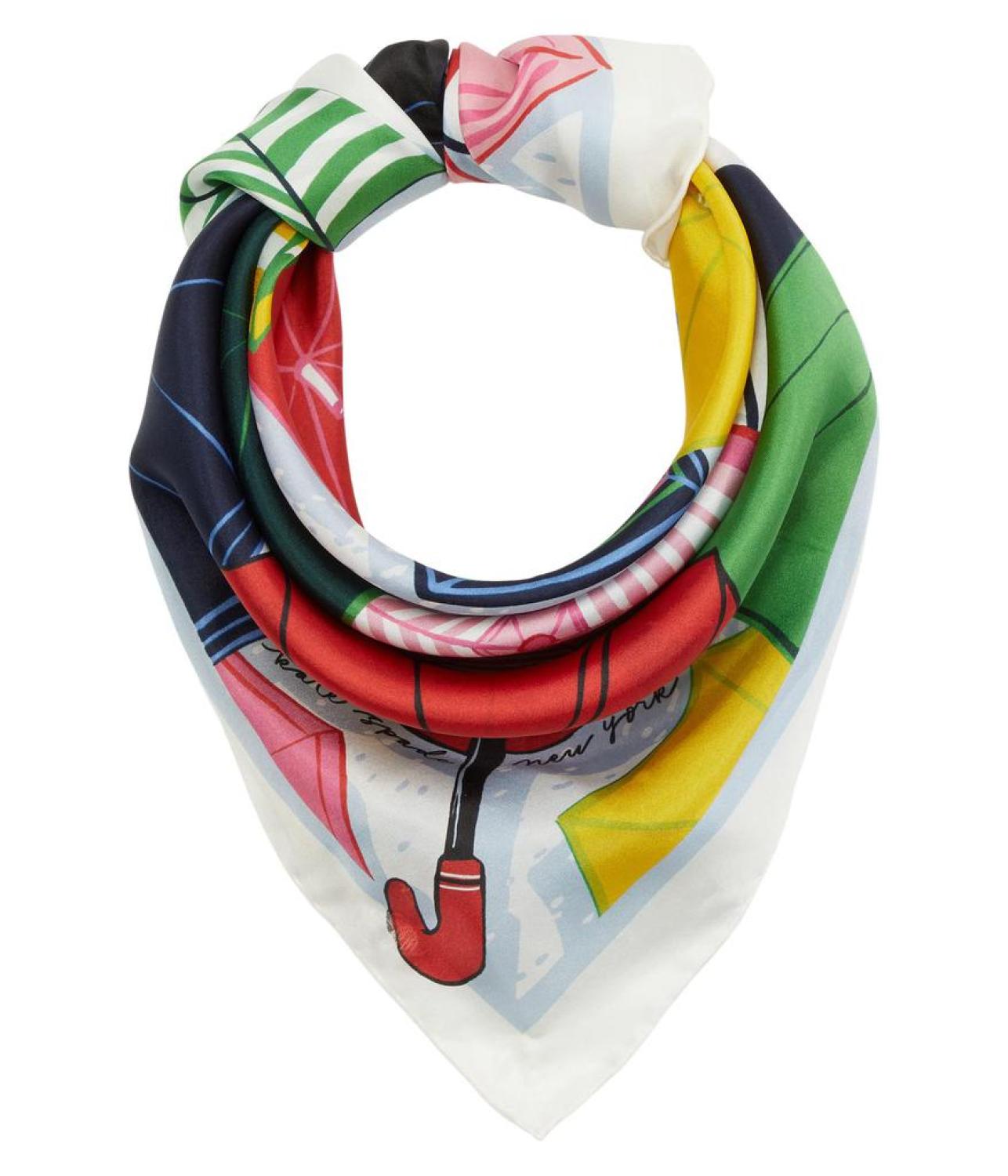 • Add a bit of pep to your basic style by accessorizing with the bright and colorful Kate Spade New York® Umbrella Silk Square Scarf.