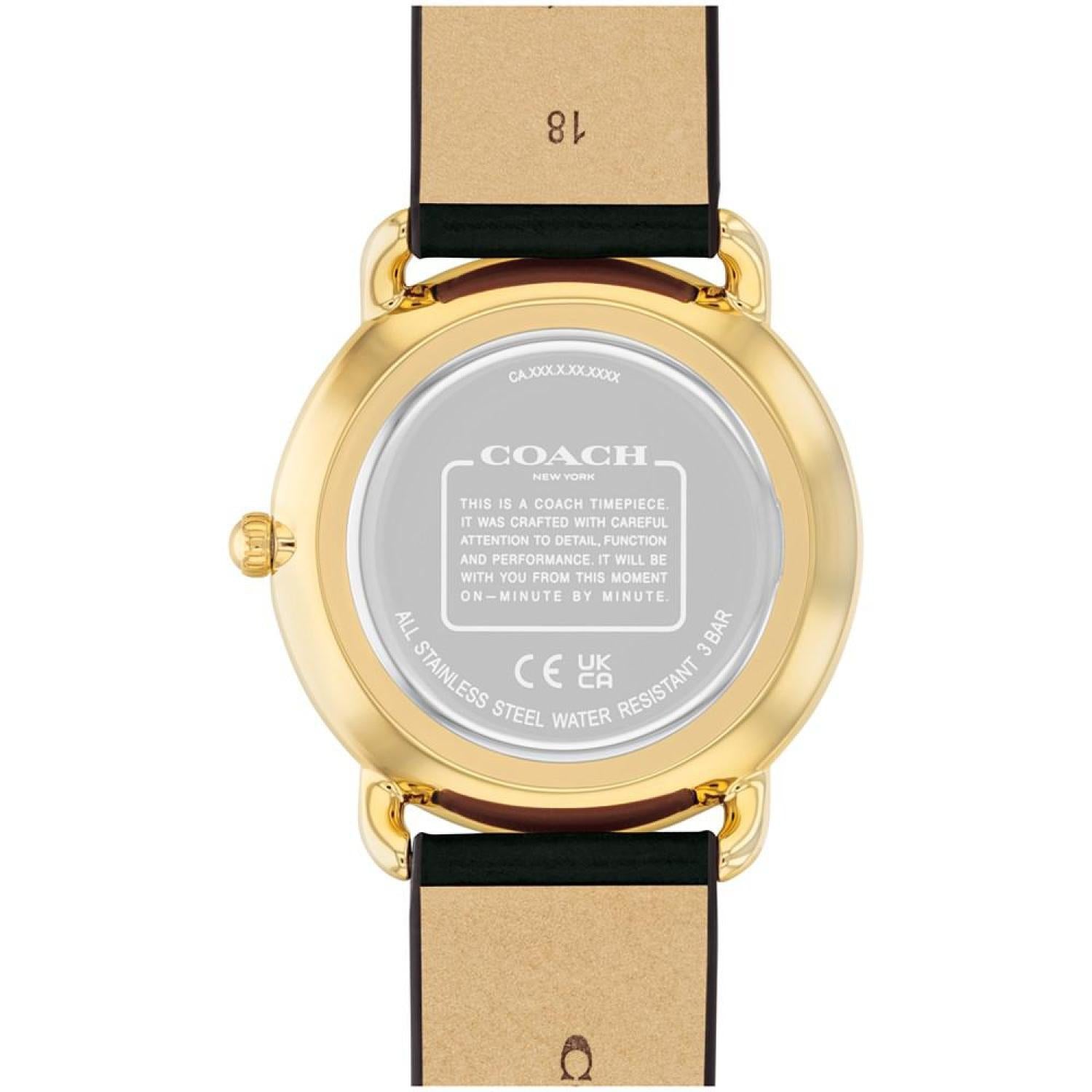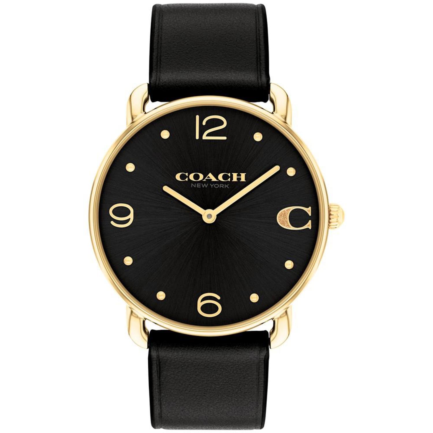 • With clean lines and a modern minimalist sensibility, the Elliot is a true design classic ready for workdays and weekends. Finished with a black leather strap, this gold-tone round watch features a black sunray dial detailed with the COACH Signature marker at 3 o' clock. Style #14504245.