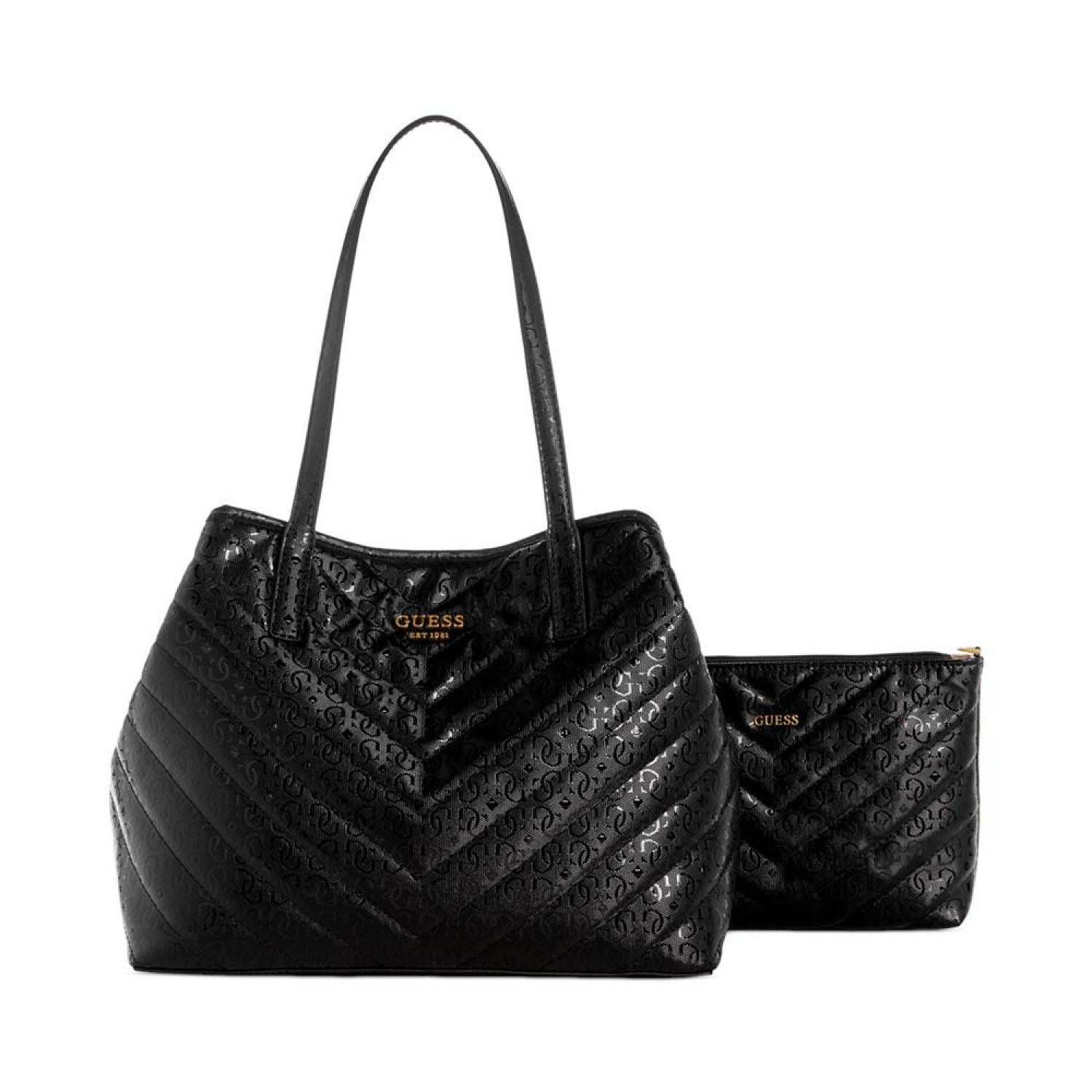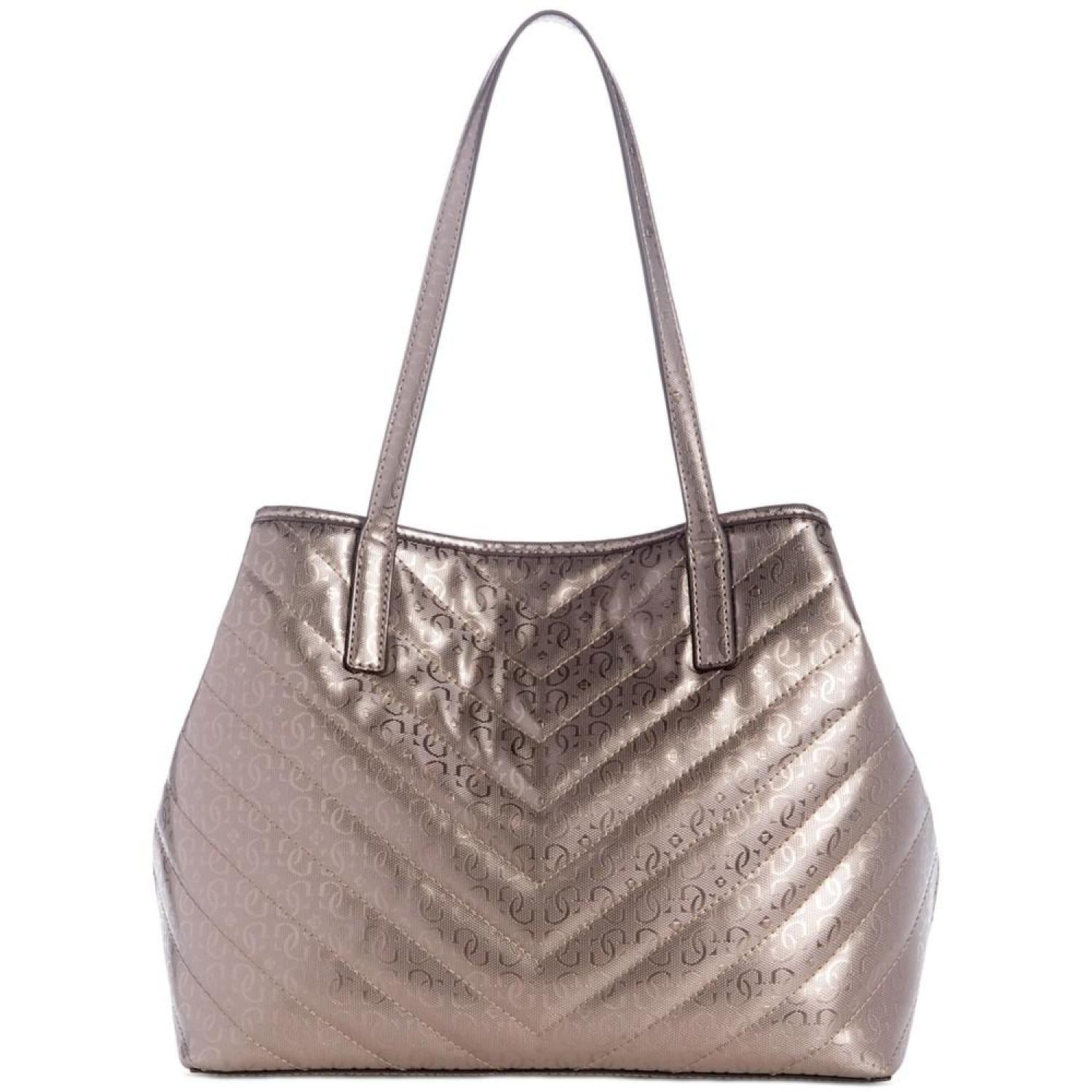 Showcasing subtly shimmering classic monogram with quilting details, this tote by GUESS comes with a removable pouch for custom organization. Sized to take on the day, this fabulous accessory easily fits a tablet along with your other necessities. Medium sized bag; 13"W x 11"H x 6"D (width is measured across the bottom of handbag); 1.21 lbs. approx. weight Silhouette is based off 5'9" model 9"L shoulder straps Magnetic snap closure Gold-tone hardware & logo Open interior with removable 10-1/2" x 7" pouch Tablet compatible (std. size 8"-10") Polyurethane Spot clean Imported