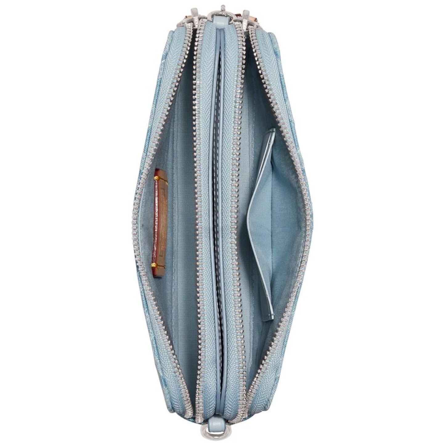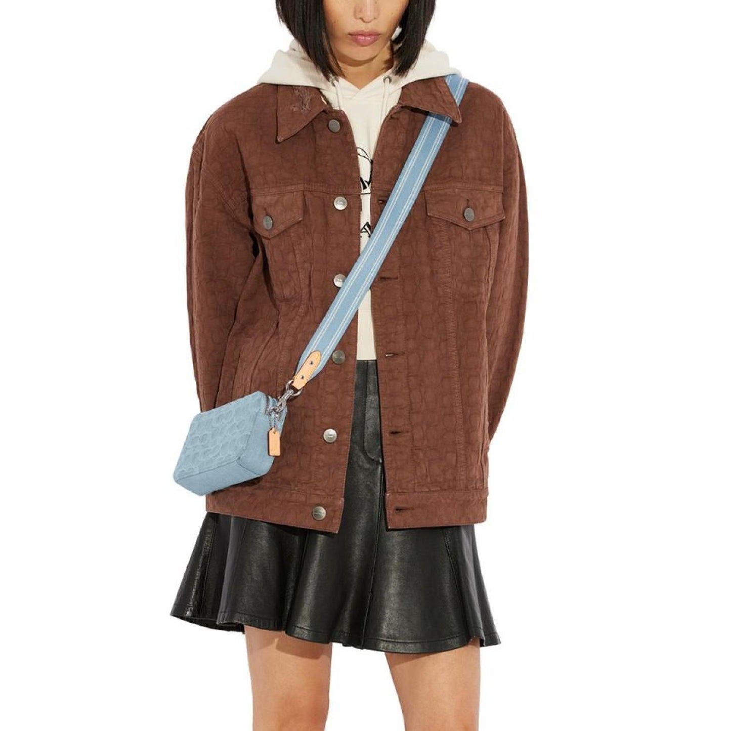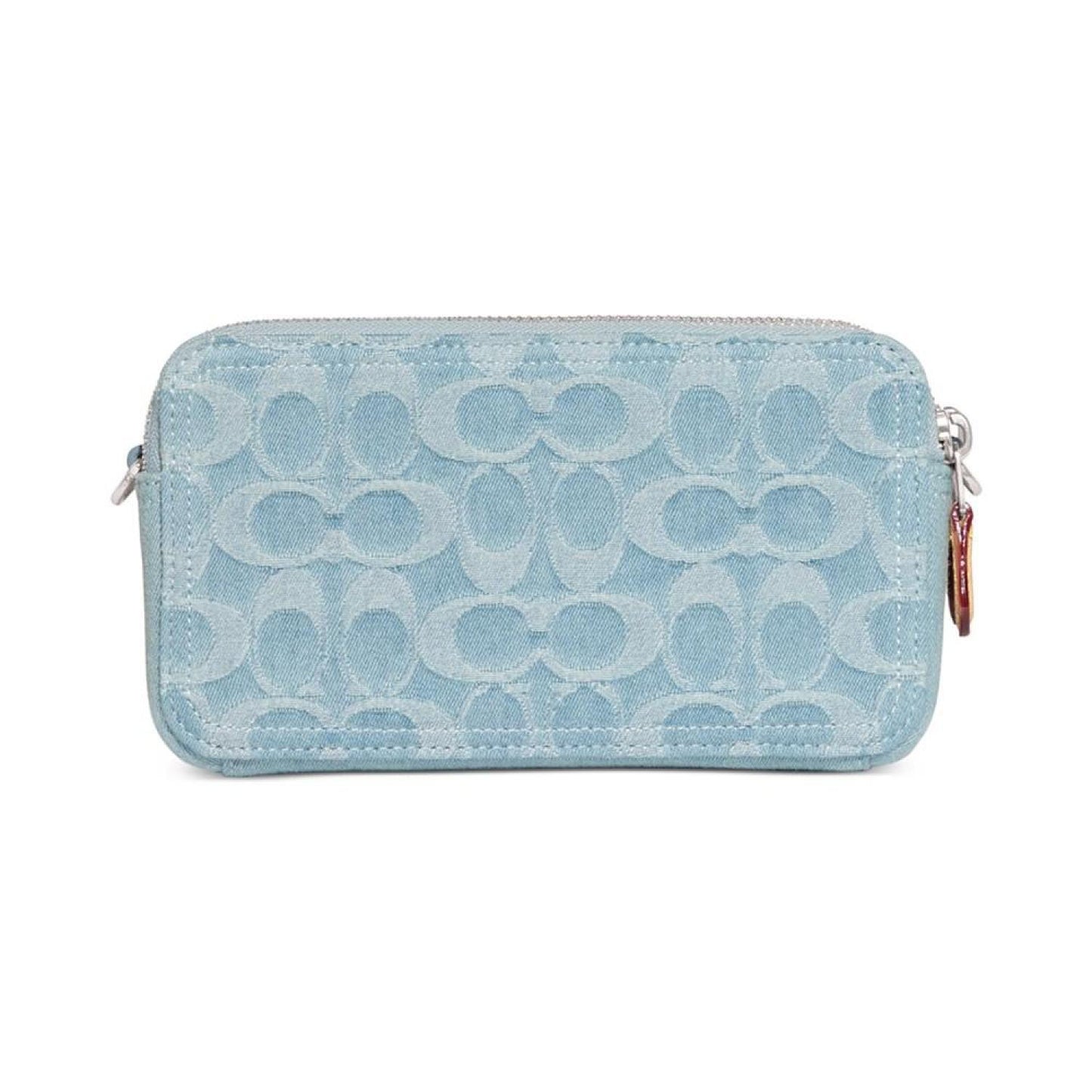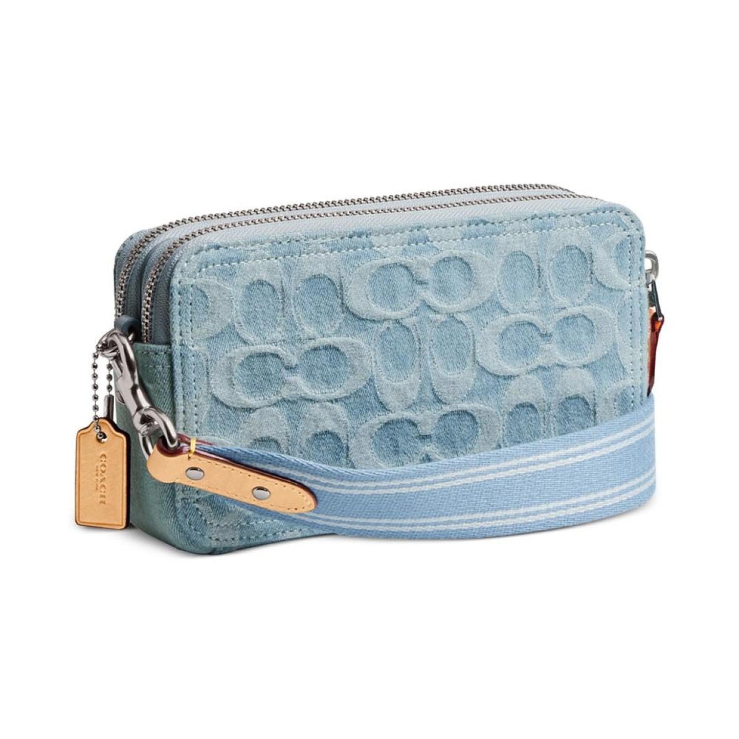 Perfectly compact with classic style, this Washed Denim Signature Kira Mini Crossbody by COACH elevates anything its paired with. Mini sized bag; 7-1/2"W x 4"H x 1-3/4"D (width is measured across the bottom of handbag); 0.74 lbs. approx. weight Silhouette is based off 5'9" model 7"L removable wrist strap; 21-1/2"L removable crossbody strap Double zip closure Silver-tone exterior hardware 4 interior card slots & fabric lining Bag converts from crossbody to clutch by removing strap Cotton, leather; lining: cotton Spot clean Imported