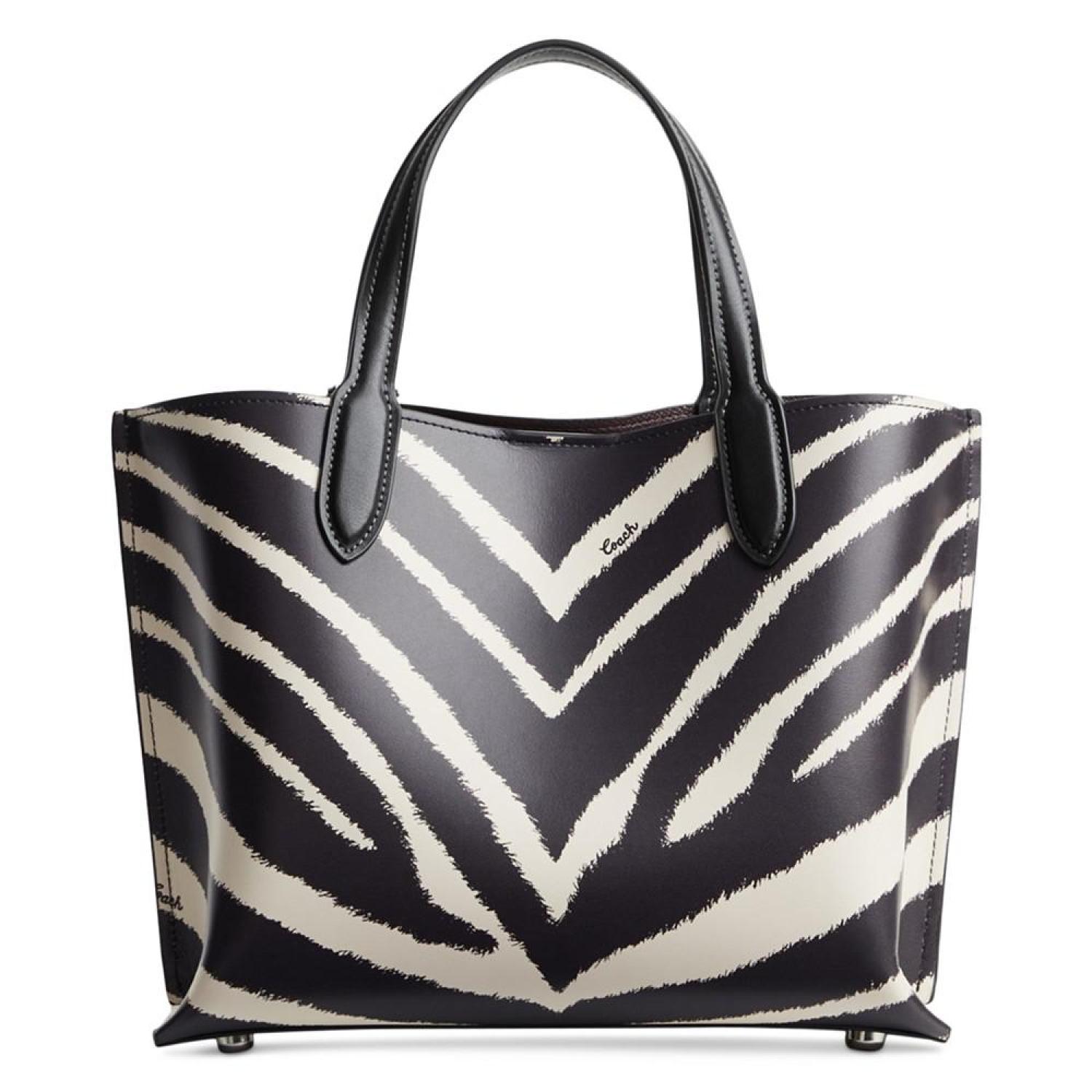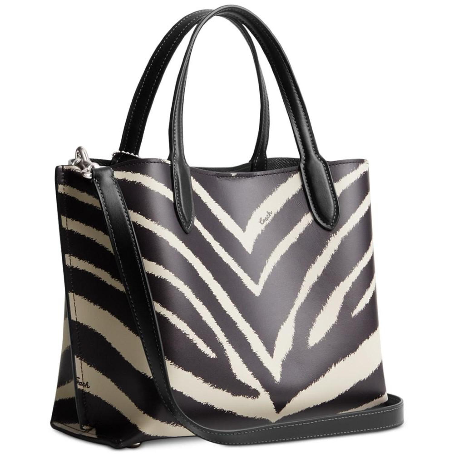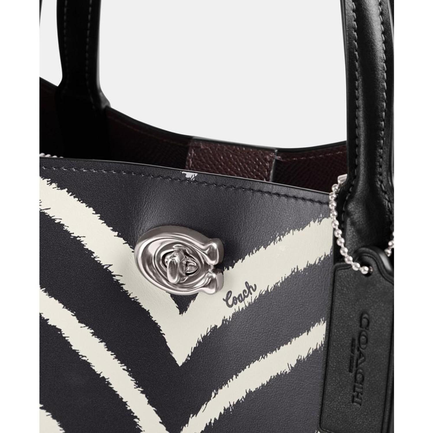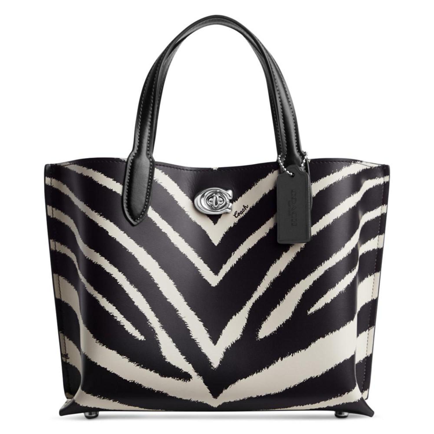 This zebra-print Willow 24 tote by COACH adds a pop of vibrancy to your look. Personalize your style with the detachable crossbody strap. Small sized bag; 9-1/2"W x 7-3/4"H x 4-1/4"D (width is measured across the bottom of handbag); 1.1 lbs. approx. weight Silhouette is based off 5'9" model 4-1/2" handles; 21-1/2" removable shoulder strap Turn-lock & magnetic snap closures Silver-tone hardware Interior center zip compartment Footed bottom Dust bag included Leather Spot clean Imported