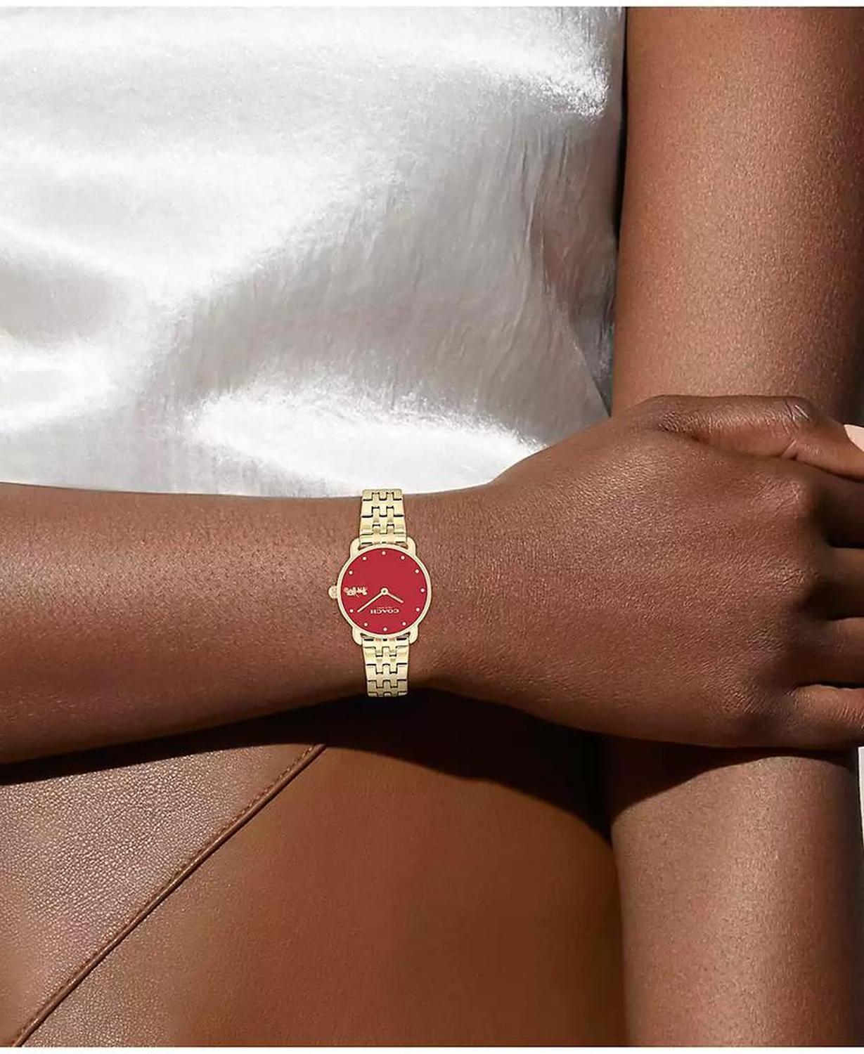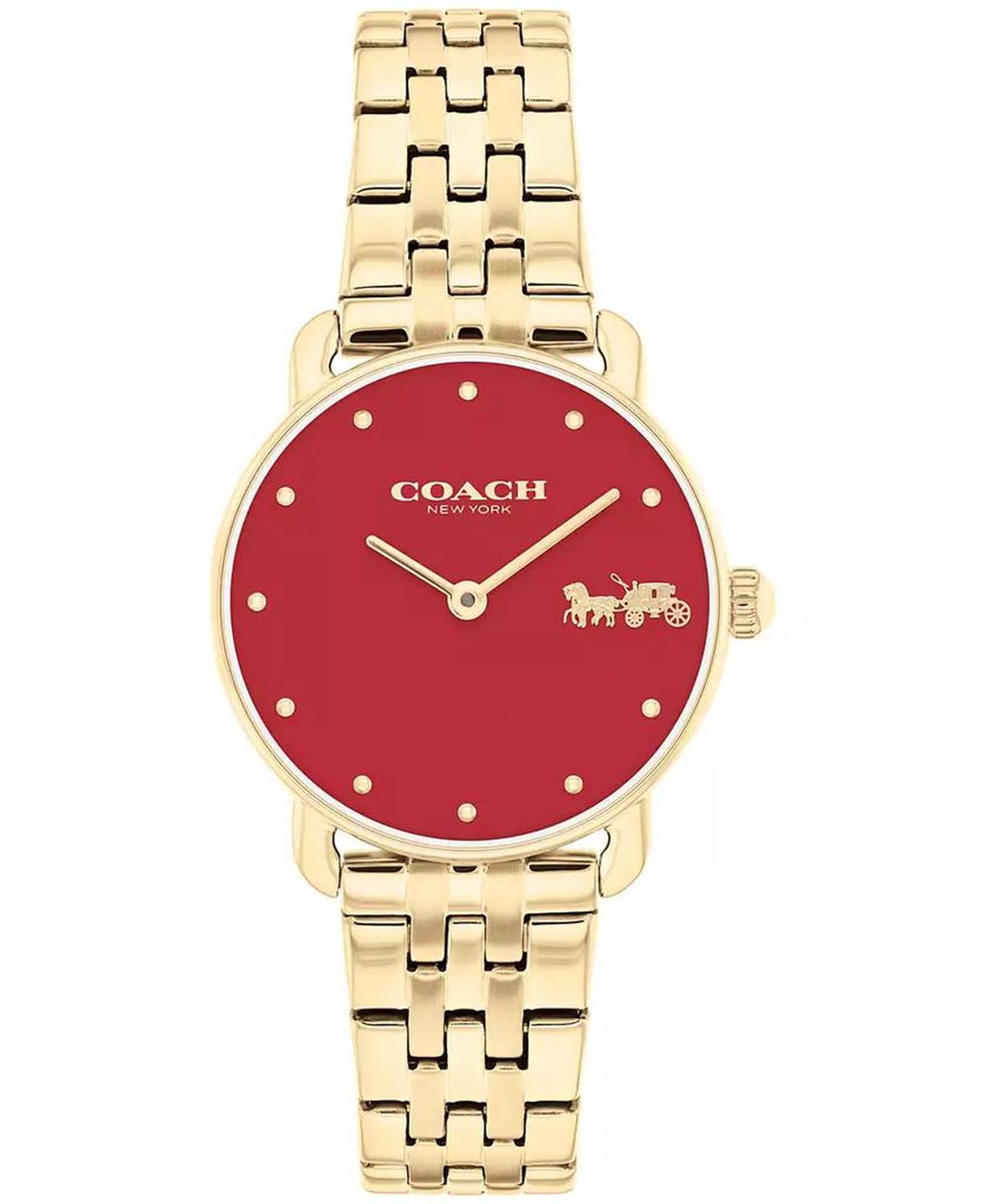 • With clean lines and a modern minimalist sensibility, the Elliot is a true design classic ready for workdays and weekends. This gold tone bracelet watch features a rose red dial detailed with dome markers and the iconic Coach Horse and Carriage motif at 3 o'clock for a heritage touch. SKU 14504445