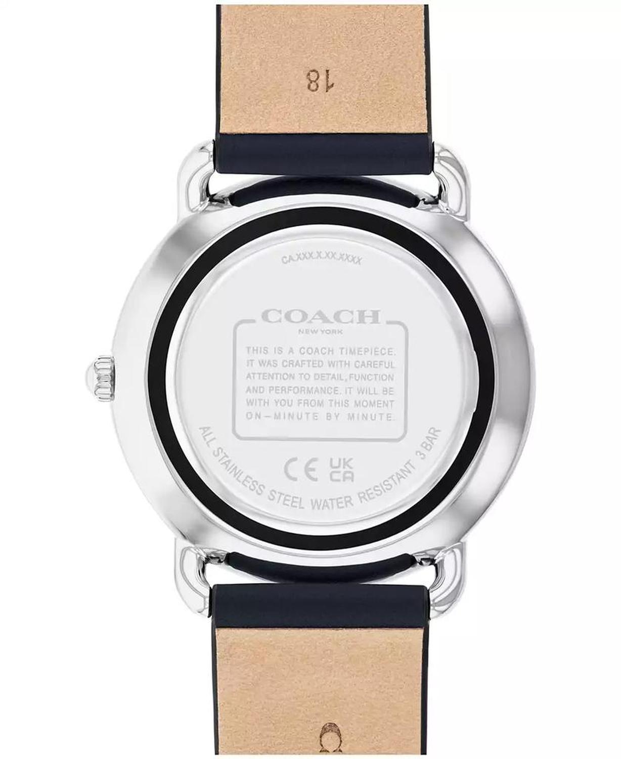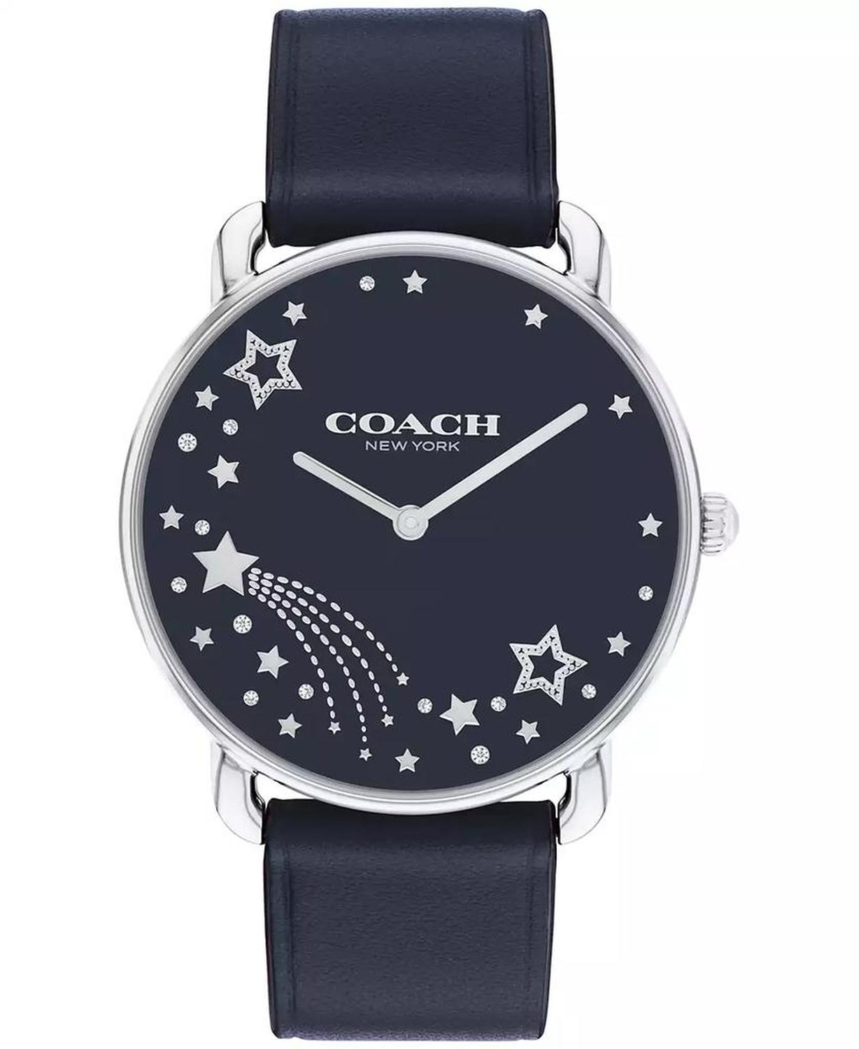 With clean lines and a modern minimalist sensibility, the Elliot is a true design classic ready for workdays and weekends. Finished with a navy leather strap, the stainless-steel round timepiece features a navy lacquer dial detailed with polished dome markers and a radiant shooting star motif SKU 14504376 Movement: Quartz, Dial: Dark Navy Case: Round, Silver Stainless Steel, 36mm Strap: Navy Leather Strap with Tongue Buckle Water Resistance: up to 30 Meters Warranty: 2 Year Limited Watch Comes in a Box Spot clean Imported